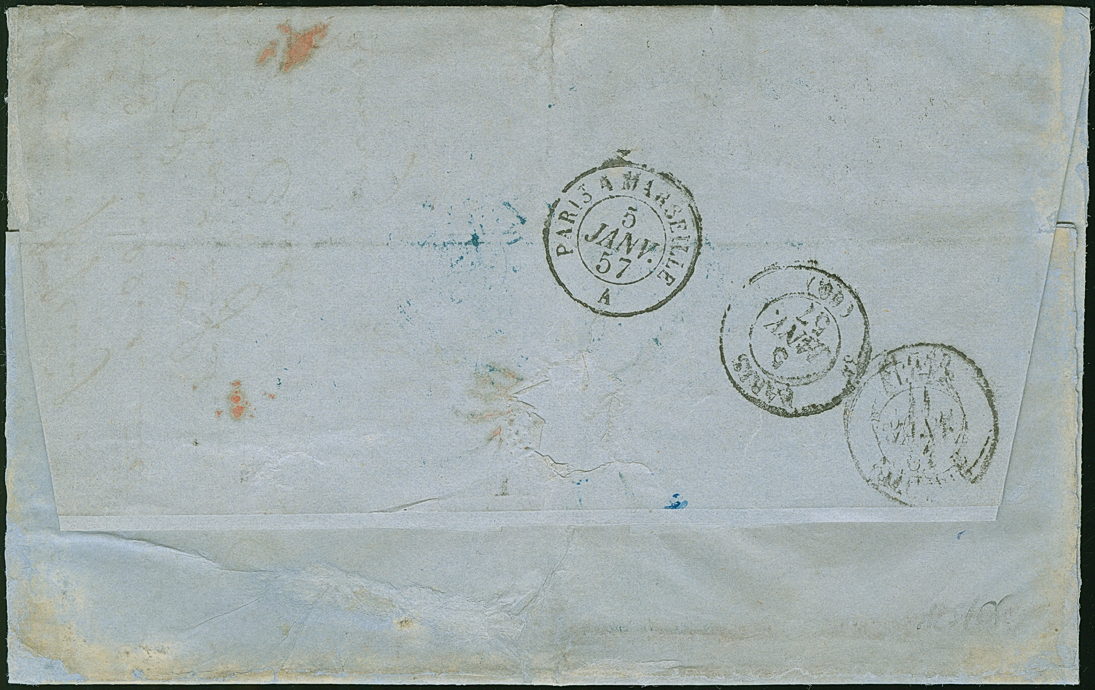3 Ngr. auf gelb, 2 Einzelwerte aus unterschiedlichen Auflagen, mit 2 Ngr. auf blau, bis auf winzige Stelle alle voll- bis breitrandig, mit Nr. "2" und nebengesetztem Doppelkreisstempel "LEIPZIG 3 I 57" auf komplettem, portogerecht frankiertem Faltbrief über Preußen und Marseille nach Algier, Algerien. Die Frankatur war gelöst, einige Alters- bzw. Lagerungsspuren bereinigt. Eine außerordentlich seltene Destination; PROFI hat nur 2 weitere Briefe von Sachsen nach Algerien registriert.
