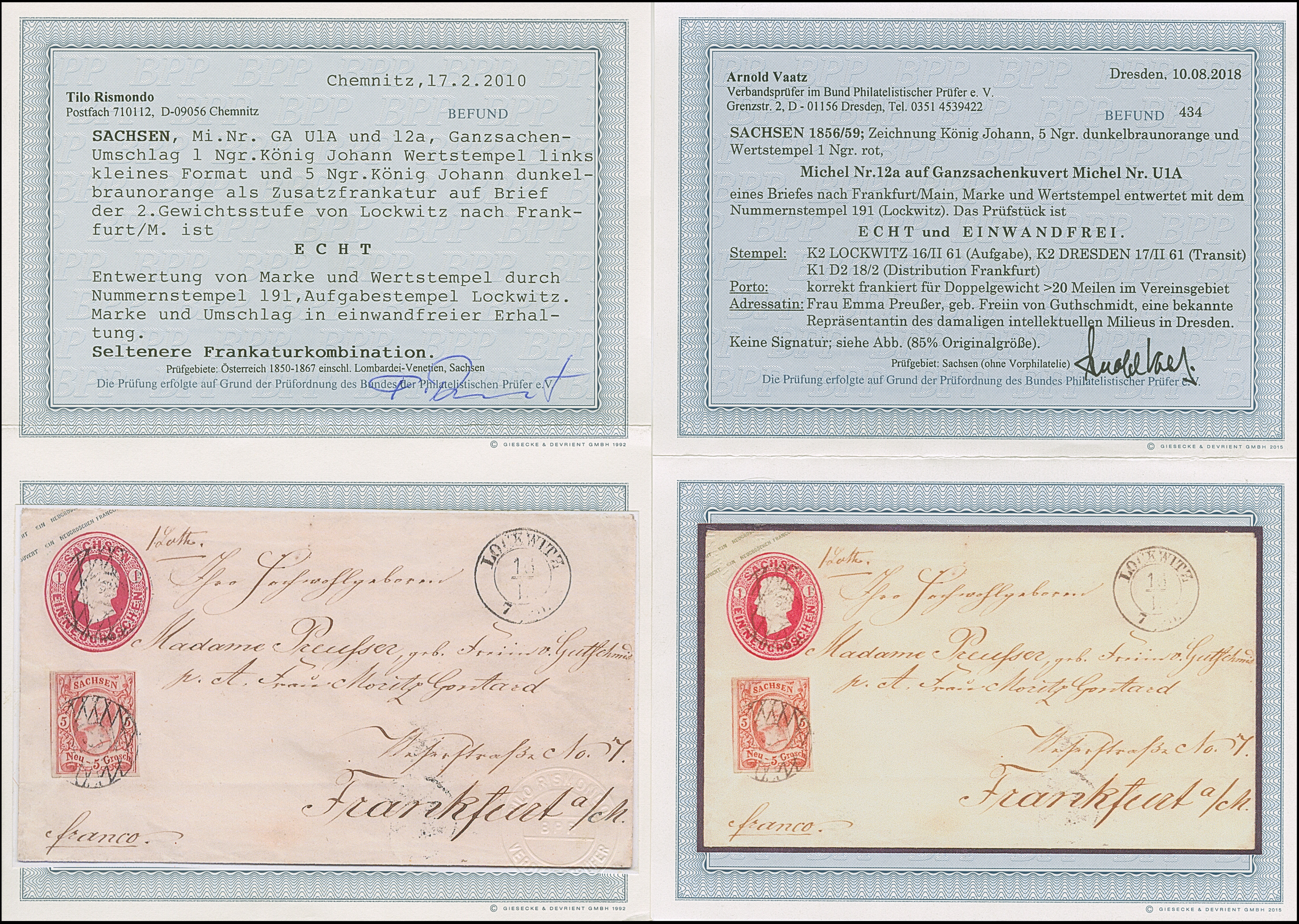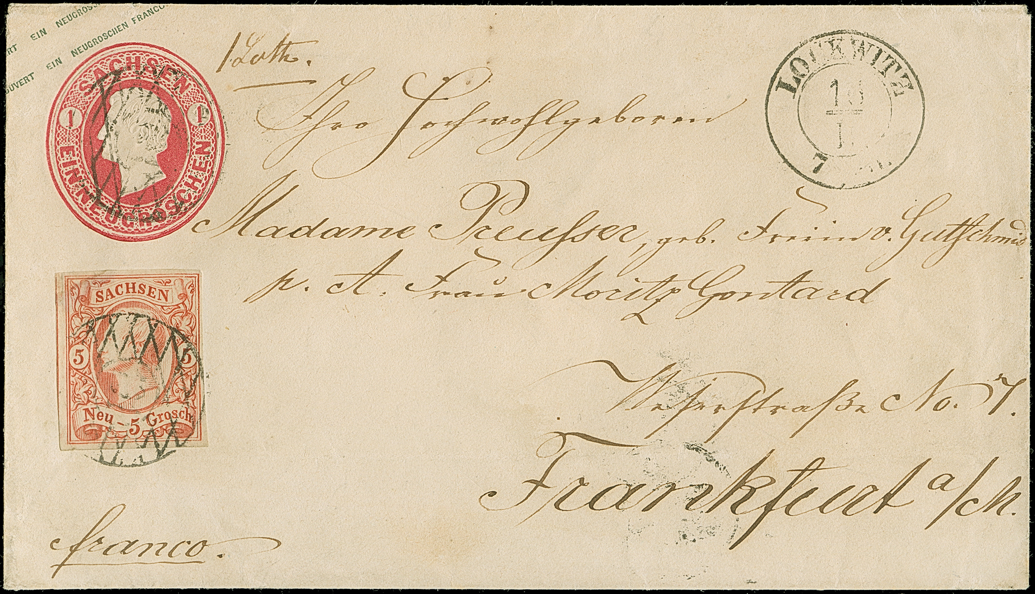 5 Ngr. ziegelrot, voll- bis breitrandig, als Zufrankatur auf Ganzsachenumschlag 1 Ngr. rot, beide Wertzeichen mit Nr. "2", mit nebengesetztem Doppelkreisstempel "LOCKWITZ 16/II 61" nach Frankfurt am Main. Das Kuvert außerhalb der Frankatur leichte waagerechte Faltung, sonst einwandfrei. Eine einmalige Frankatur Kombination; es sind nur 2 weitere Ganzsachen mit Zufrankatur einer 5 Ngr.-Marke registriert. Fotobefunde Rismondo BPP (2010) und Vaatz BPP (2018)