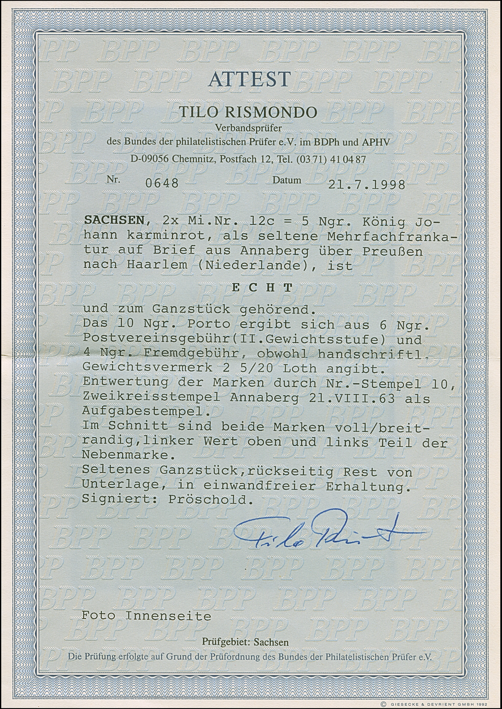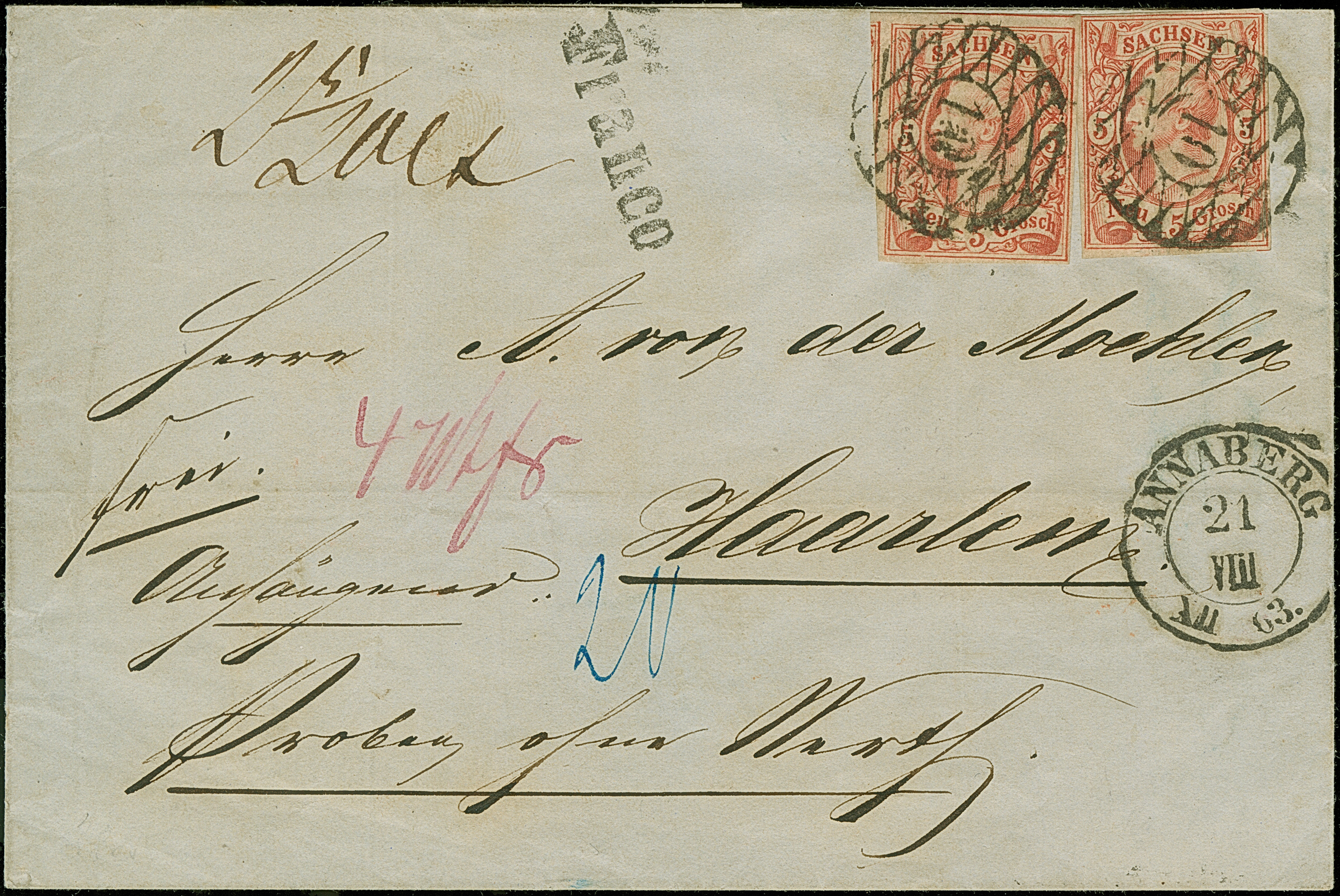 5 Ngr. karminrot auf glasigem Papier, 2 Einzelwerte, beide voll- bis breitrandig und farbfrisch mit jeweils sauber aufgesetzter Nr. "10" und nebengesetztem Doppelkreisstempel "ANNABERG 21 VIII 63" auf Briefhülle mit Vermerk "Anhängend Proben ohne Wert", nach Haarlem, Niederlande. Das Porto setzt sich zusammen aus der Postvereinsgebühr für Warenproben (je 2 Loth) von 6 Ngr. und dem holländische Portoanteil von 2 Ngr. je 30 g, hier entsprechend mit "4 Wfr." Vermerkt. Eine attraktive und sehr seltene Mehrfachfrankatur und einzige registrierte Mustersendung von Sachsen in die Niederlande. Fotoattest Rismondo BPP (1998)