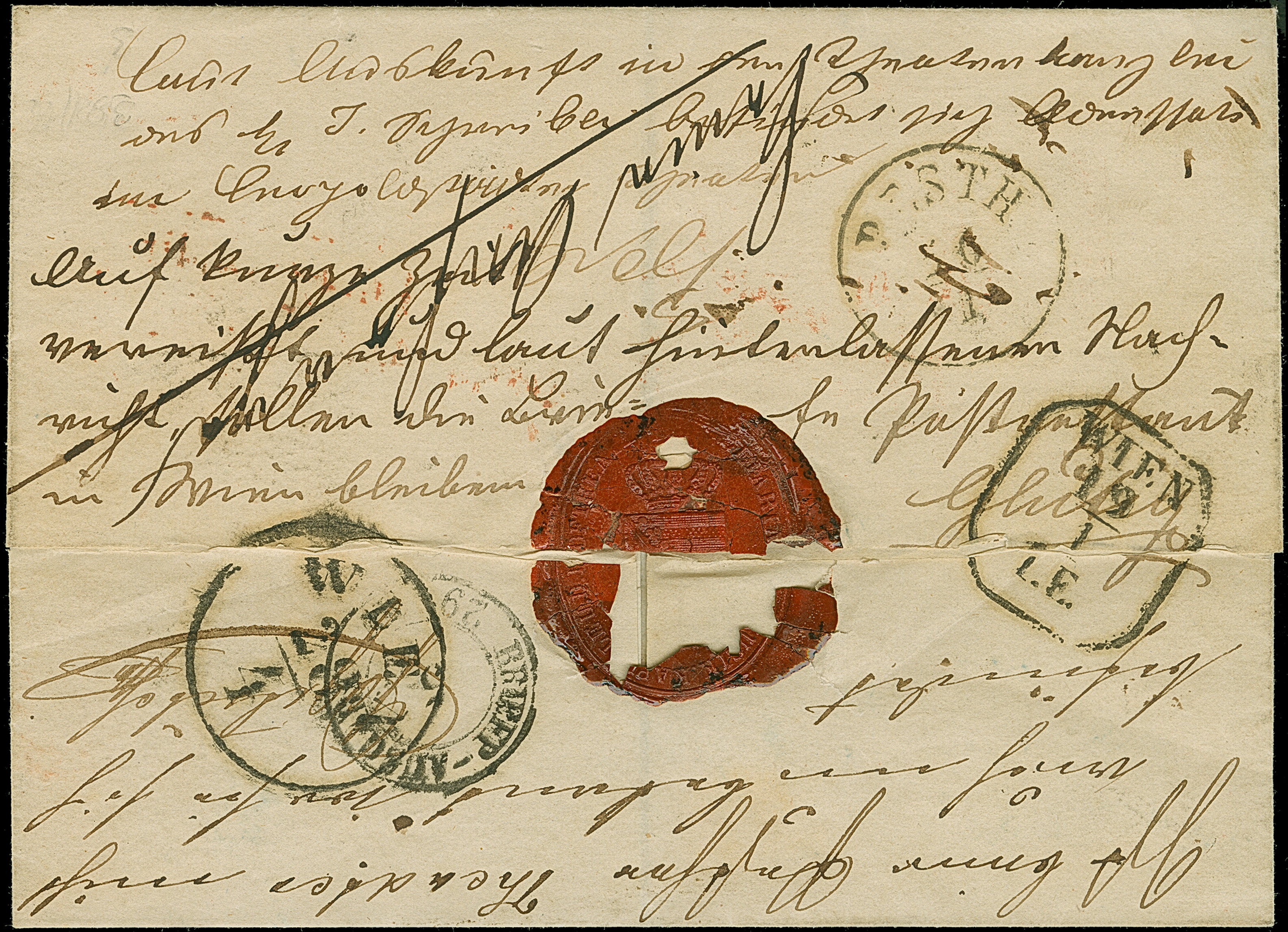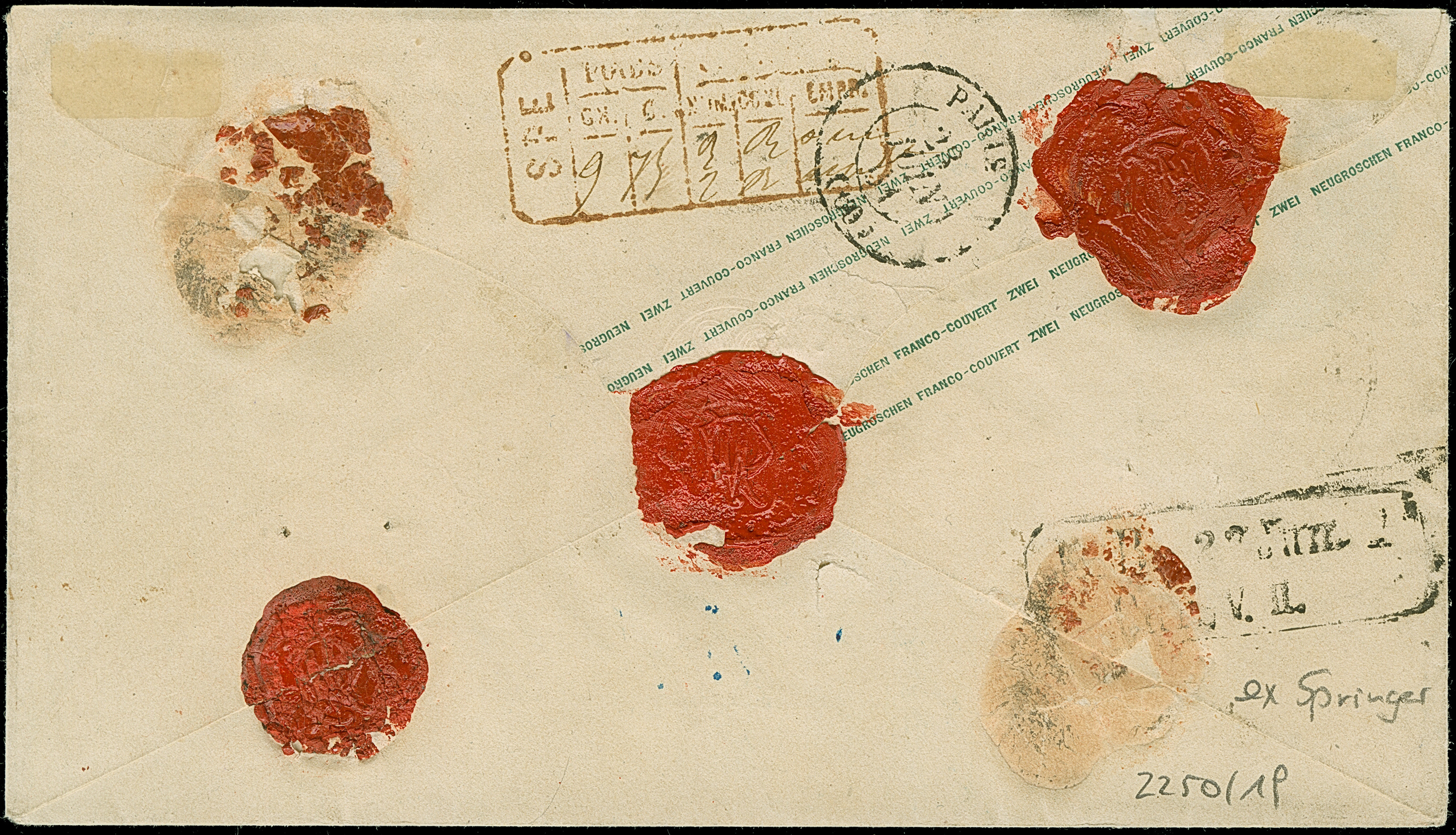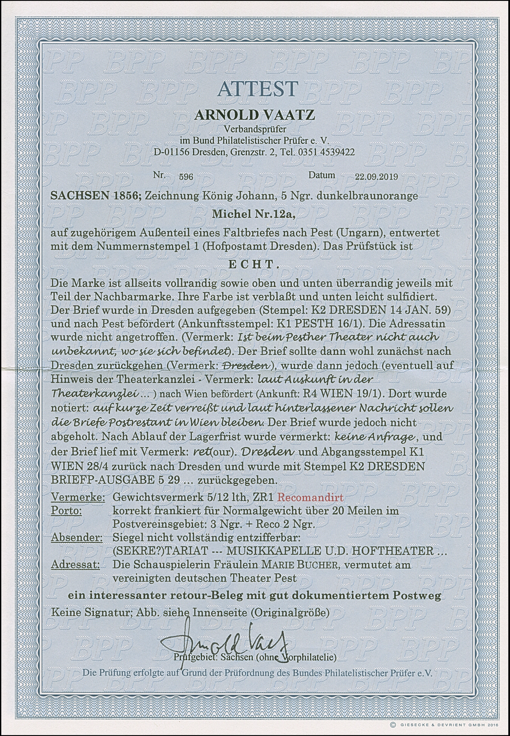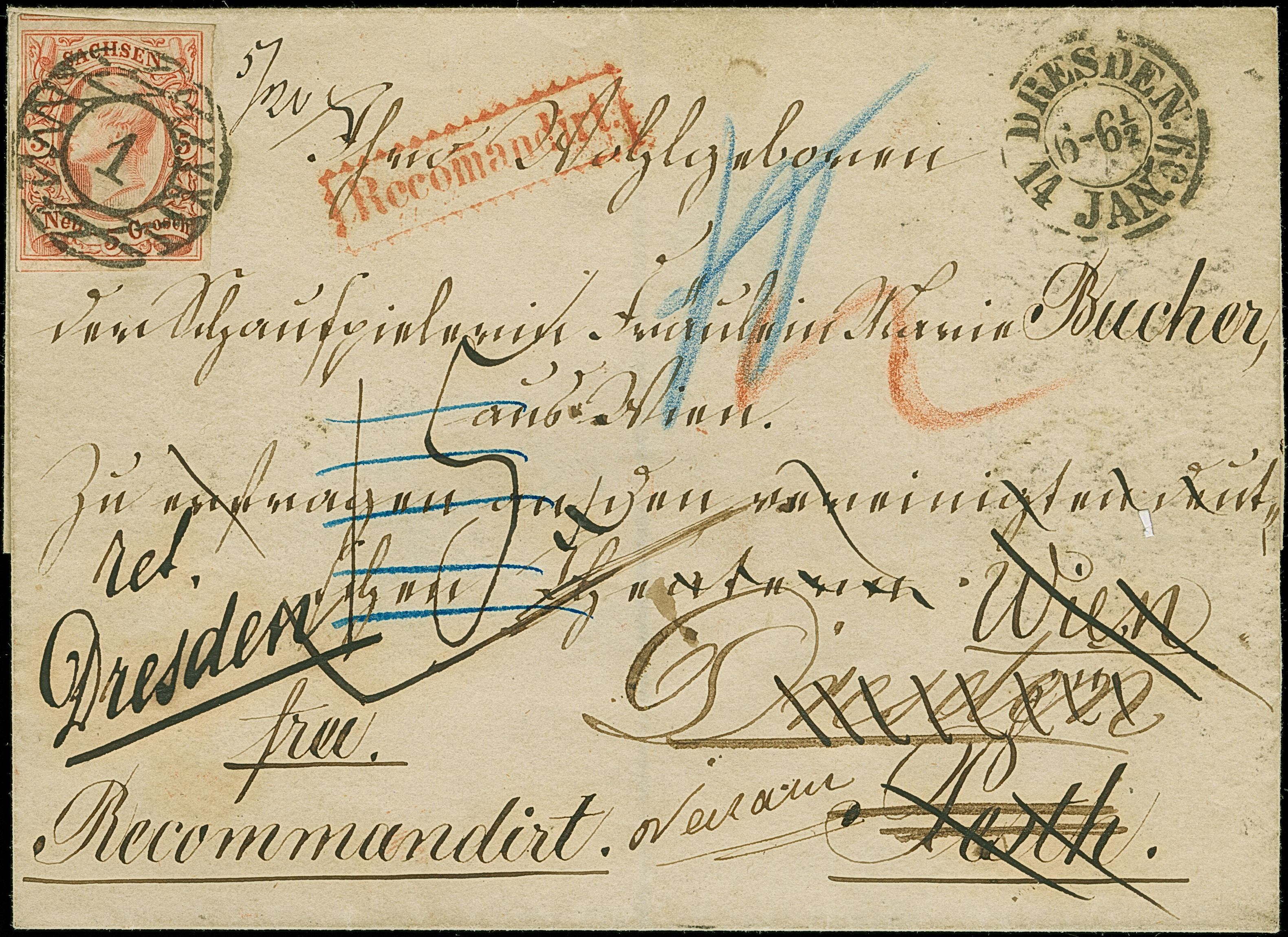 5 Ngr. ziegelrot, voll- bis überrandig, wie üblich etwas sulfidiert, mit zentrisch klarer Nr. "1" und nebengesetztem Doppelkreisstempel "DRESDEN 14 JAN 59" auf recommandirter Briefhülle an eine Schauspielerin Maria Bucher aus Wien, nach Pesth, nachgesandt nach Wien und schließlich zurückgesandt nach Dresden, rückseitig mit diversen Durchgangsstempeln und Hinweisen. Zunächst taxierte "15" Neukreuzer wieder gestrichen. Ein interessantes Stück in schöner Erhaltung. Fotoattest Vaatz BPP (2019)