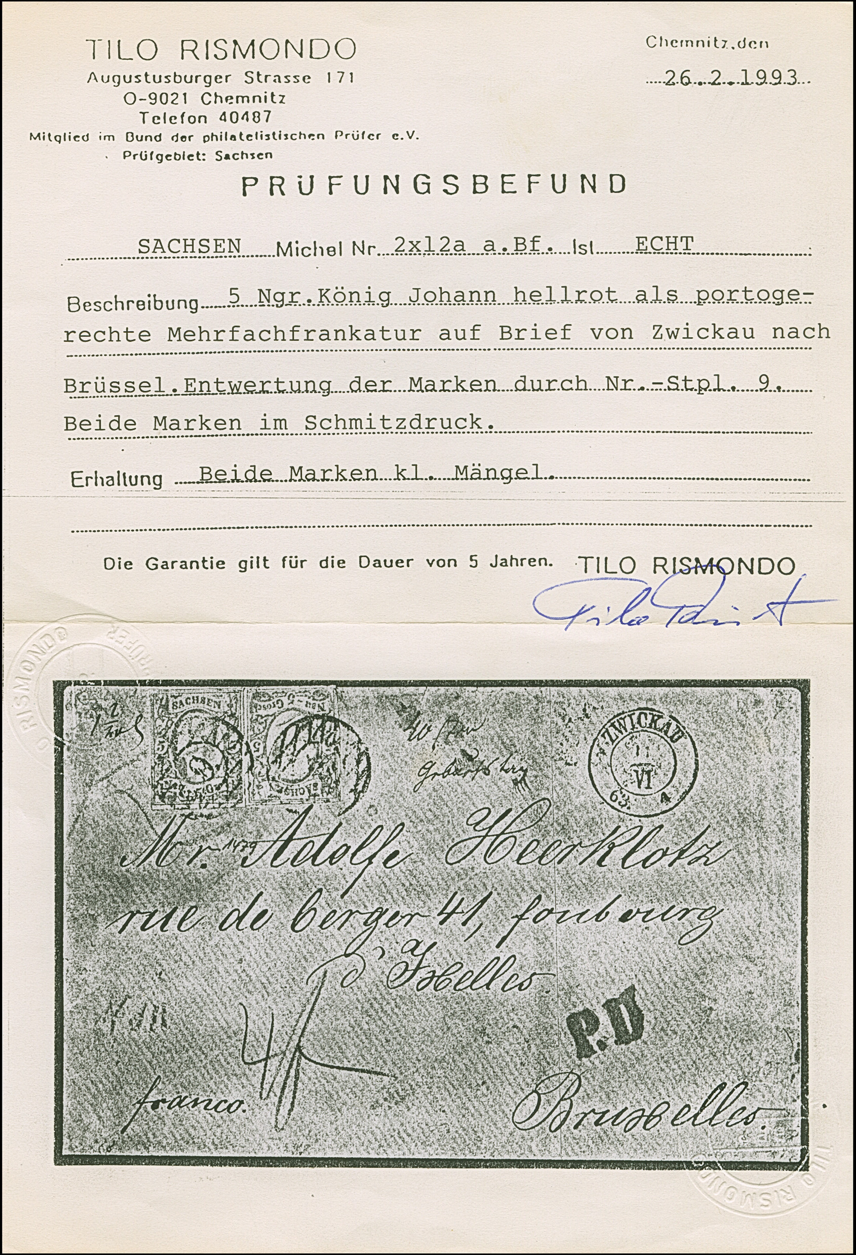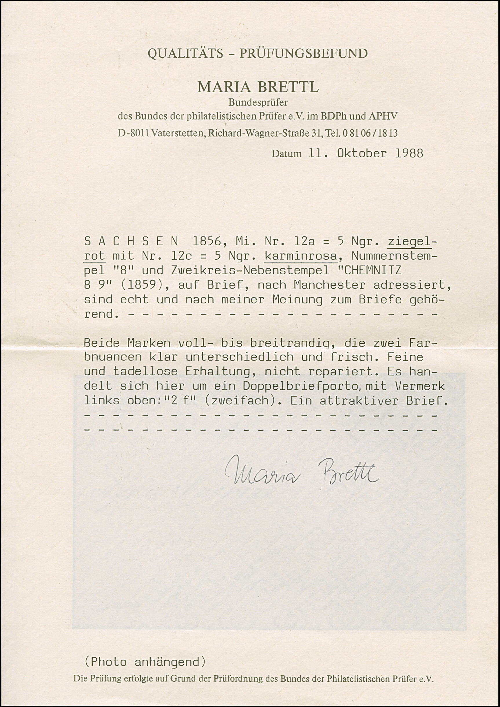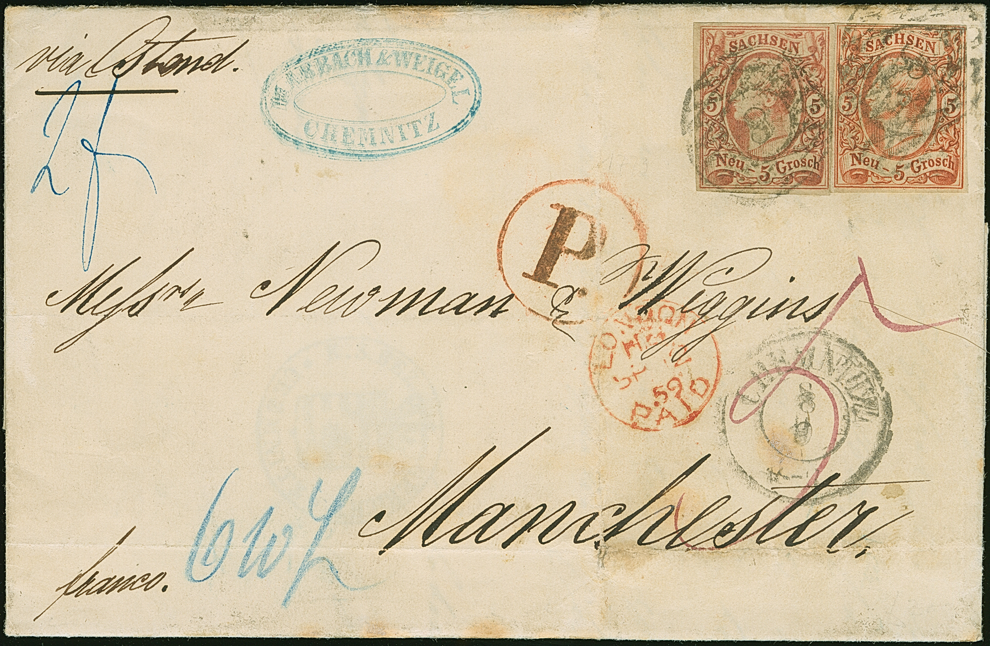 5 Ngr. ziegelrot, zusammen mit 5 Ngr. karminrosa auf glasigem Papier, beide voll- bis breitrandig, mit Nr. "8" und nebengesetztem Doppelkreisstempel "CHEMNITZ 8/9 59" auf komplettem Faltbrief der 2. Gewichtsstufe (Vollmacht auf Fiskalpapier) über Preußen und Belgien, nach Manchester. Einwandfrei. Mehrfachfrankaturen der 5 Ngr. sind äußerst selten; PROFI hat keine weitere nach Großbritannien und keine weitere mit einer Kombination von 2 verschiedenen Farben registriert. Qualität-Prüfungsbefund Maria Brettl (1988)