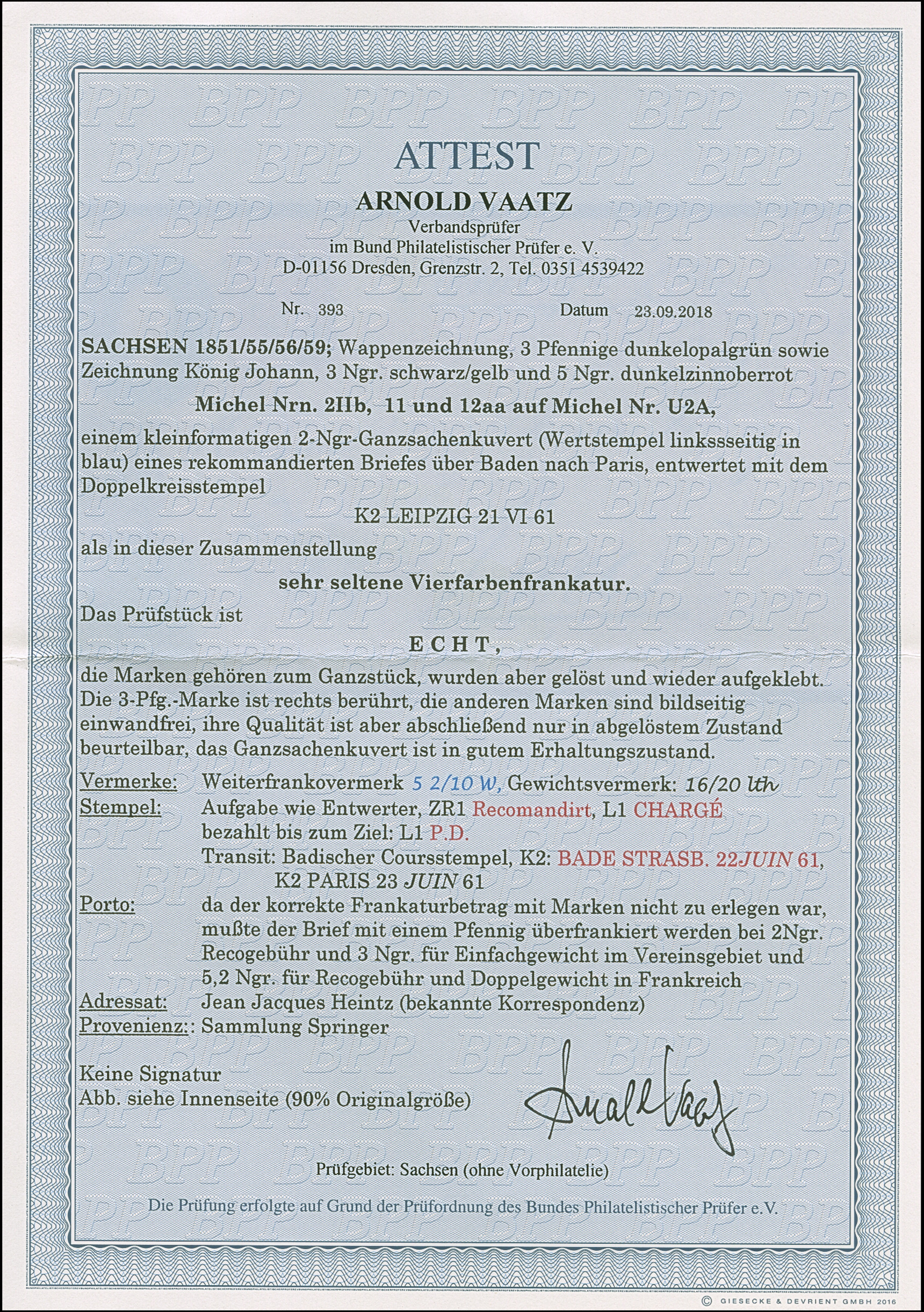 5 Neugroschen bräunlichrot, 3 Neugroschen auf gelb und 1851/63, Wappen 3 Pfennige grün, Letztere kurz gering berührt, sonst alle voll- bis breitrandig, als Zufrankatur auf Ganzsachenumschlag 2 Neugroschen blau, als Chargé-Brief der 2. französischen Gewichtsstufe von "LEIPZIG 21 VI 61" nach Paris, mit Transit- und Ankunftsstempeln. Die Frankatur war gelöst und zwei kleine Fehlstellen im Kuvert hinterlegt. Eine seltene und äußerst attraktive 4 Farben-Frankatur. Fotoattest Vaatz BPP (2018)