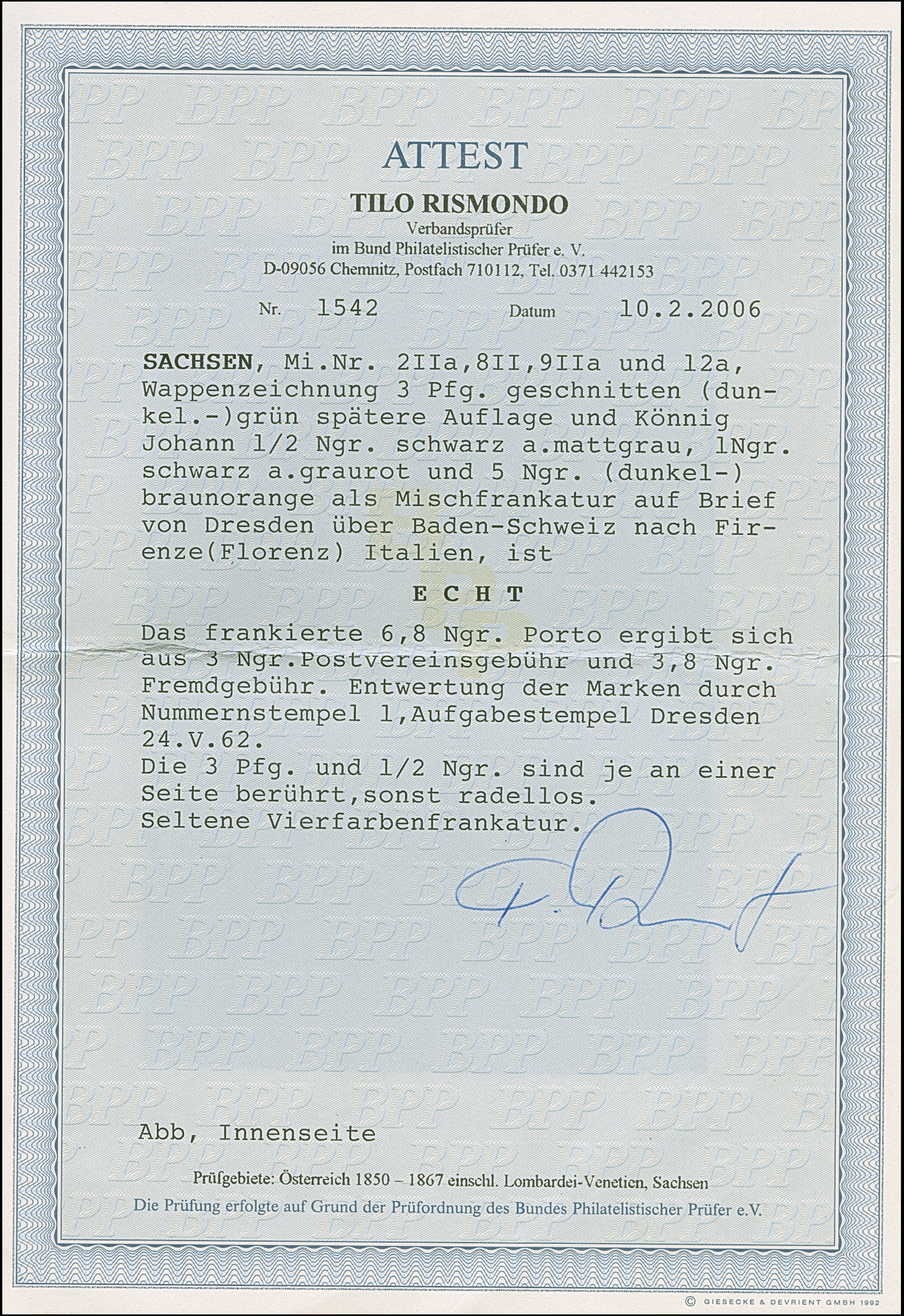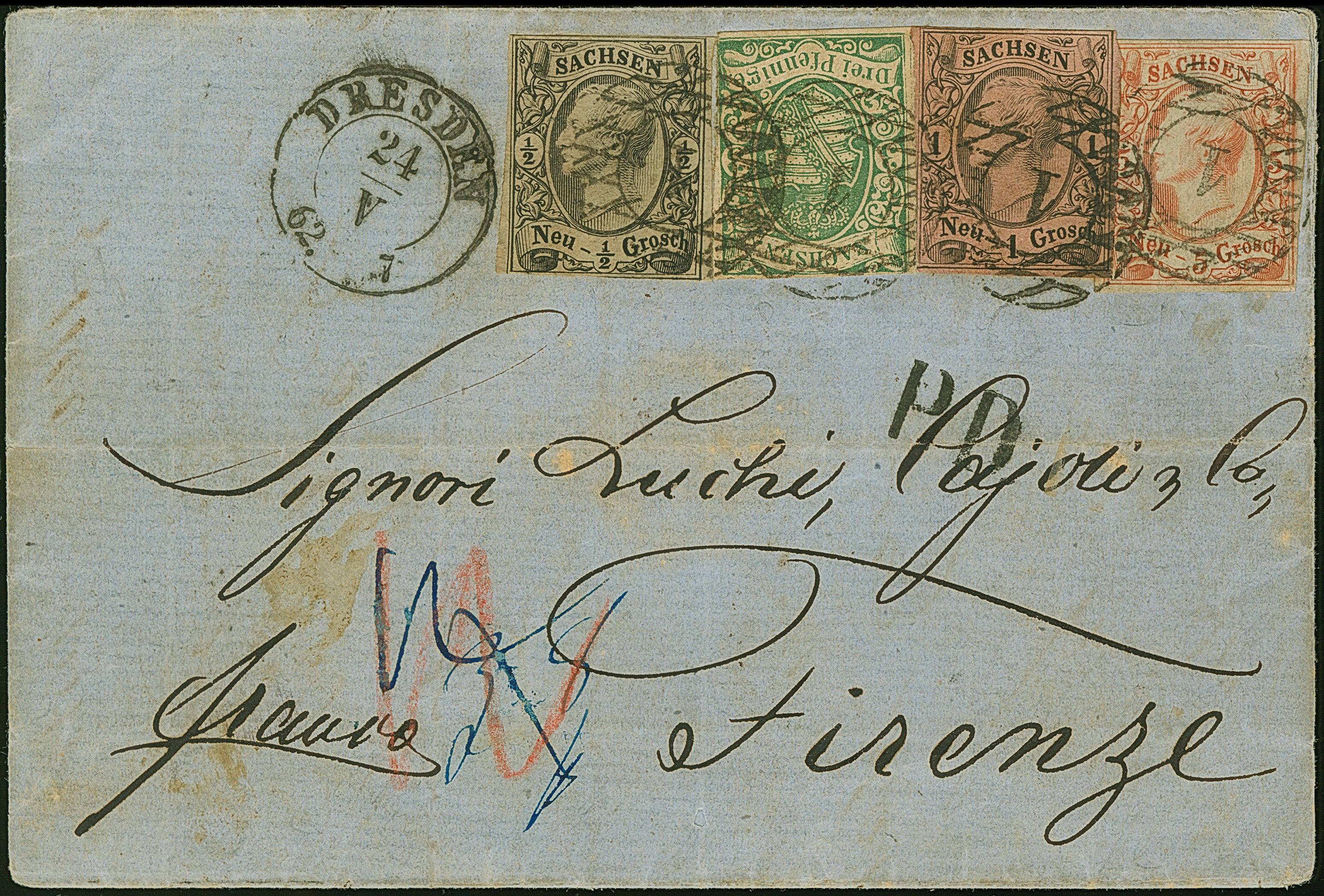 5 Ngr. ziegelrot, voll- bis breitrandig, zusammen mit 1 Ngr. auf mattgraurot, ½ Ngr. auf grau und 1851/63, 3 Pfg. grün (letztere beide etwas berührt), mit Nr. "1" und sauber nebengesetztem Doppelkreisstempel "DRESDEN 24/V 62" auf Briefhülle nach Florenz. Das Porto setzt sich zusammen aus 3 Ngr. Vereinsgebühr, 2 Ngr. Schweizer Transit und 1 8/10 Ngr. italienisches Porto. Leichte Patina, sonst einwandfrei. Eine attraktive und sehr seltene 4 Farben-Frankatur. Fotoattest Rismondo BPP (2006)