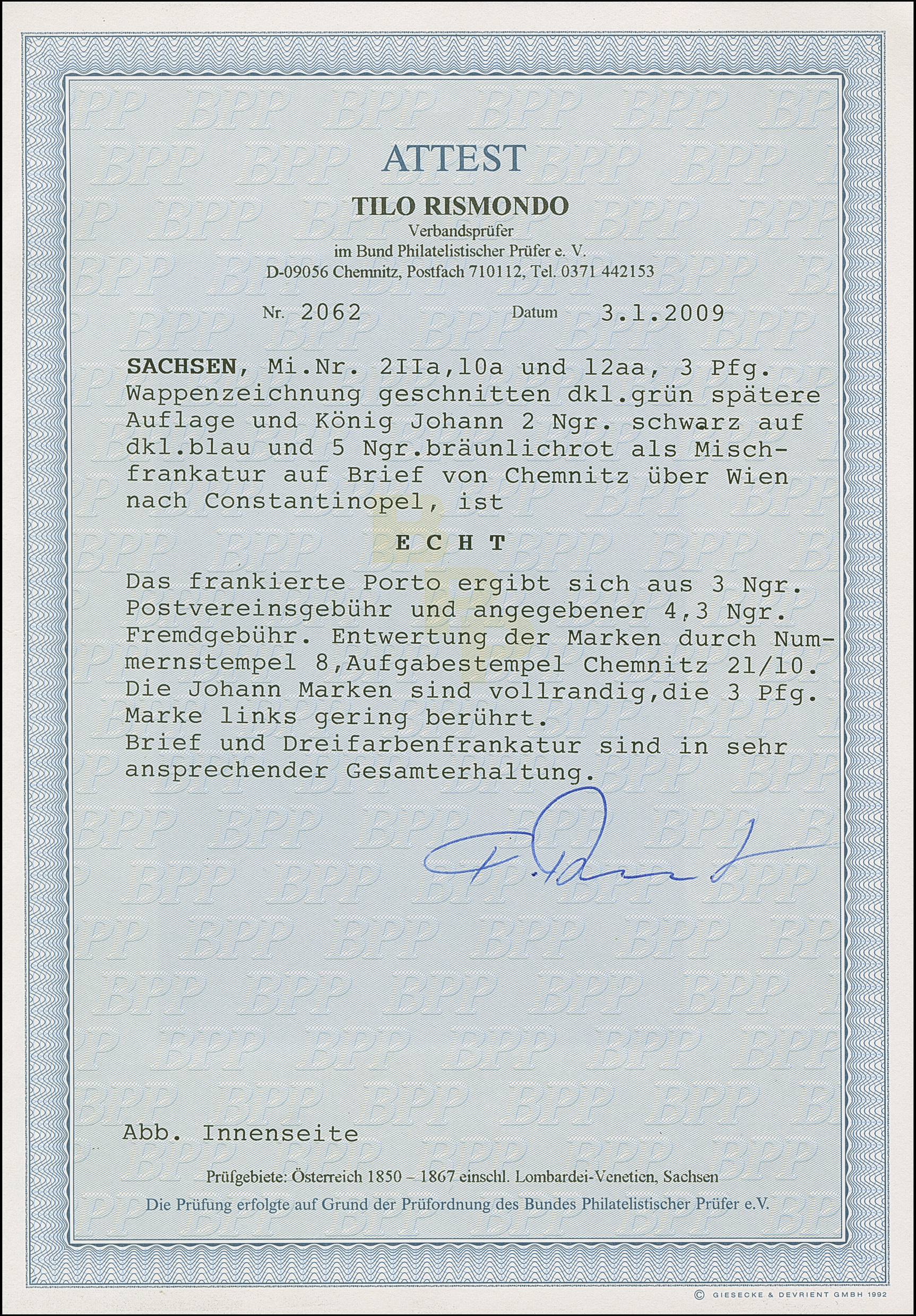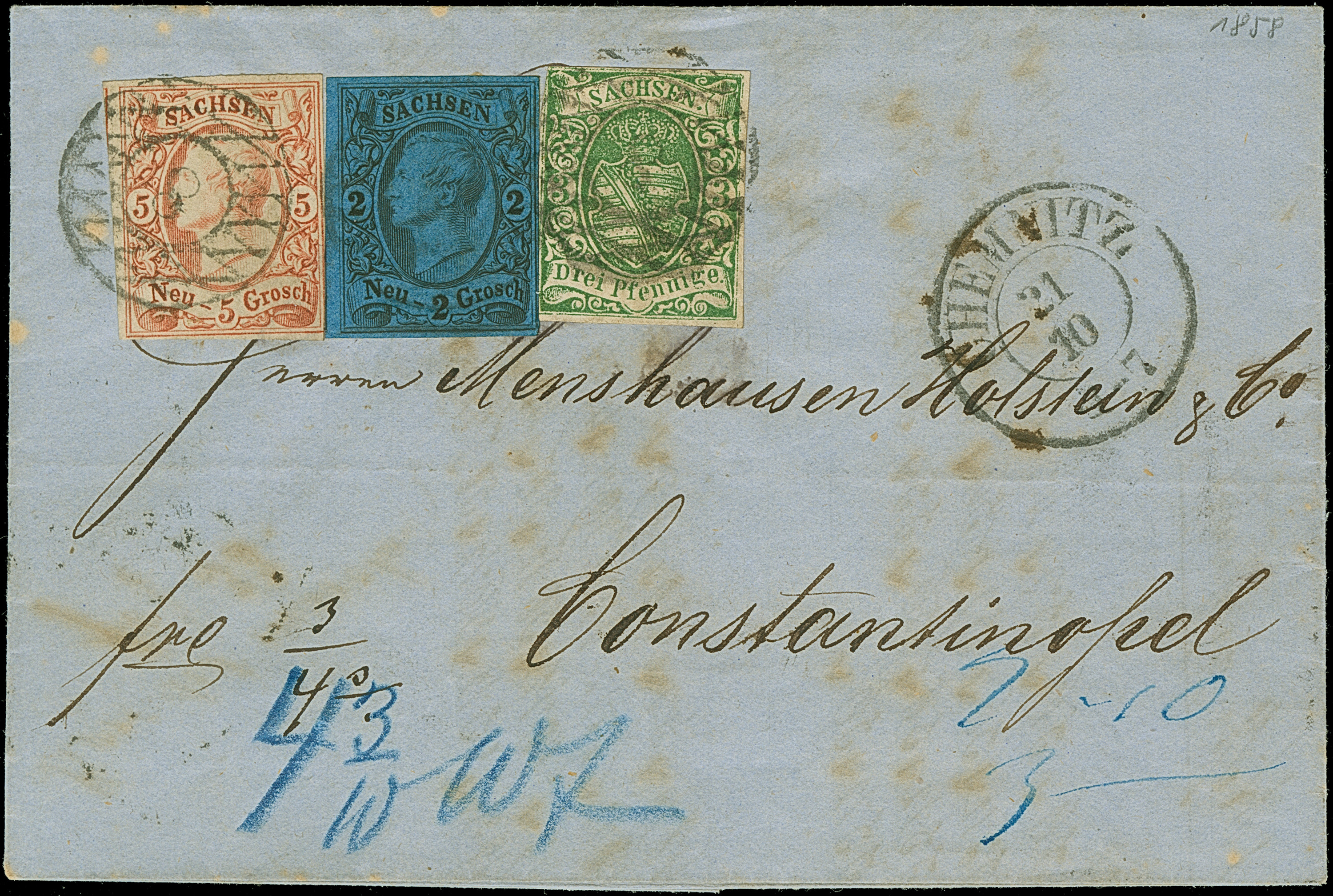 5 Ngr. ziegelrot, 2 Ngr. auf blau und 1851/63, Wappen 3 Pfennig grün, letztere minimal berührt, mit Nr. "8" und sauber nebengesetztem Doppelkreisstempel "CHEMNITZ 21 10" (1858) auf komplettem Faltbrief über Wien nach Konstantinopel, mit Ankunftsstempel des österreichischen Postamtes. Ein attraktiver und äußerst seltener Brief in sehr schöner Erhaltung; es sind nur noch 2 weitere Briefe in die Türkei vor der Währungsreform im November 1858 registriert.