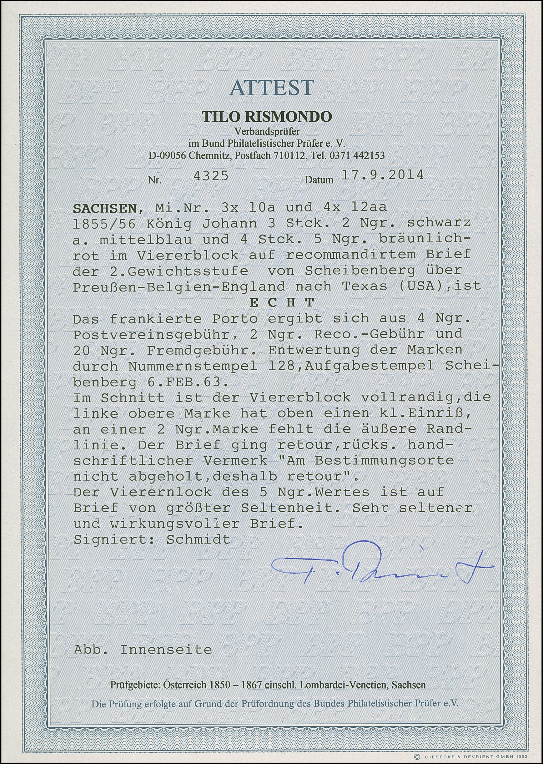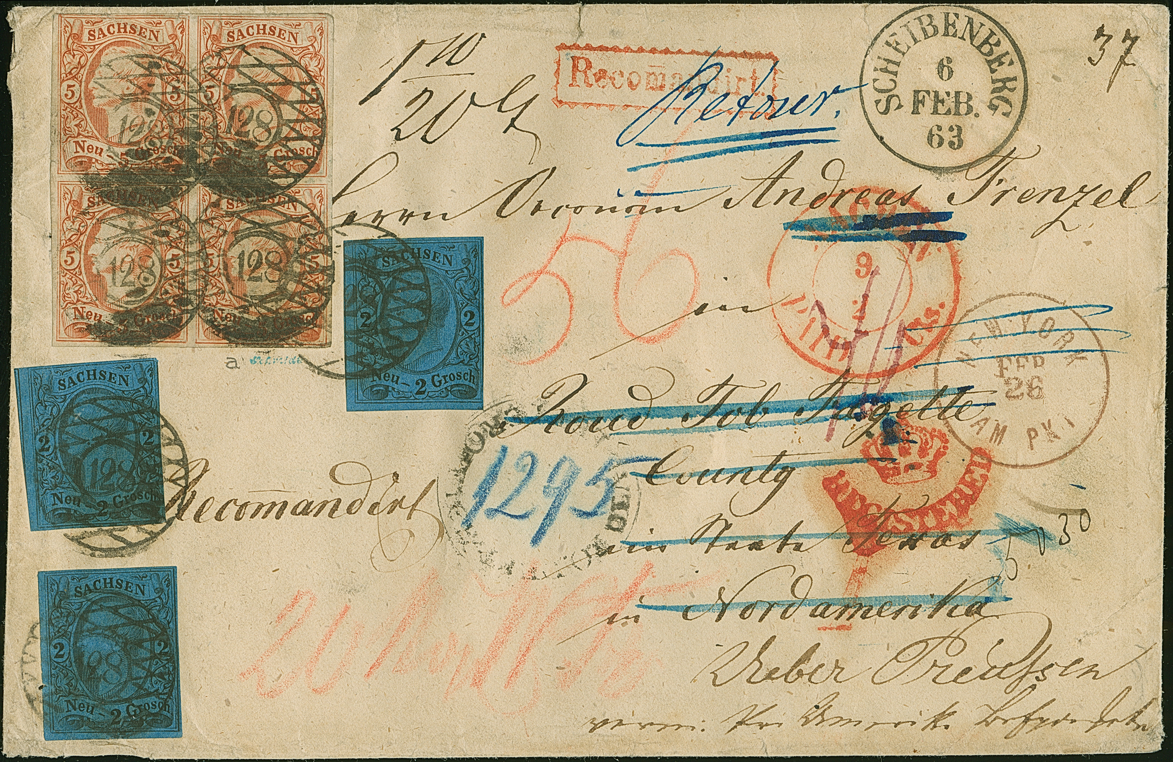 5 Ngr. bräunlichrot im 4er-Block, farbfrisch und noch voll- bis breitrandig, mit 3 Einzelwerten 2 Ngr. auf blau in meist gutem Schnitt, mit Nr. "128" und nebengesetztem Einkreisstempel "SCHEIBENBERG 6 FEB. 63" auf recommandirtem Briefkuvert der 2. Gewichtsstufe über die 'Prussian closed mail' nach Round Top, Fayette County, Texas. Der Brief war nicht zustellbar (vorderseitig unklarer dead-letter-office-Stempel) und nach Sachsen retourniert, mit entsprechendem handschriftlichem Vermerk. Die linke obere Marke des Viererblocks kleiner Randspalt, sonst bis auf übliche leichte Beförderungspuren in sehr schöner Erhaltung. Ein Brief von größter Seltenheit; größte registrierte gebrauchte Einheit der 5 Ngr. und auf Brief nur ein weiteres Mal registriert. Fotoattest Rismondo BPP (2014)