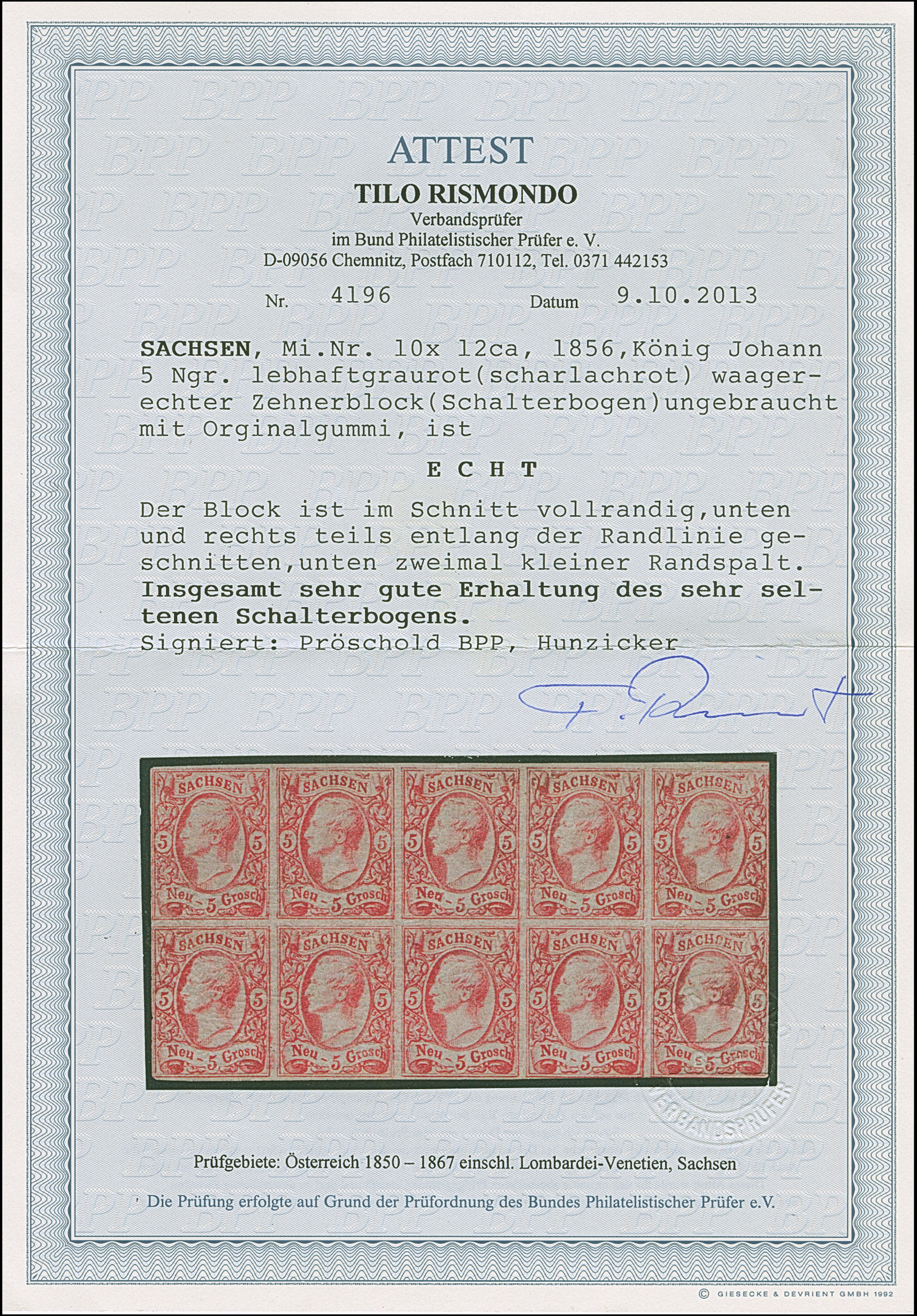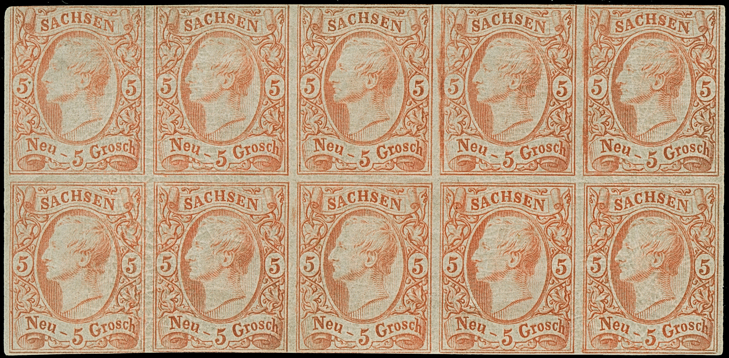 5 Ngr. scharlachrot, vollständiger Schalterbogen von 10 Marken, teils entlang der Randlinie geschnitten, unten 2 kleine Randspalte (einmal außerhalb des Markenbildes), ungebraucht mit Originalgummi. Eine seltene Einheit, nicht aus der Makulatur stammend. Fotoattest Rismondo BPP (2013)