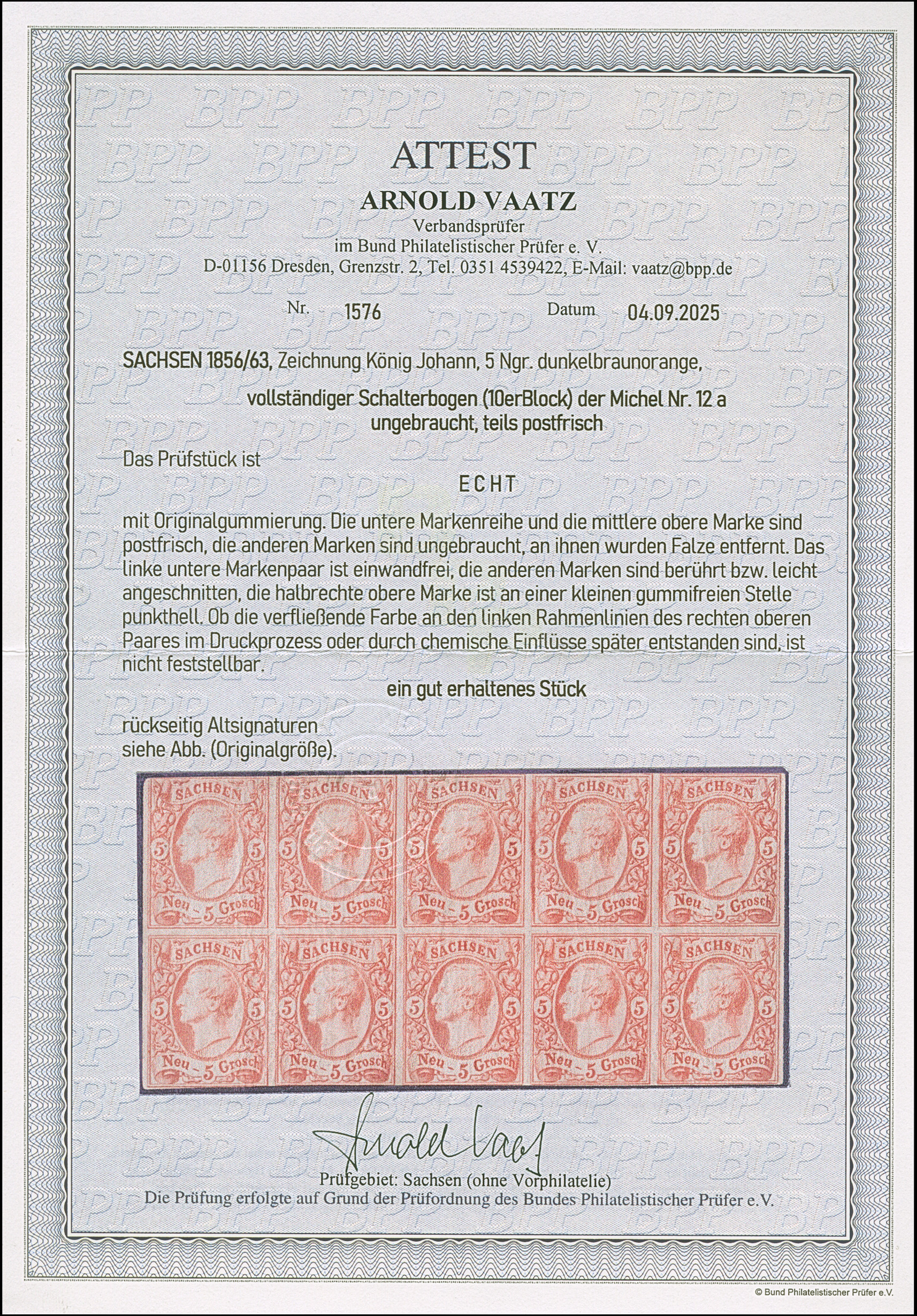 5 Ngr. ziegelrot (backsteinrote Nuance aus einer frühen Auflage), kompletter Schalterbogen von 10 Marken, berührt bis breitrandig, ungebraucht mit Originalgummi, die meisten Werte postfrisch. Ein Wert an einer kleinen gummifreien Stelle punkthell, sonst einwandfrei. Eine äußerst seltene Einheit; es sind nur 5 Schalterbogen der frühen Auflagen registriert. Private Signaturen, Fotoattest Vaatz BPP (2025)