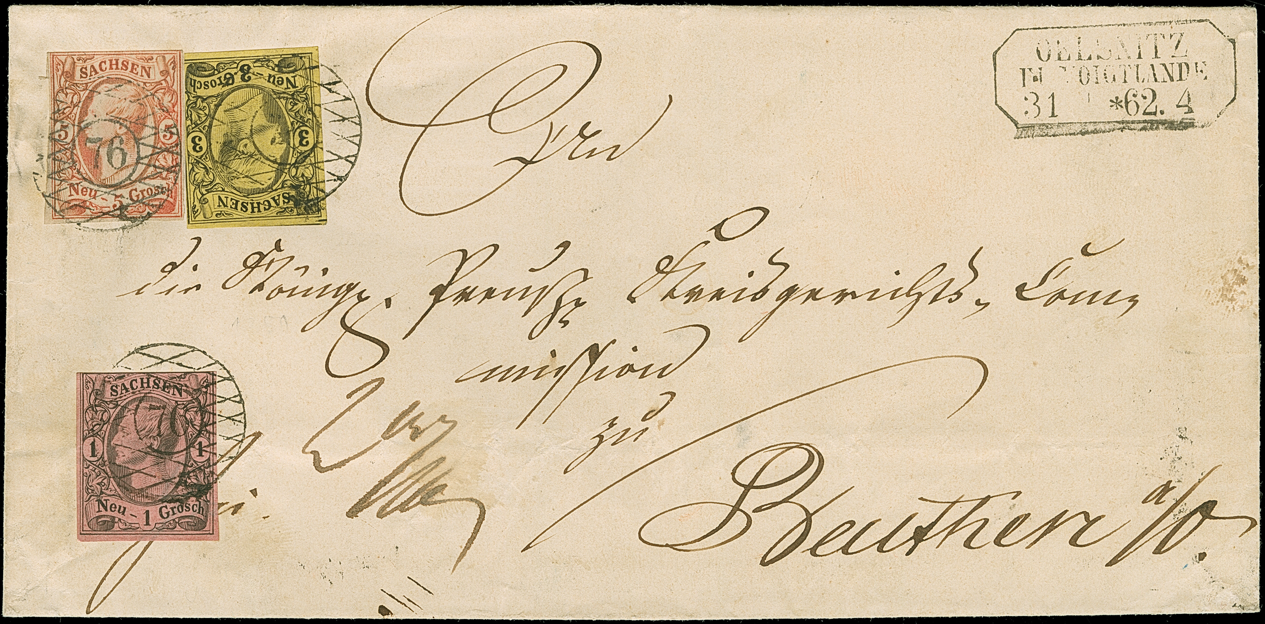 5 Ngr. rot, oben mit der Randlinie geschnitten und eventuell minimal tangiert, sonst voll- bis breitrandig, zusammen mit 1 Ngr. auf mattgraurot und 3 Ngr. auf gelb (beide einseitig berührt), mit jeweils sauber aufgesetzter Nr. "76" und nebengesetztem Rahmenstempel "OELSNITZ IM VOIGTLANDE 31 1 62" auf Briefhülle der 3. Gewichtsstufe an das Landgericht in Beuthen/Oder. Eine seltene und attraktive hohe Frankatur im Postverein.
