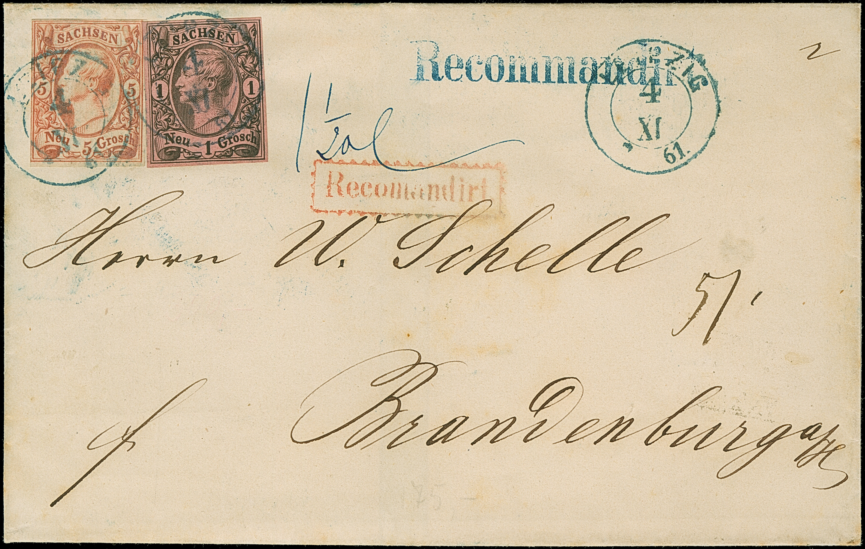 5 Ngr. ziegelrot und 1 Ngr. auf mattgraurot, erstere links unten leicht berührt, sonst beide voll- bis breitrandig, mit blauem Doppelkreisstempel "LEIPZIG 4/XI 61" sowie nebengesetztem blauem L1 "Recommandirt" und rotem Zackenkranzstempel "Recomandirt", auf eingeschriebenem Briefhülle der 2. Gewichtsstufe nach Brandenburg. Ein attraktiver Brief mit farbiger Abstempelung.