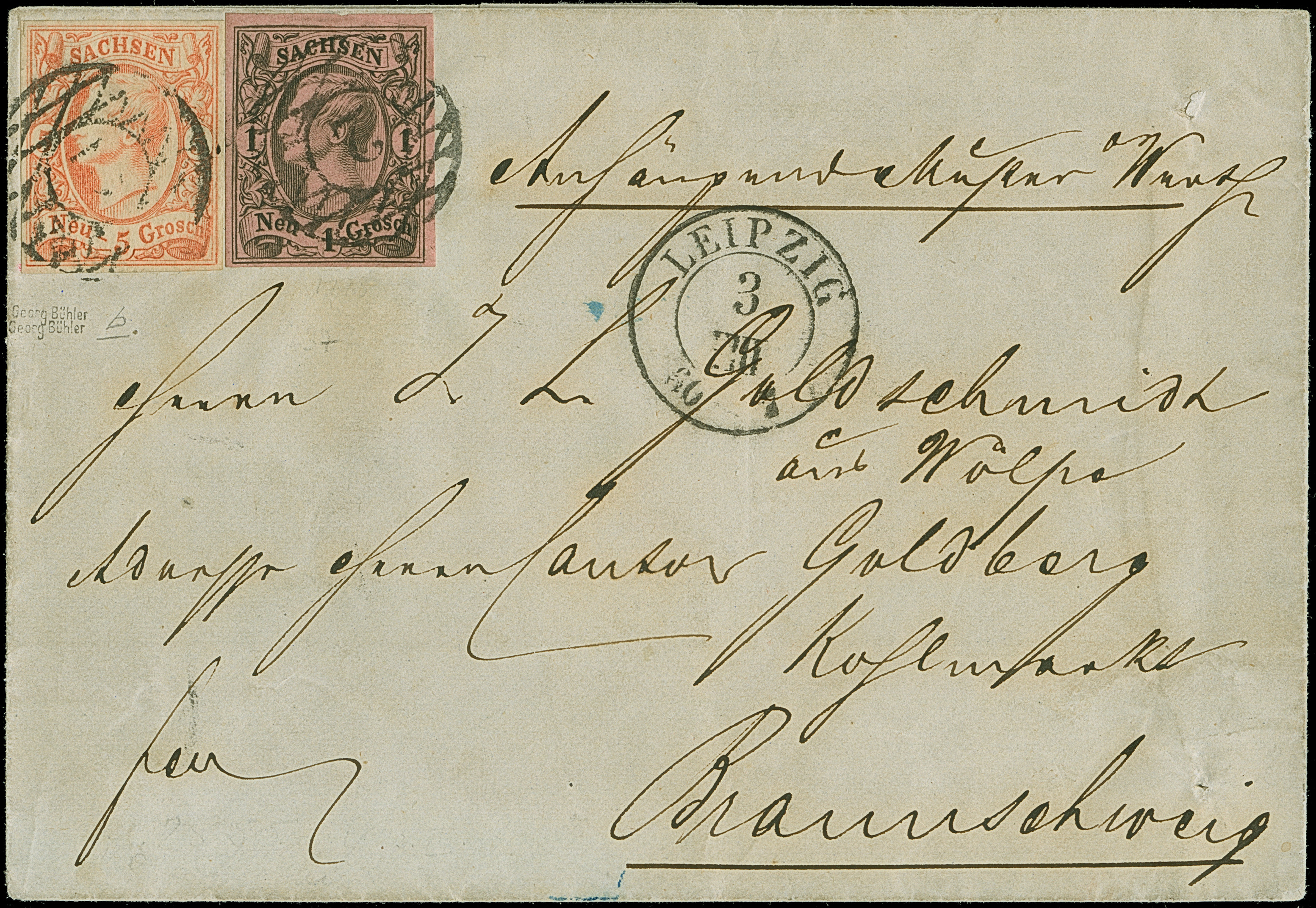 5 Ngr. lebhaftorangerot und 1 Ngr. auf mattgraurot, beide voll- bis breitrandig, mit Nr. “2” und sauber nebengesetztem Doppelkreisstempel "LEIPZIG 3 VIII 60", auf Briefhülle mit handschriftlichem "Anhängend Muster o. Wert" nach Braunschweig. Eine schöne Frankatur der 2.Gewichtsstufe mit der seltene Nuance. Signiert Georg Bühler.