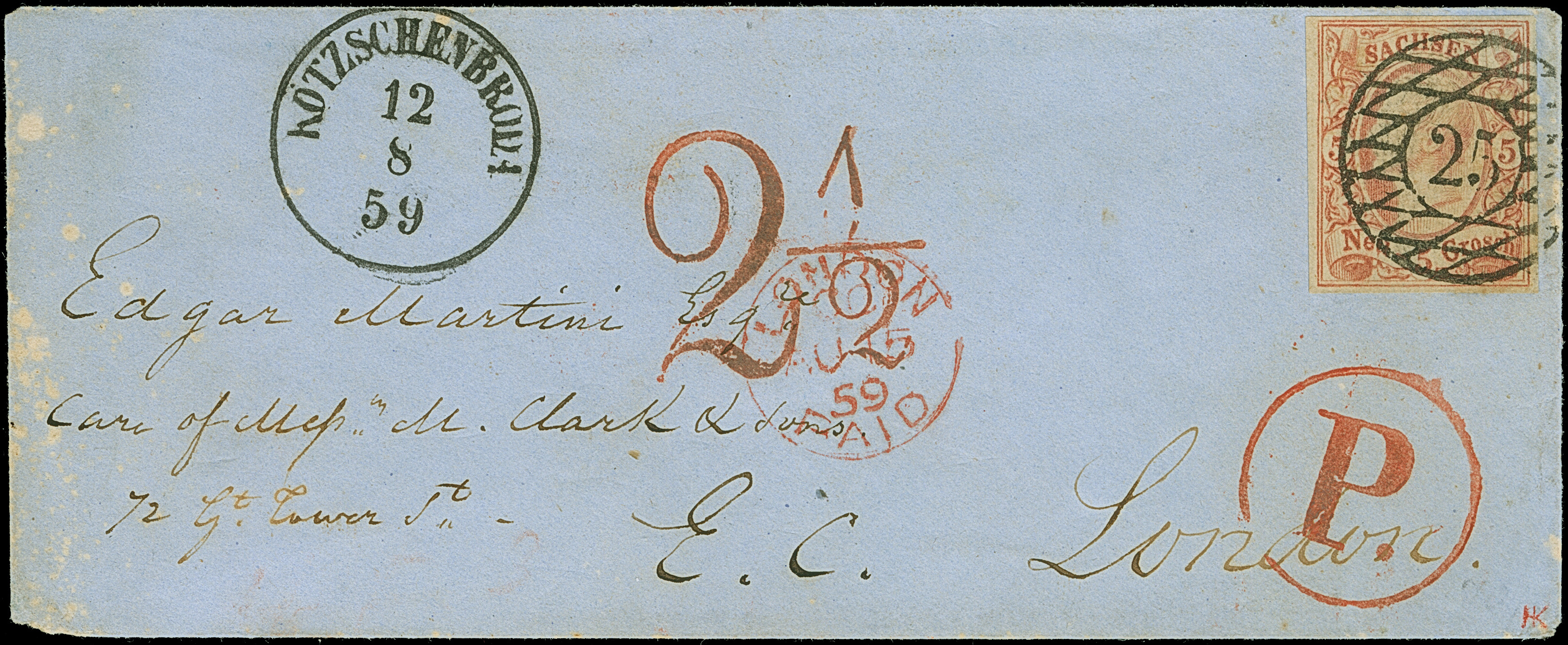 5 Ngr. ziegelrot, allseits breitrandig, mit klarer Nr. "25" und sauber nebengesetztem Einkreisstempel "KÖTZSCHENBRODA 12/8 59" auf kleinem Briefkuvert mit nebengesetztem roten Taxstempel "2½" über Preußen und Belgien nach London. Frühester registrierter Brief zum neuen Tarif, nach der Portoreduzierung am 1.7.1859.