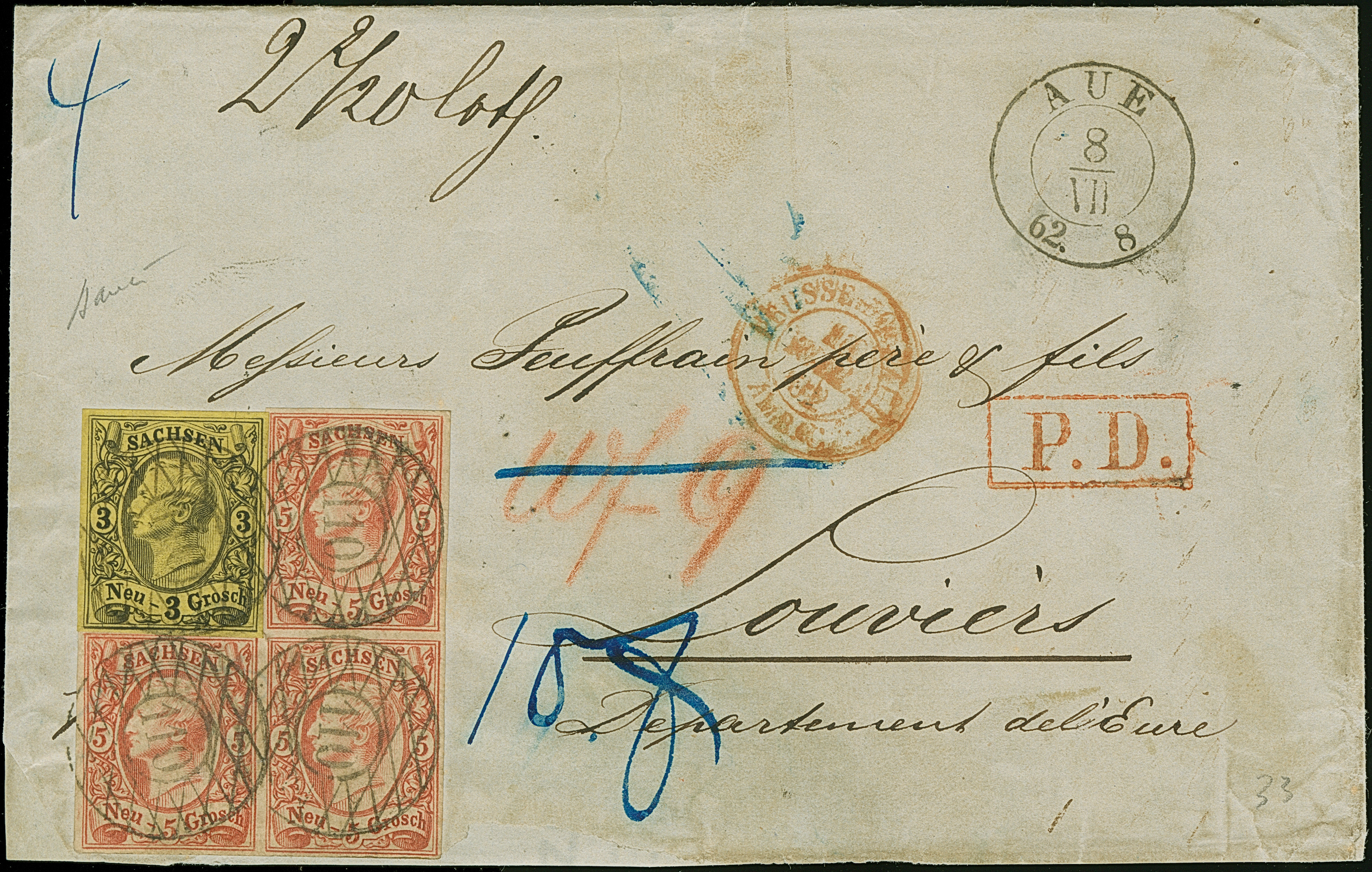5 Ngr. ziegelrot im 3er-Block, zusammen mit 3 Ngr. auf gelb, alle farbfrisch und voll- bis meist breitrandig, mit einzeln sauber aufgesetzter Nr. "110" und nebengesetztem Doppelkreisstempel "AUE 8/VII 62" auf Briefhülle der 4. Gewichtsstufe (je 10 g) nach Louviers, Frankreich. Die untere Rückklappe fehlt und hier vorderseitig kleine Fehlstellen im Briefpapier, sonst gute Erhaltung. Ein attraktiver Brief mit außerordentlich seltener Frankatur; zweitgrößte registrierte gebrauchte Einheit dieser Marke, auf Brief ist nur noch ein weiterer 3er-Streifen bekannt.