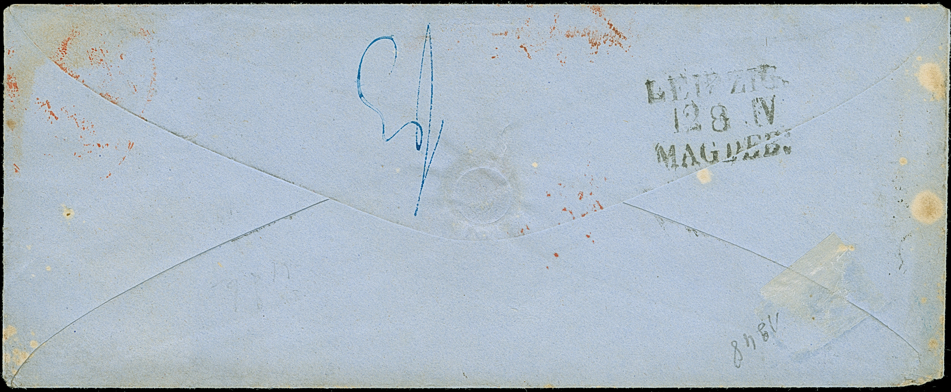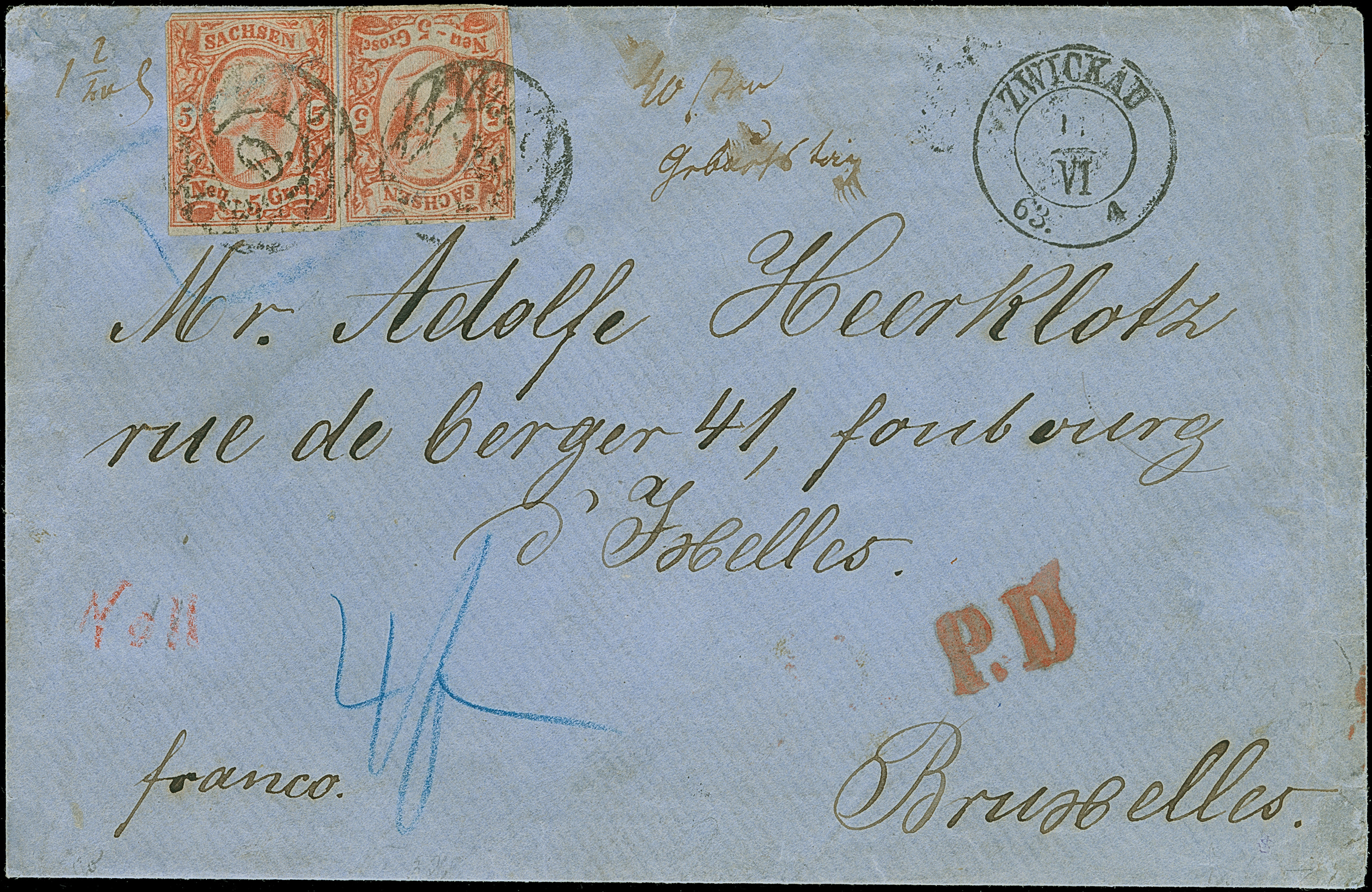 5 Ngr. ziegelrot im senkrechten Paar, mit 2 Ngr. auf blau, mit Nr. "1" und nebengesetztem Doppelkreisstempel "DRESDEN 22 III 61" auf Briefkuvert über London, mit vorderseitigem Durchgangsstempel, nach Christiansted auf St. Croix, Dänisch- Westindien. Die Marken waren über den Rand des Kuverts geklebt (dieses oben etwas umgefaltet), daher entsprechend etwas fehlerhaft. Ein außerordentlich seltener und durchaus attraktiver Brief. Dänisch Westindien zählt zu den seltensten Destinationen für die altdeutschen Staaten; neben wenigen Briefen aus Hamburg und einem weiteren aus Sachsen haben wir keinen weiteren Brief mit dieser Destination registriert.