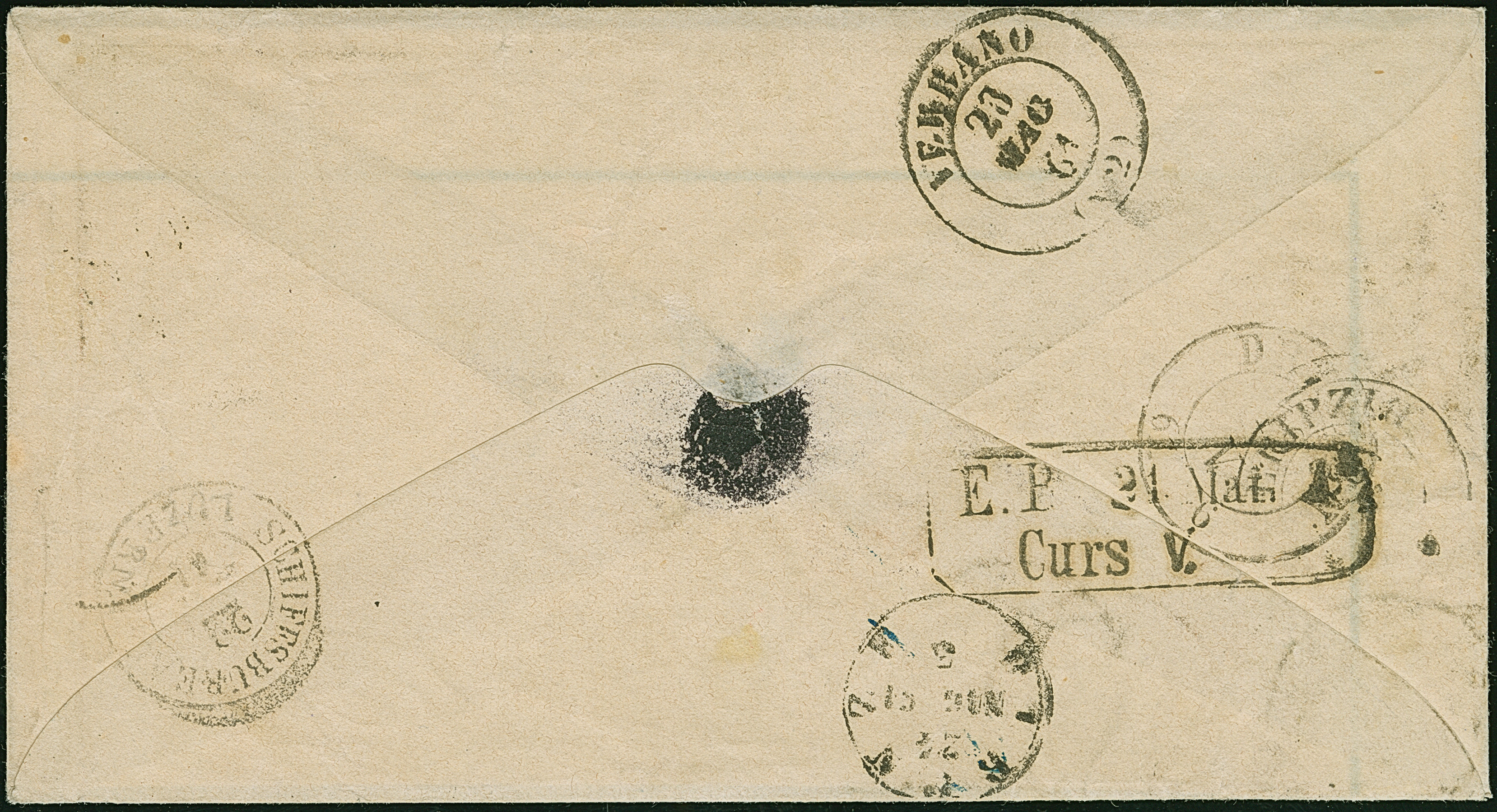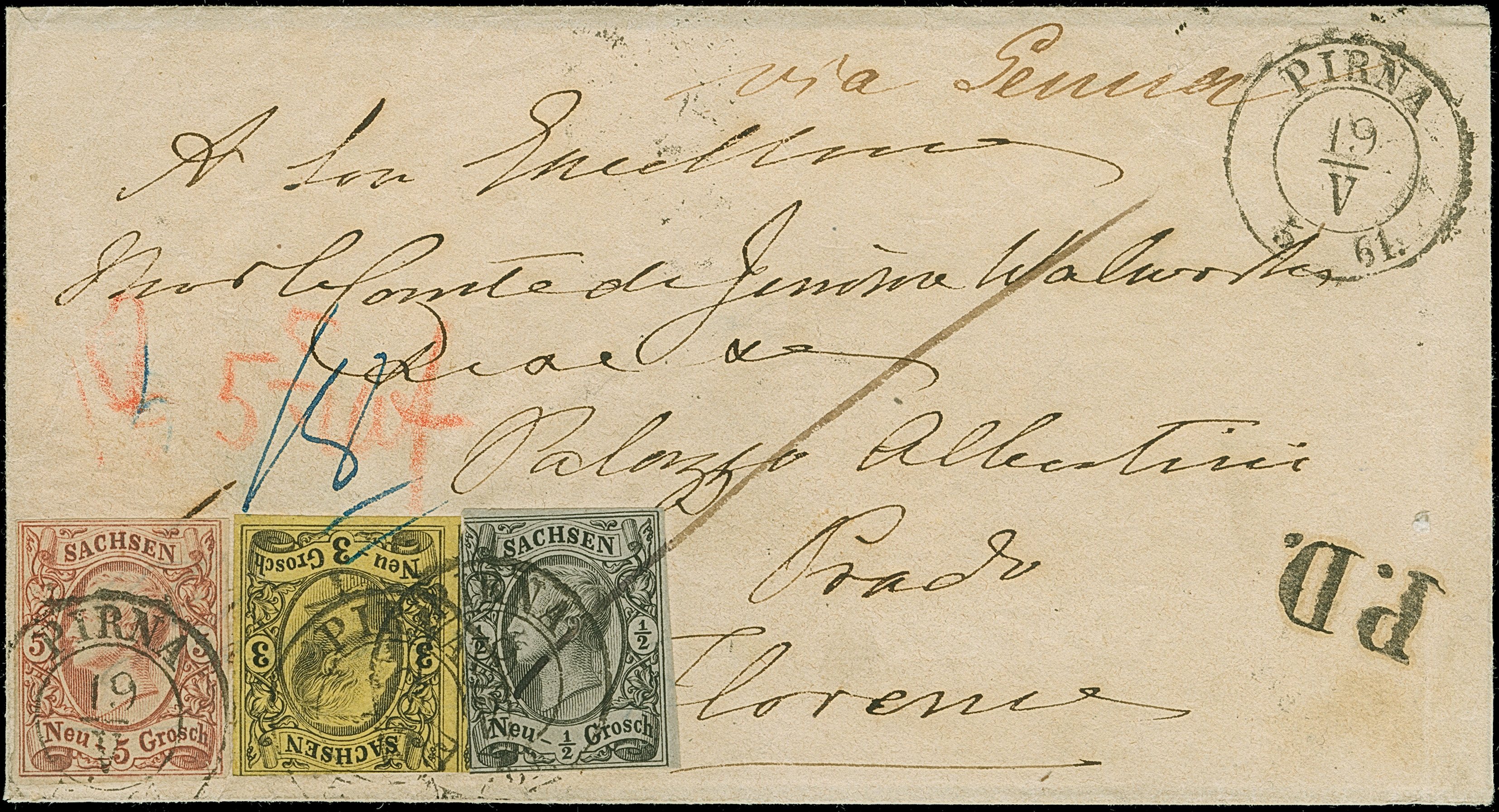 Ngr. auf grau, mit Doppelkreisstempel “PIRNA 19/V 61” auf Briefhülle, mit Leitvermerk "via Genua", nach Florenz, dann Königreich Italien. Rückseitig badischer Bahnpoststempel, "SCHIFFSBUREAU LUZERN" und "VERBANO" (Lago Maggiore). Die 5 Ngr. unmerklicher kleiner Randriss, sonst gute Erhaltung. Eine seltene Frankatur nach dem späten Tarif vom Januar 1861.