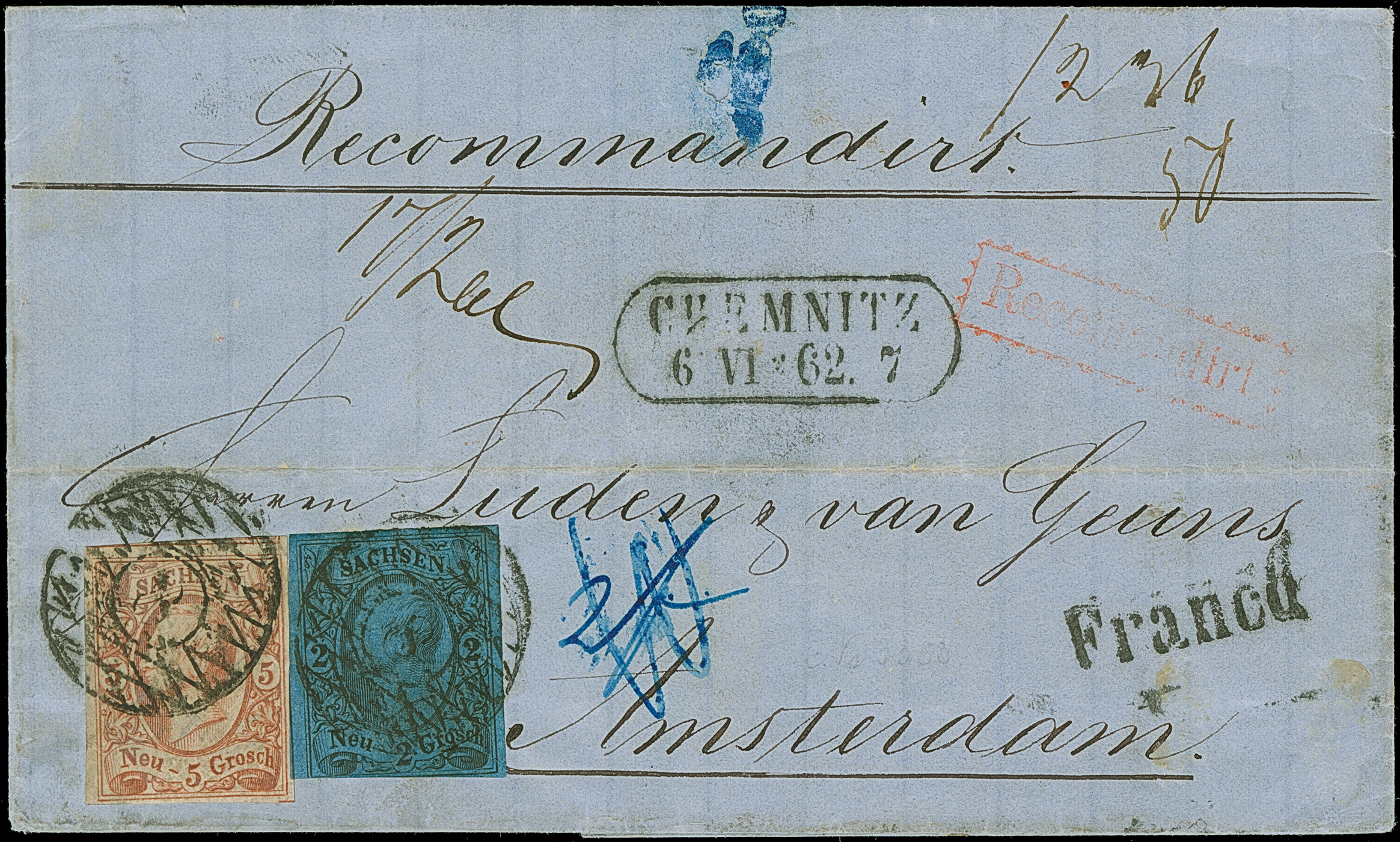 5 Ngr. ziegelrot, voll- bis meist breitrandig, zusammen mit kurz berührter 2 Ngr. auf blau, mit Nr. 8 und nebengesetztem Rahmenstempel Chemnitz 6 VI 62 auf eingeschriebener Briefhülle nach Amsterdam. Eine nicht häufige Frankatur.