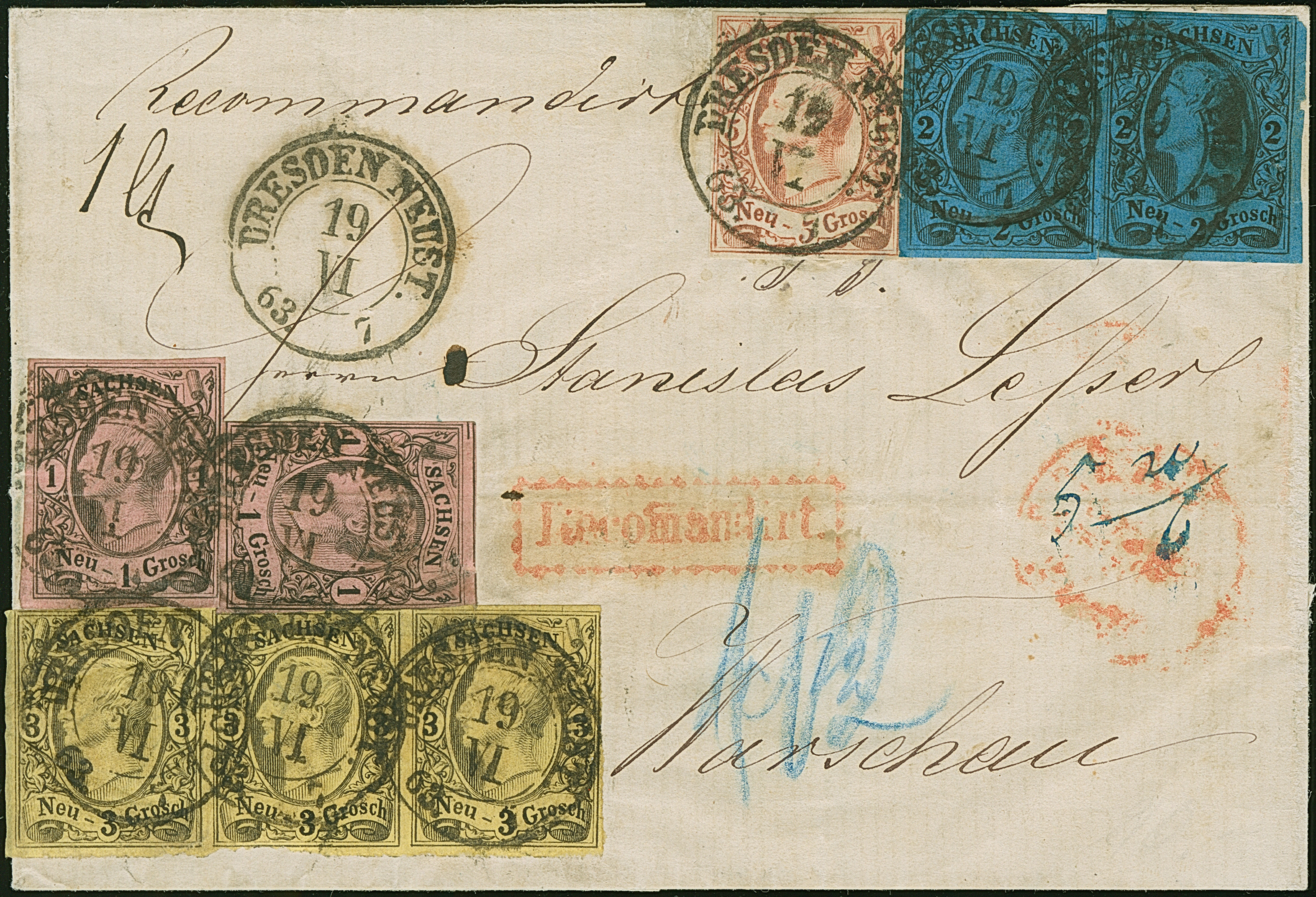 5 Ngr. ziegelrot, voll- bis breitrandig zusammen mit waagerechtem 3er-Streifen 3 Neugroschen auf gelb sowie jeweils 2 Einzelwerten 2 Neugroschen auf blau und 1 Neugroschen auf rosa, teils etwas berührt bzw. leicht fehlerhaft, durch die 1 Neugroschen-Werte waagerechter Briefbug, mit Doppelkreisstempel "DRESDEN NEUST. 19 VI 63" auf eingeschriebener Briefhülle der 2. Gewichtsstufe nach Warschau. Das Porto setzt sich zusammen aus 6 Neugroschen Vereinsgebühr, 2 Neugroschen sächsischer Reco-Gebühr sowie 12 Neugroschen russischem Porto einschließlich der Rekommandation. Eine spektakuläre und einmalige 4 Farben-20 Ngr.- Frankatur aus der bekannten Lesser-Korrespondenz.