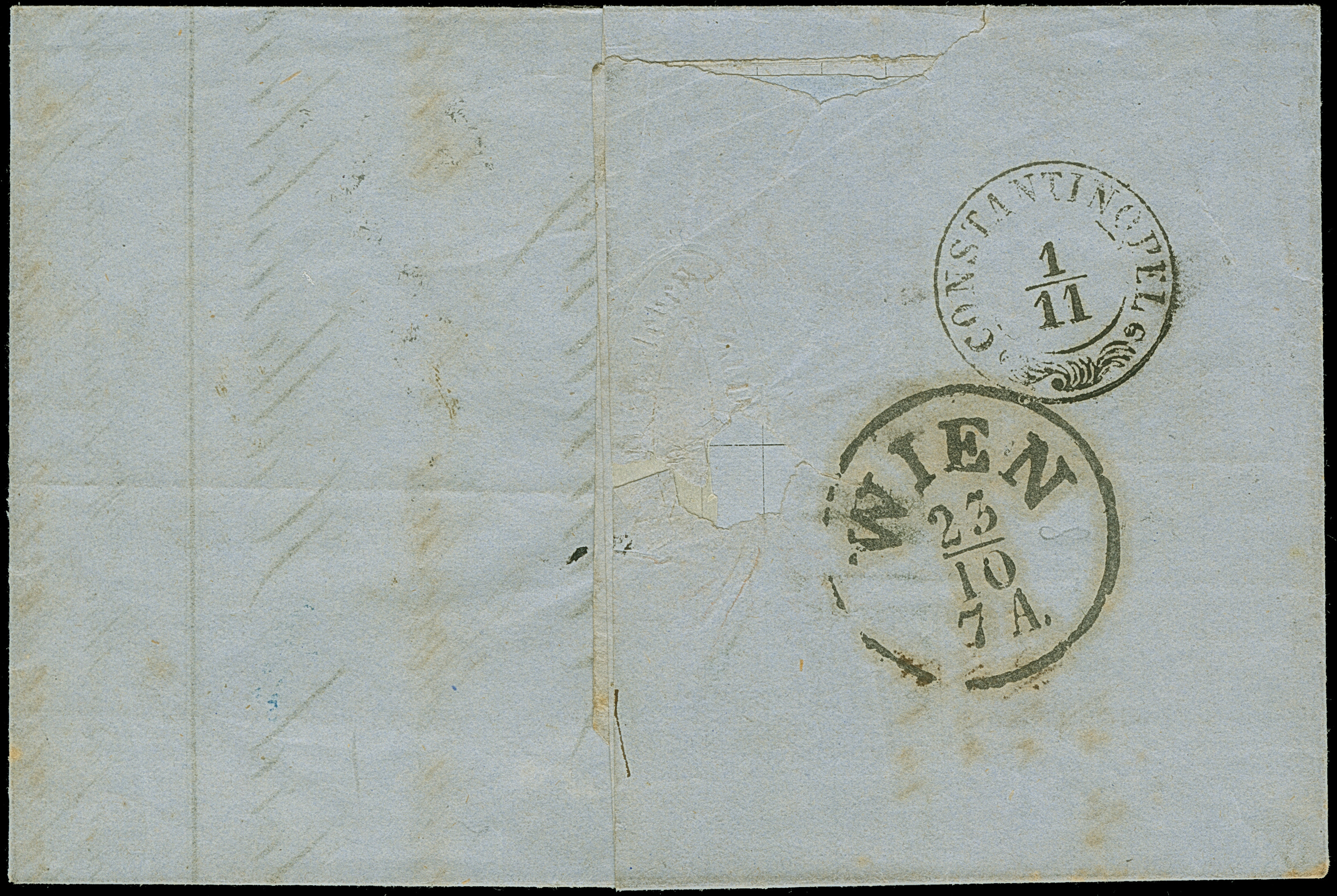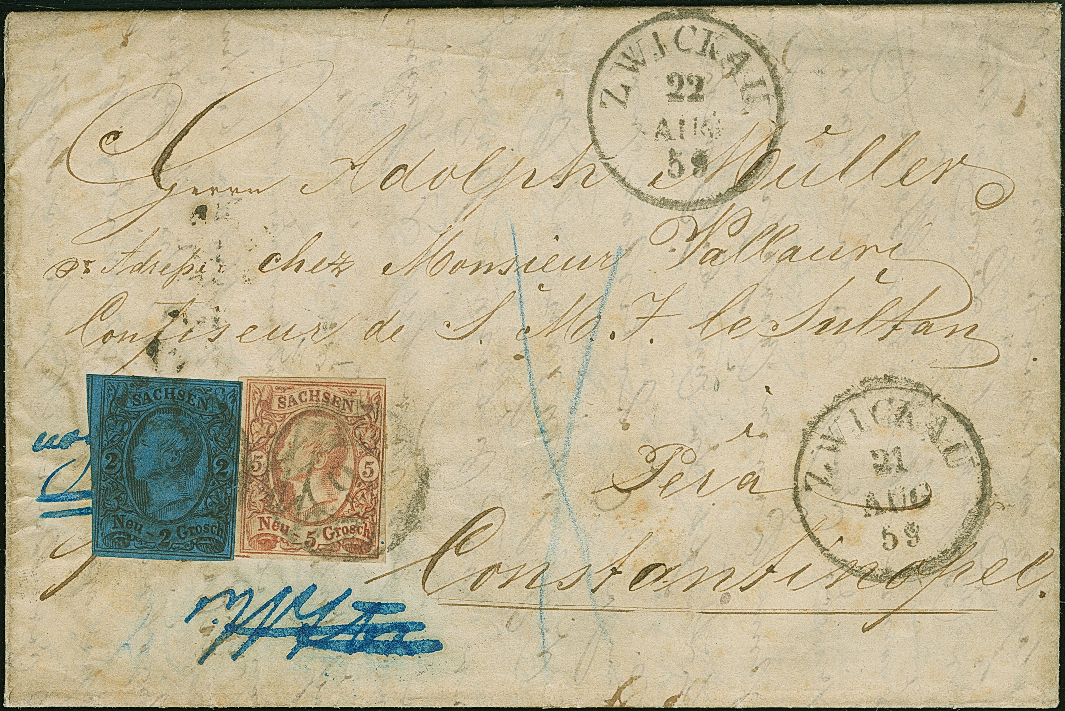 5 Ngr. ziegelrot und 2 Ngr. auf blau, erstere rechts oben minimal berührt, sonst beide voll- bis breitrandig mit Nr. "6" und zwei nebengesetzten EKr. von Zwickau vom 21. bzw. 22. August 1859, auf vollständigem Faltbrief über Triest nach Konstantinopel, mit schöner Adresse "Herrn Adolph Müller pr. Adresse chez Monsieur Vallaure, Confiseur de S. M. I. le Sultan". Der Brief war ursprünglich nur mit der 5 Neugroschen frankiert aufgegeben worden, jedoch das ungenügende Porto bei der Notierung des Weiterfrankos erkannt und der Brief mit handschriftlichem Vermerk "noch 2 gr." dem Absender zurückgegeben; am nächsten Tag wurde der Brief dann ordnungsgemäß frankiert wieder aufgeliefert und versandt. Rückseitig Transitstempel von Triest vom 25.8. und Ankunftsstempel vom 1.9.. Ein äußerst seltener und interessanter Brief in sehr schöner Erhaltung; PROFI hat nur einen weiteren Brief mit dieser Frankatur in die Türkei registriert .