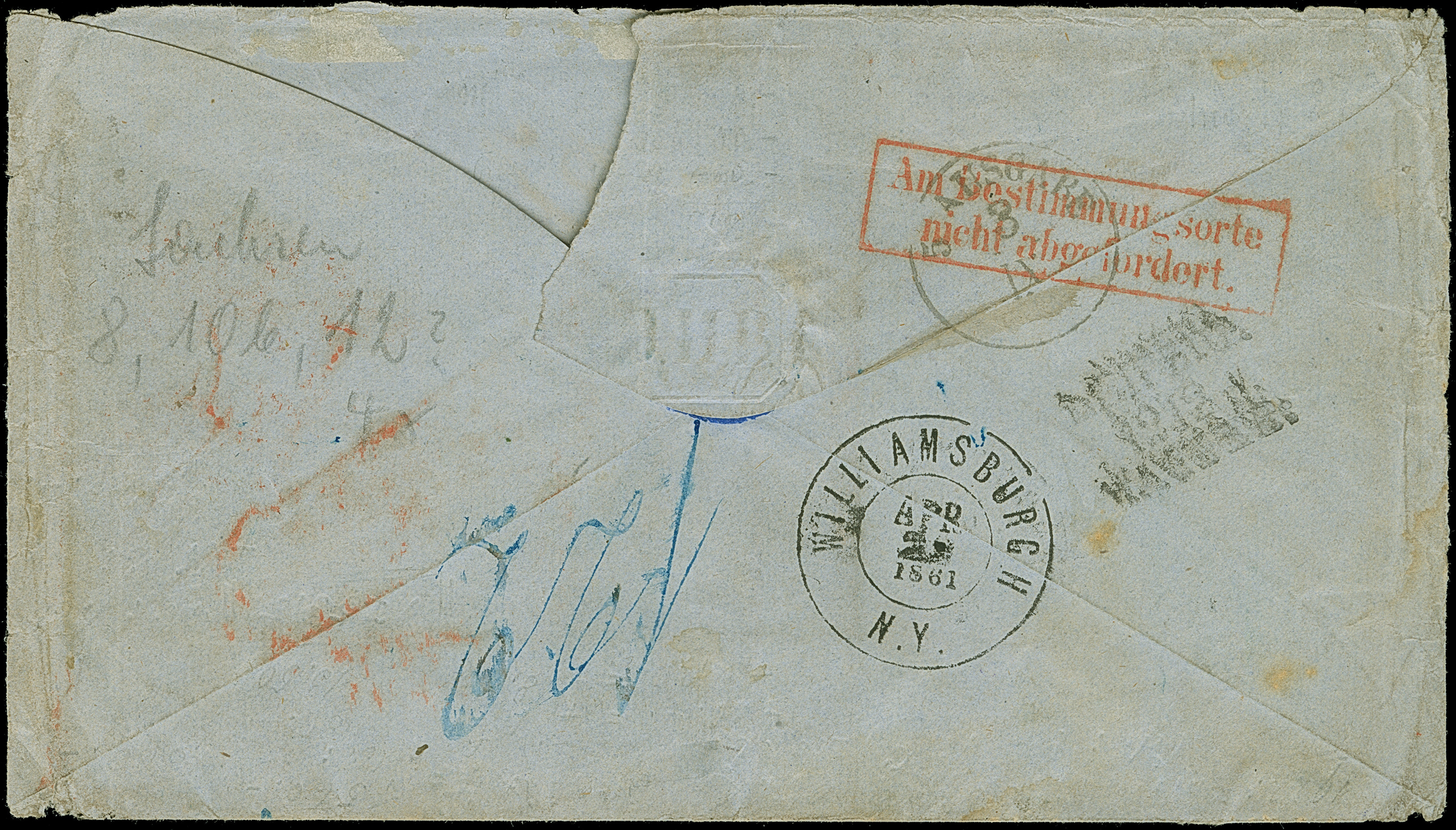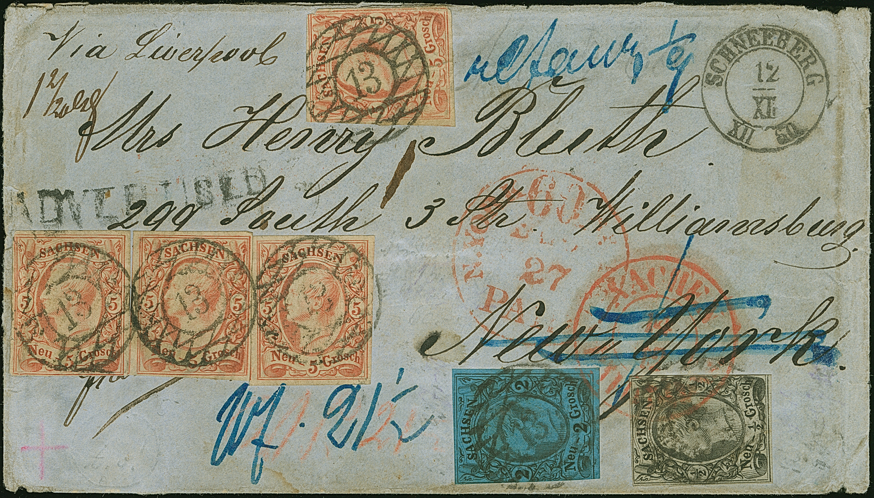 5 Ngr. ziegelrot, 4 Einzelwerte, mit 2 Ngr. auf blau und ½ Ngr.auf mattgrau, mit Nr. "13" und nebengesetztem Doppelkreisstempel "SCHNEEBERG 12/XII 60" auf Briefkuvert der 2. Gewichtsstufe nach Williamsburg bei New York und unzustellbar retour mit vorderseitigem Einzeiler "ADVERTISED" und rückseitigem roten Ra. "Am Bestimmungsorte nicht abgefordert". Der Brief war ursprünglich für die Beförderung mit der British Open Mail mit 27½ Neugroschen frankiert (eine 5 Ngr. unten links abgefallen), wurde jedoch ab Aachen als Prussian Closed Mail befördert, rückseitig entsprechender Weiterfranko-Vermerk über 22 Neugroschen. Zwei 5 Neugroschen durch Randklebung leicht fehlerhaft. Ein interessanter Brief.