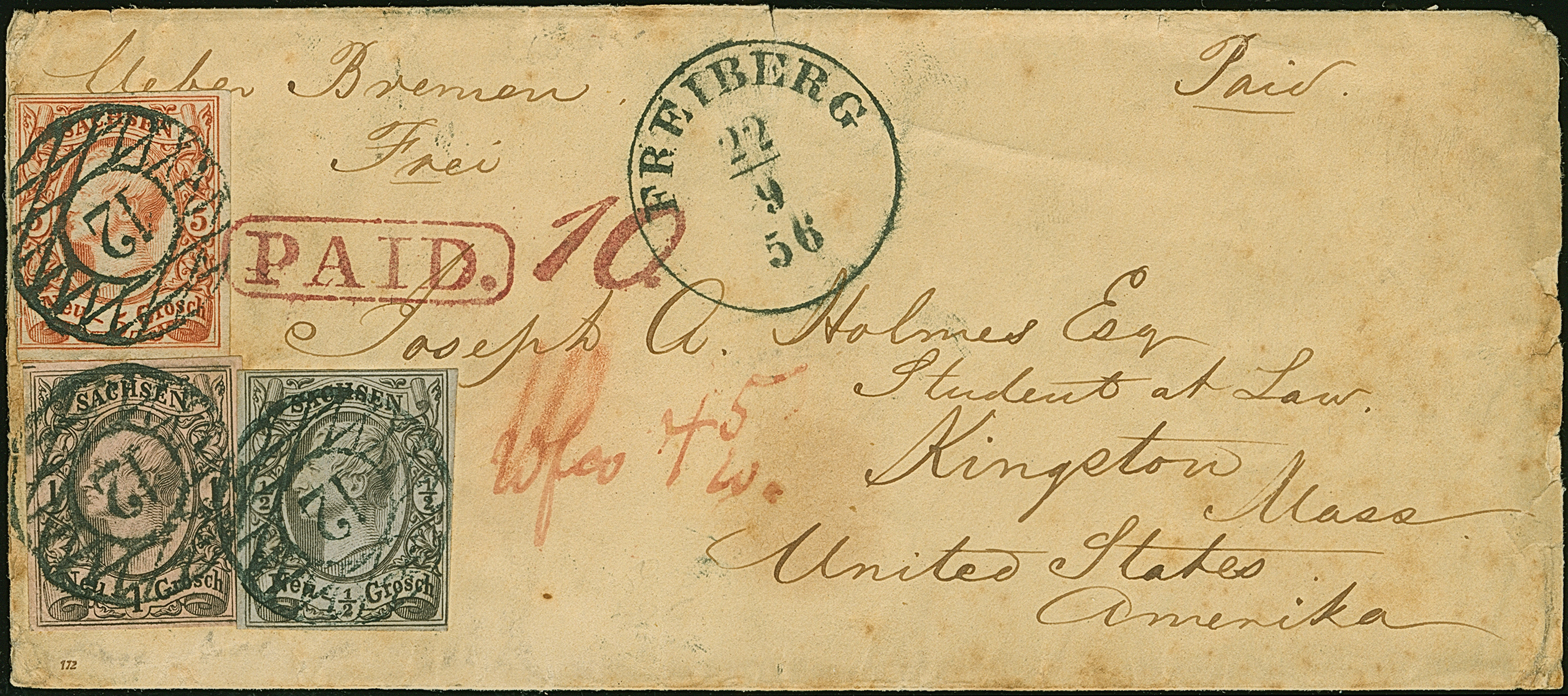 5 Ngr. ziegelrot (links berührt und kleiner Randspalt) mit 1 Neugroschen graurot und ½ Neugroschen grau, mit Nr. "12" und nebengesetztem Einkreisstempel "FREIBERG 22/9 56" auf kleinem Briefkuvert über Bremen nach Kingston, Massachusetts, mit Durchgangstempel des Bremer Stadtpostamtes. Leicht unfrisch.
