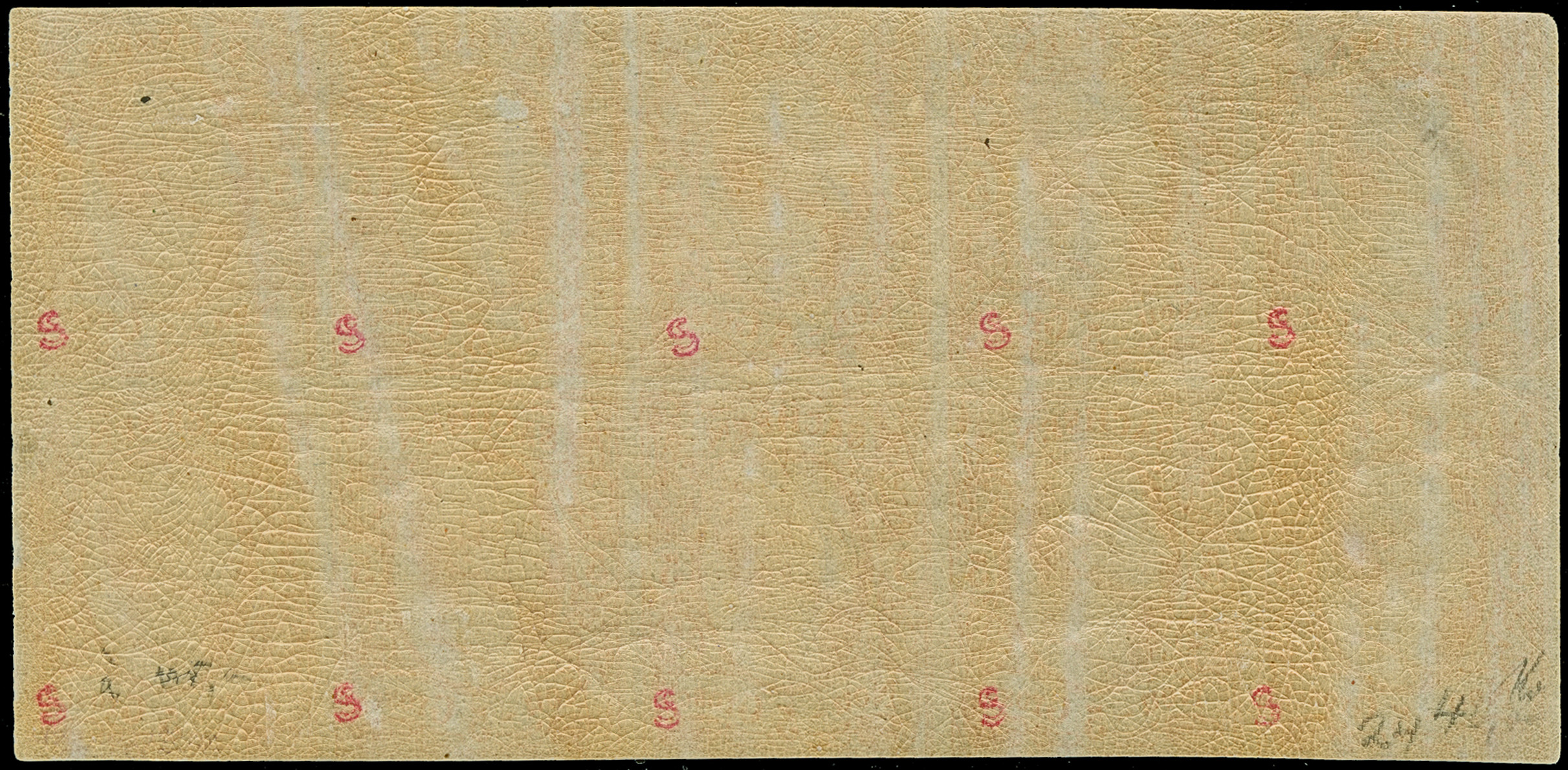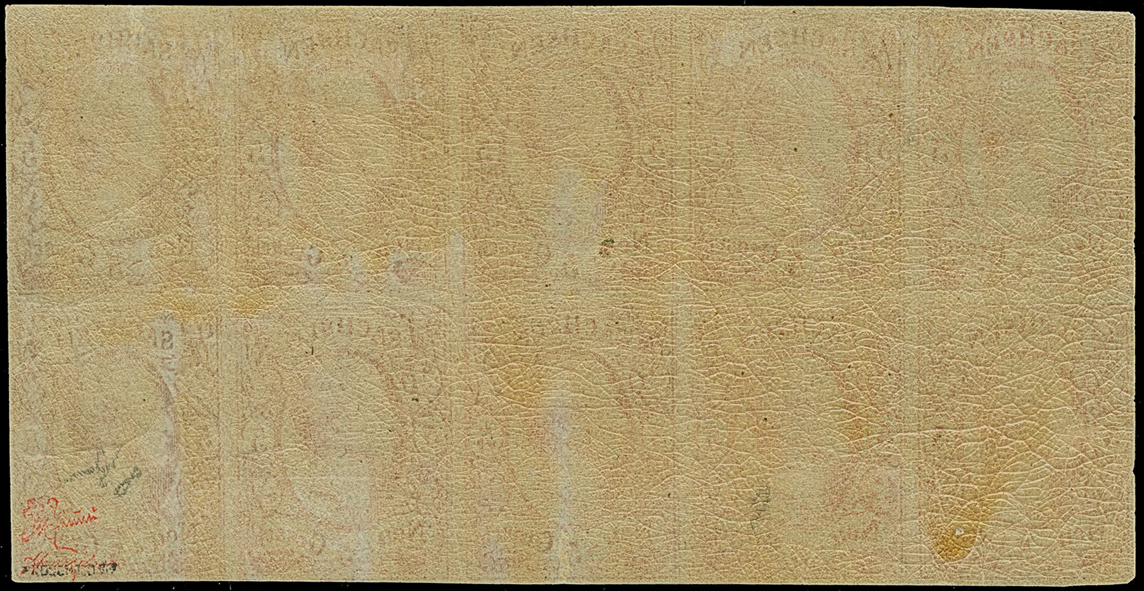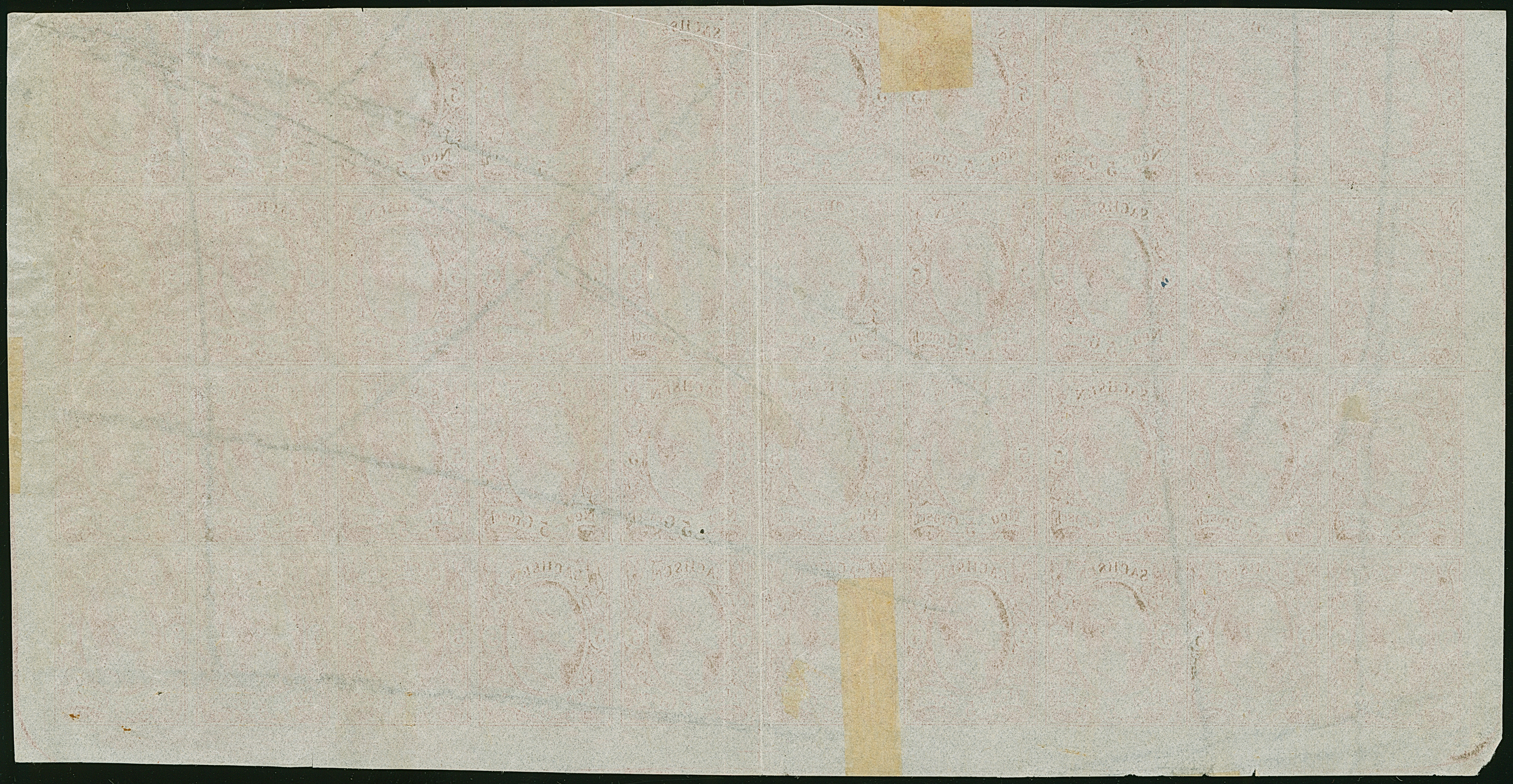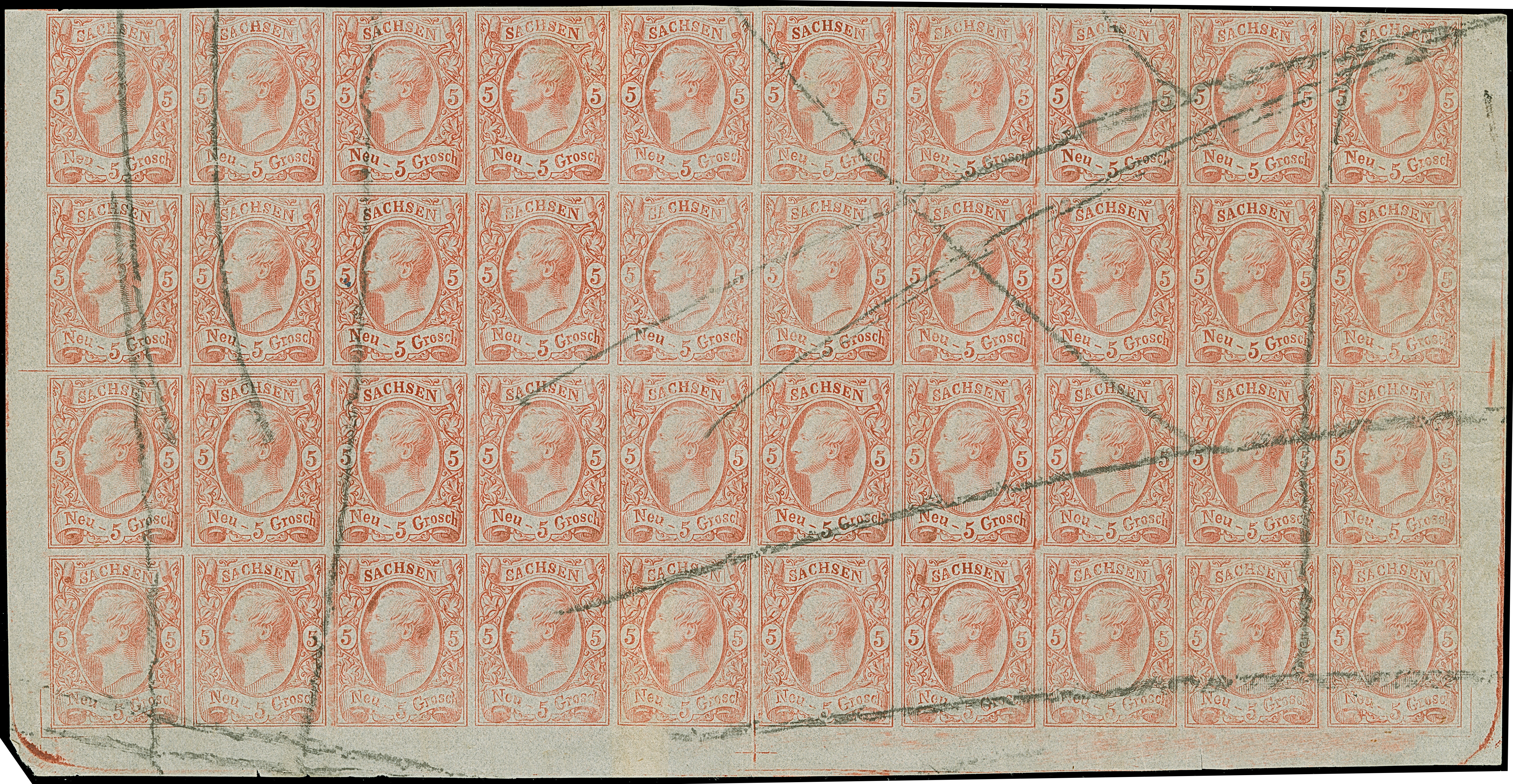 5 Ngr. ziegelrot, 40er-Bogenteil eines Andruckbogens mit dreiseitig breiten Bogenrändern; ungummiert und entwertet durch Farbstriche. Zwischen den Marken einmal senkrecht gefaltet. Ein interessantes Stück.
