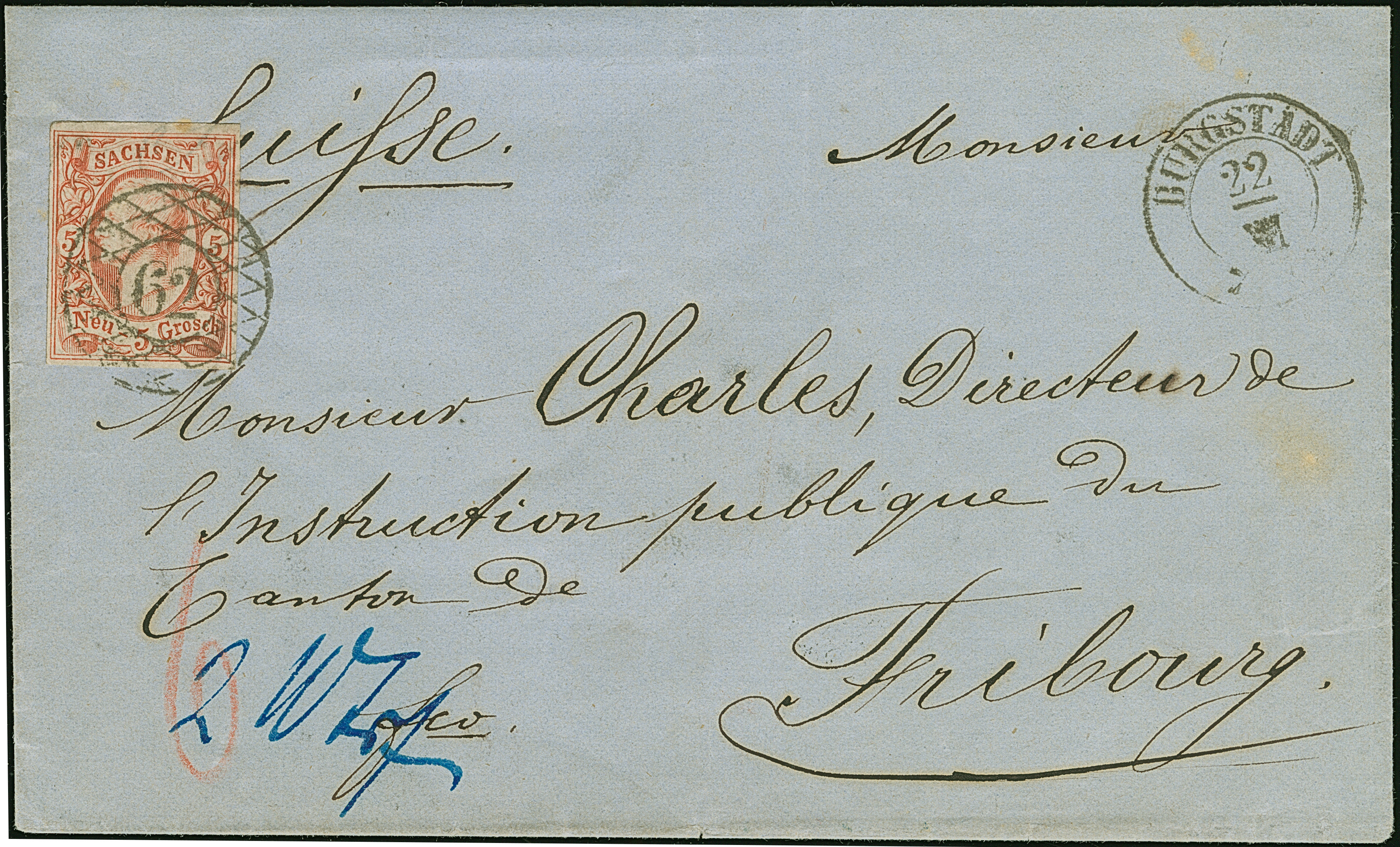 5 Ngr. ziegelrot, voll- bis breitrandig, mit klarer Nr. "62" und nebengesetztem Doppelkreisstempel "BURGSTÄDT 22/XII" (1863) auf Briefhülle nach Freiburg in der Schweiz.