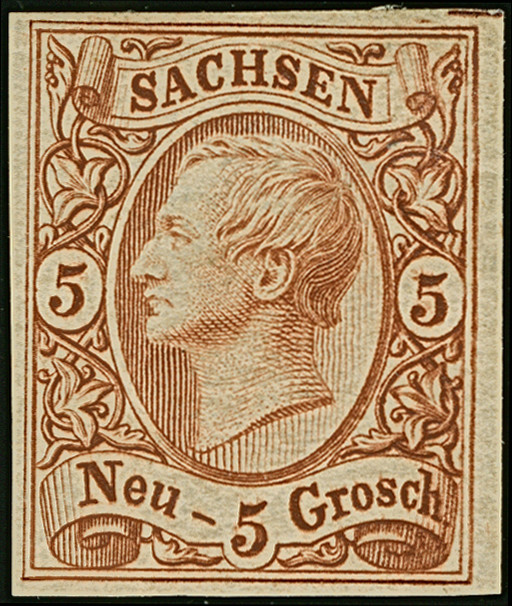 5 Ngr. rostbraun, der sogenannte Farbfehldruck, farbfrisch und voll- bis breitrandig, ungebraucht mit Originalgummi und größerer gummifreier Stelle