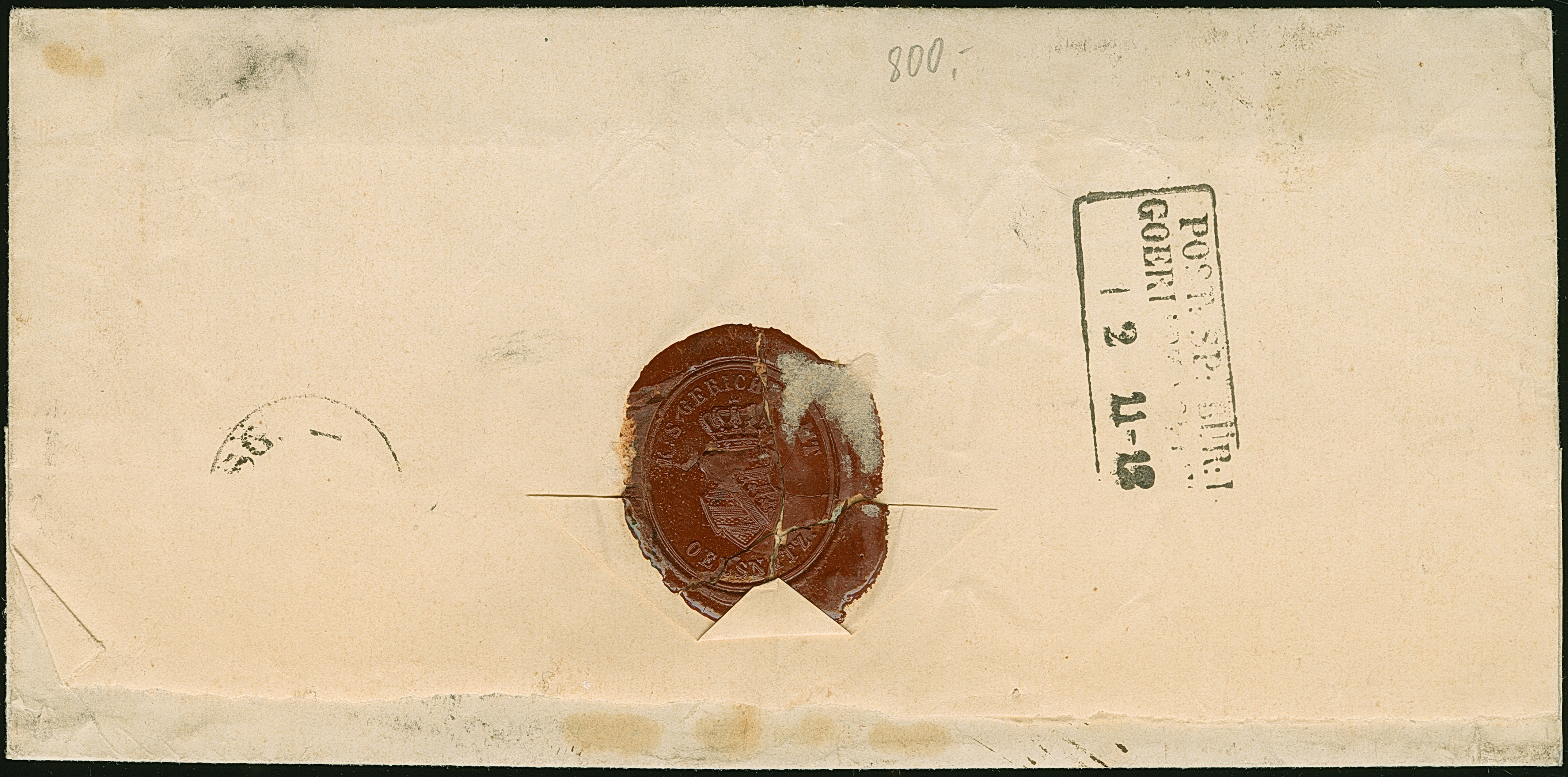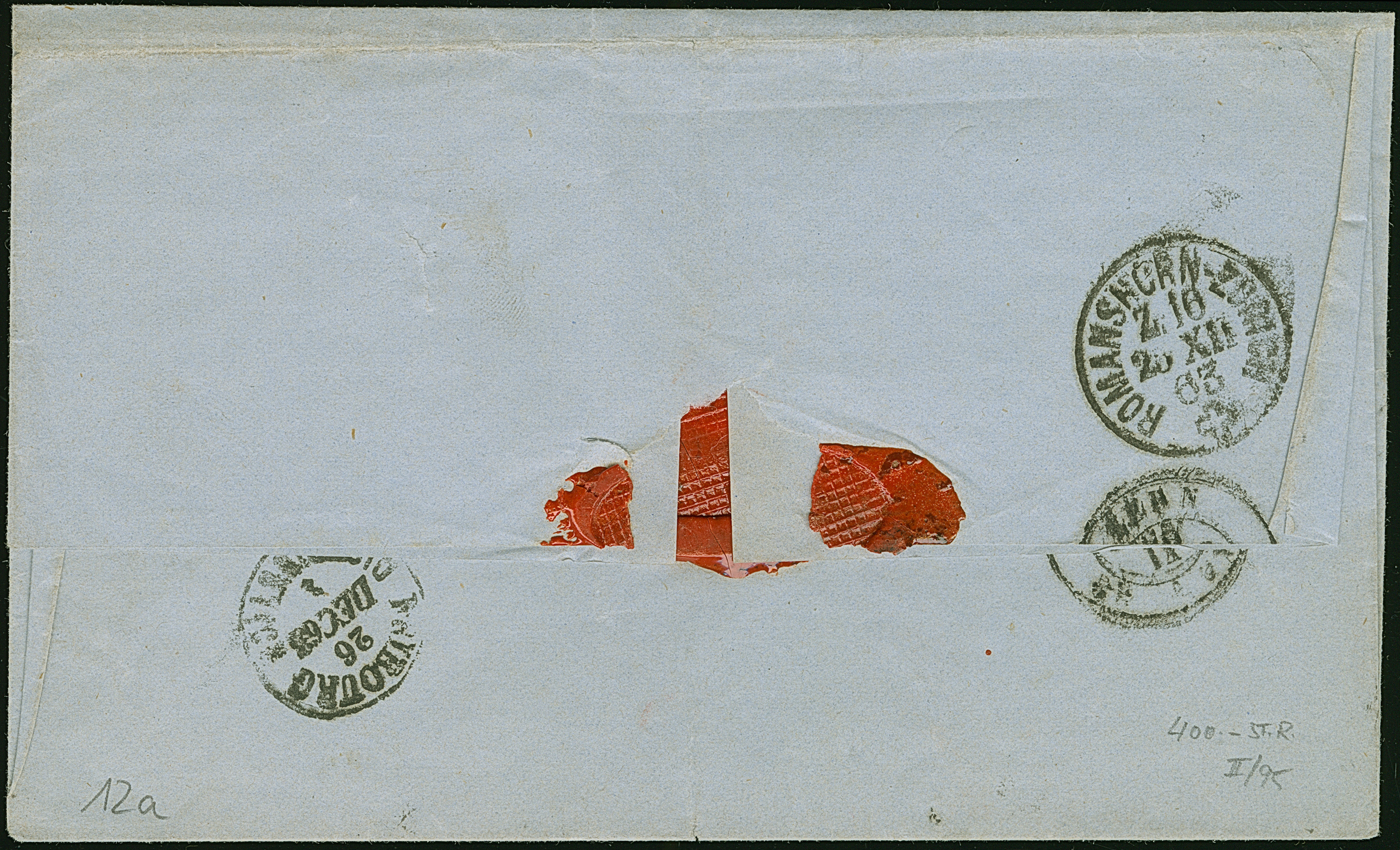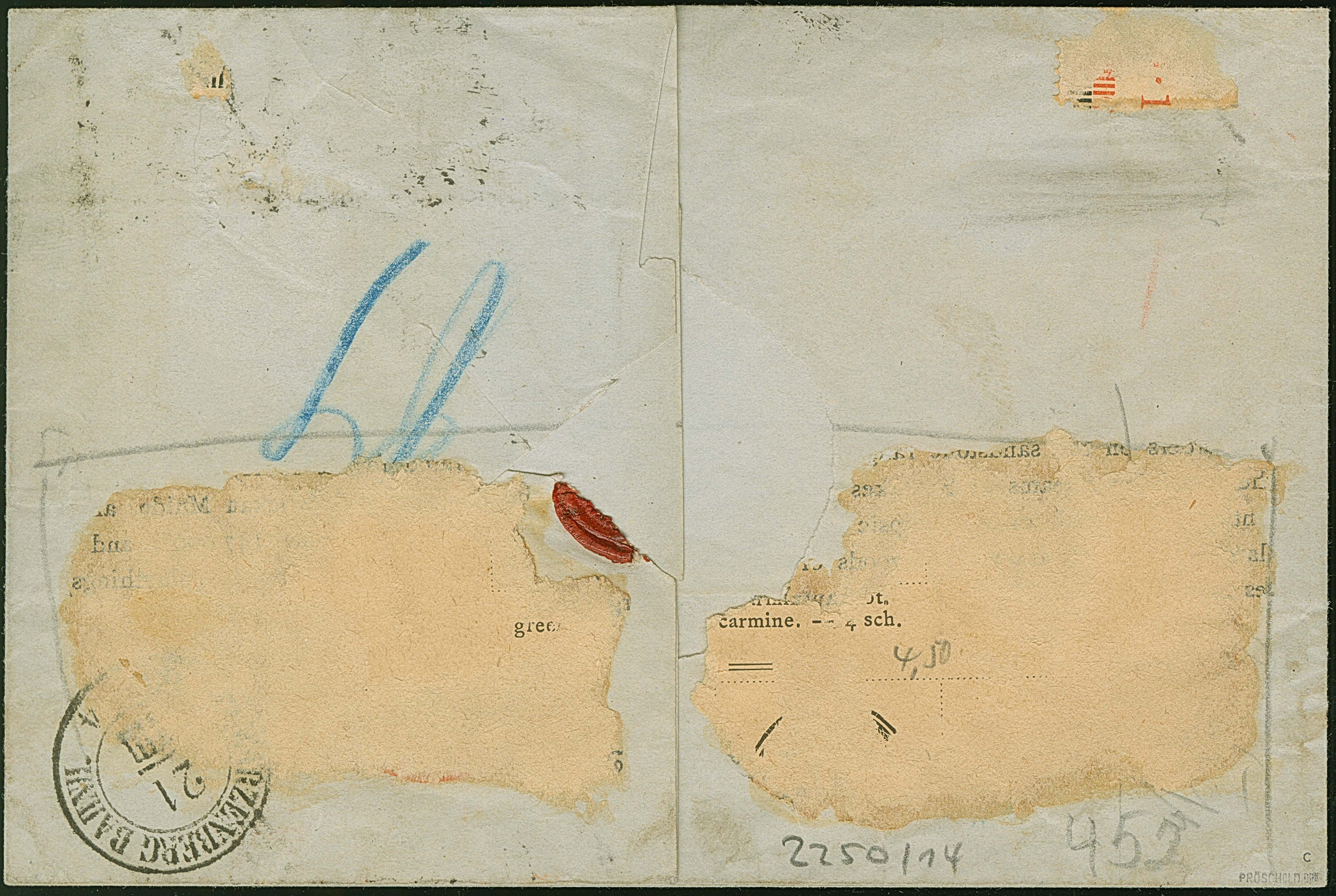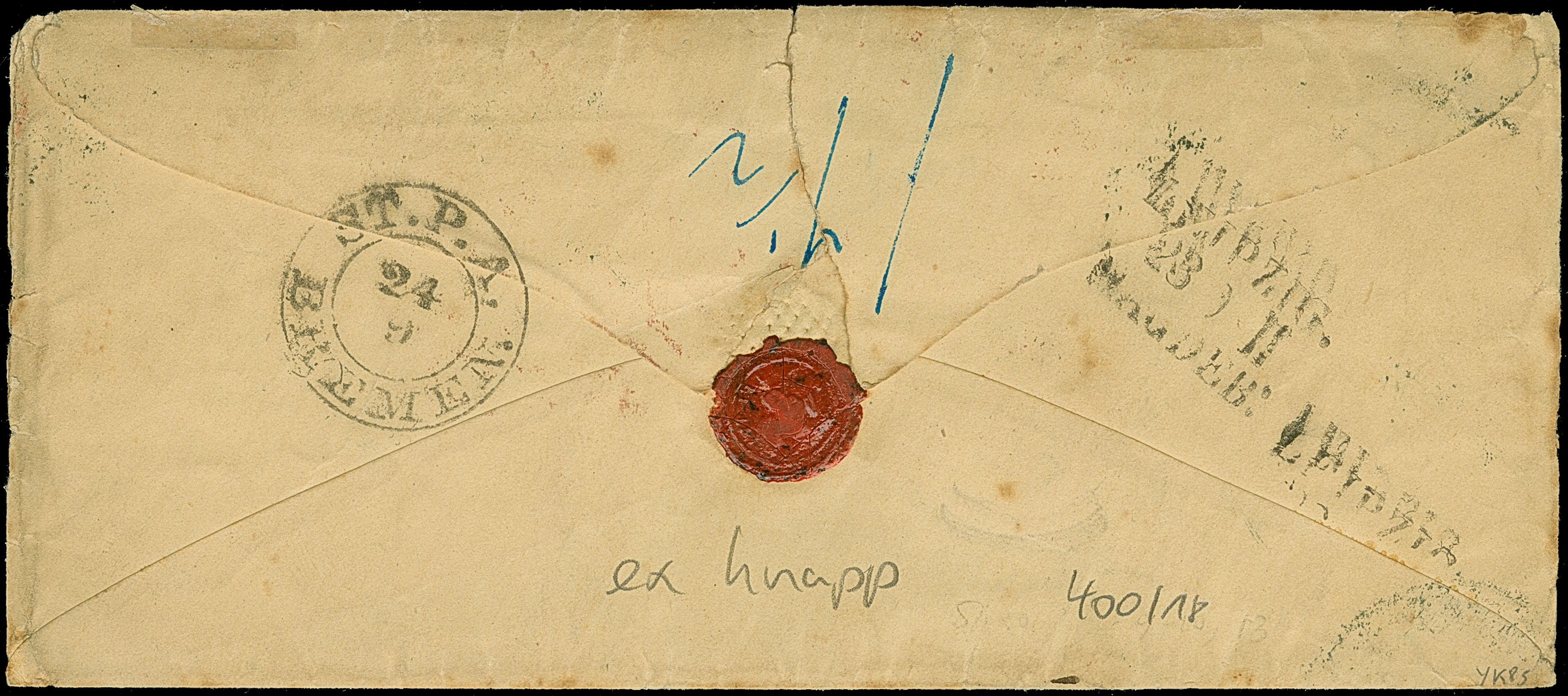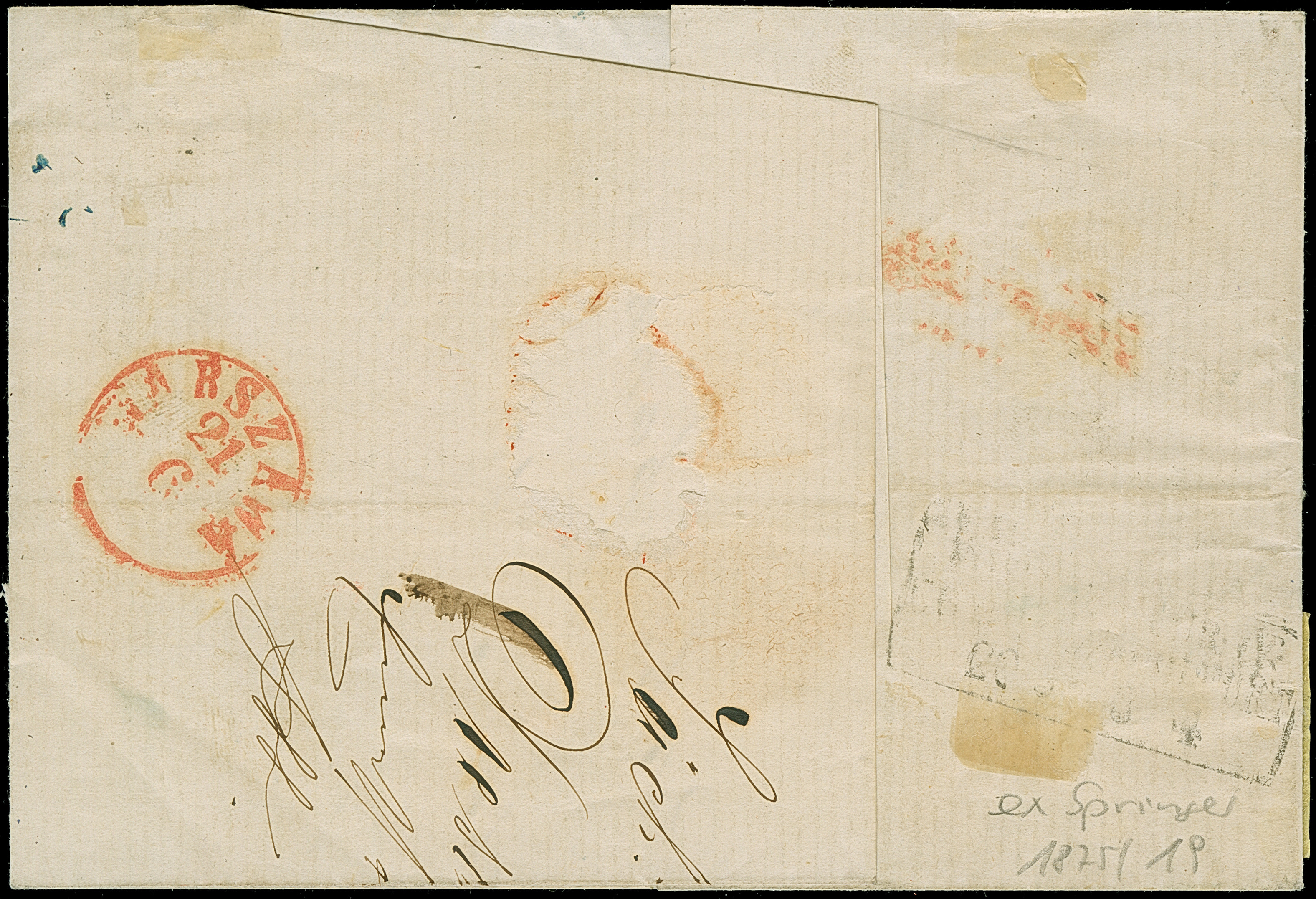 5 Ngr. dunkelzinnoberrot, vollrandig, mit etwas angeschnittener Wappen 3 Pfg. grün, mit Nr. "8" und sauber nebengesetztem DKr. "CHEMNITZ 17 5" auf Briefhülle (2 Seitenteile fehlend) nach Bukarest. Das Porto setzt sich zusammen aus 3 Ngr. Vereinsporto und 2 1/10 Ngr. Landporto Walachei, die Portospitze ordnungsgemäß durch die 3 Pfg.-Marke dargestellt, da es keine kleineren Wertstufen gab. Ein attraktiver und äußerst seltener Brief vor der österreichischen Währungsreform; es ist nur ein weiterer Brief mit dieser Frankatur registriert. Fotoattest Rismondo BPP(2011)