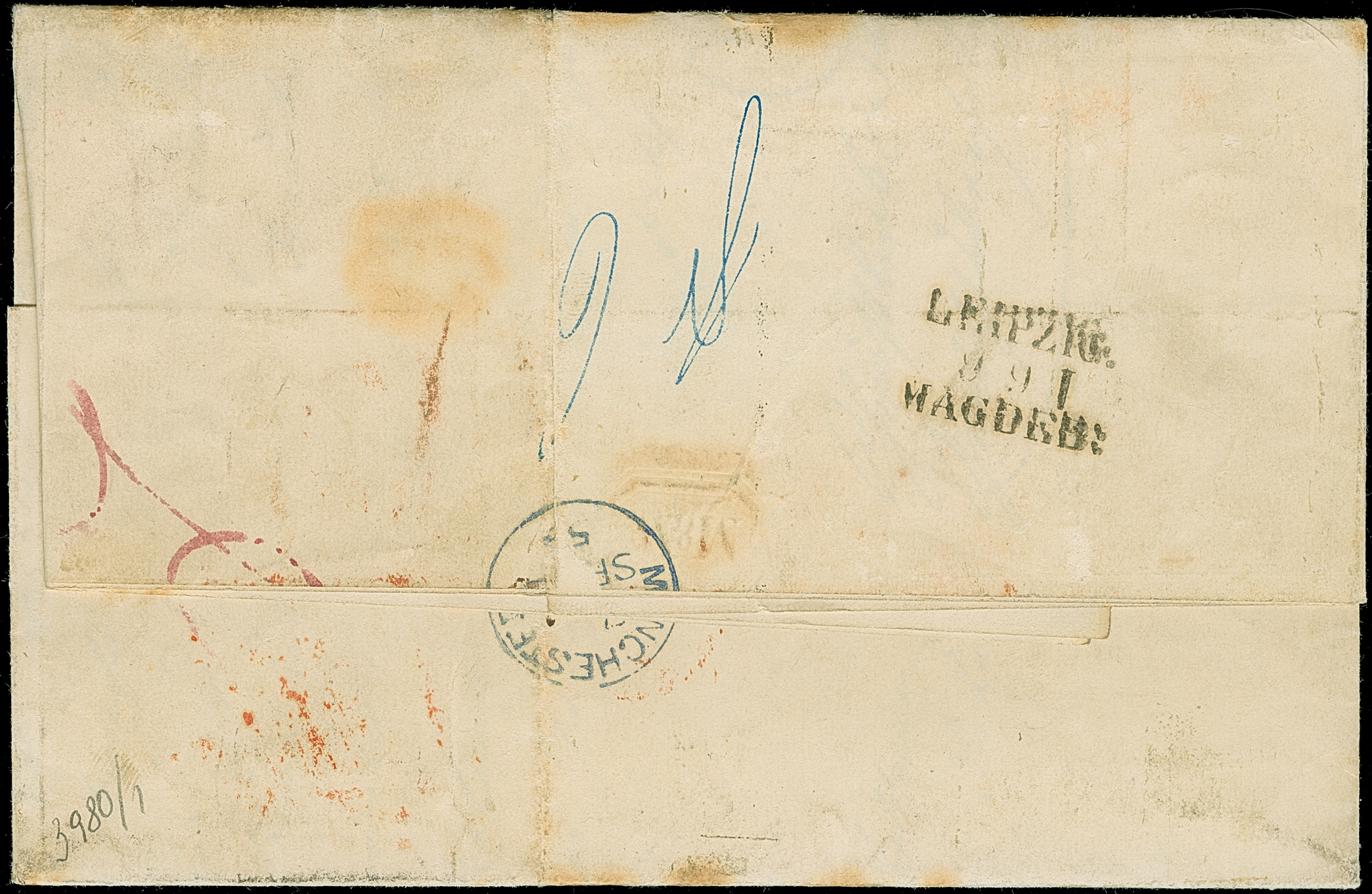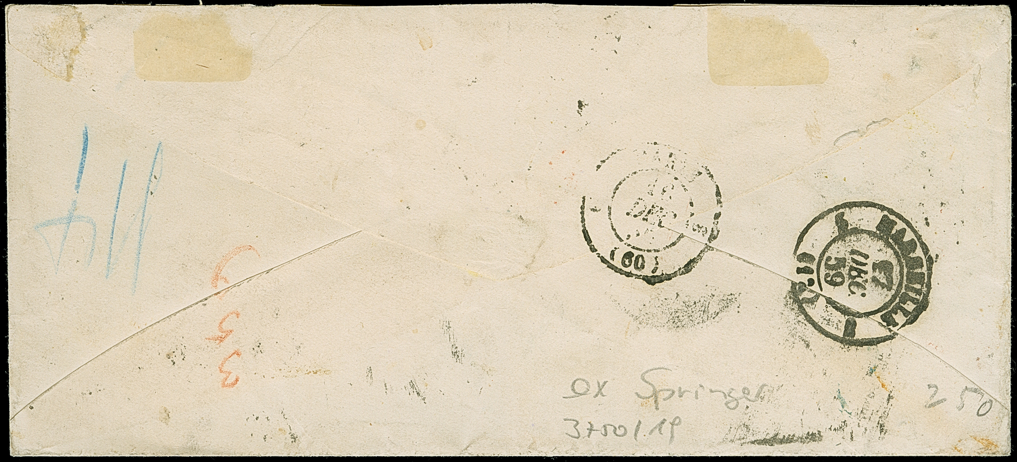 5 Ngr. ziegelrot, senkrechtes Paar und Einzelstück und 2 Ngr. auf blau, alle teils leicht berührt, mit Nr. "1" und nebengesetztem Doppelkreisstempel "DRESDEN 14 DEC. 59" auf kleinem Briefkuvert der 2. französischen Gewichtsstufe, über Baden und Frankreich an ein Mitglied des Schiffes 'Ferdinand Brumm' nach Batavia, Niederländisch Indien. Ein attraktiver und in dieser Form einmaliger Brief; Profi hat keinen weiteren von Sachsen nach Batavia über Frankreich registriert.
