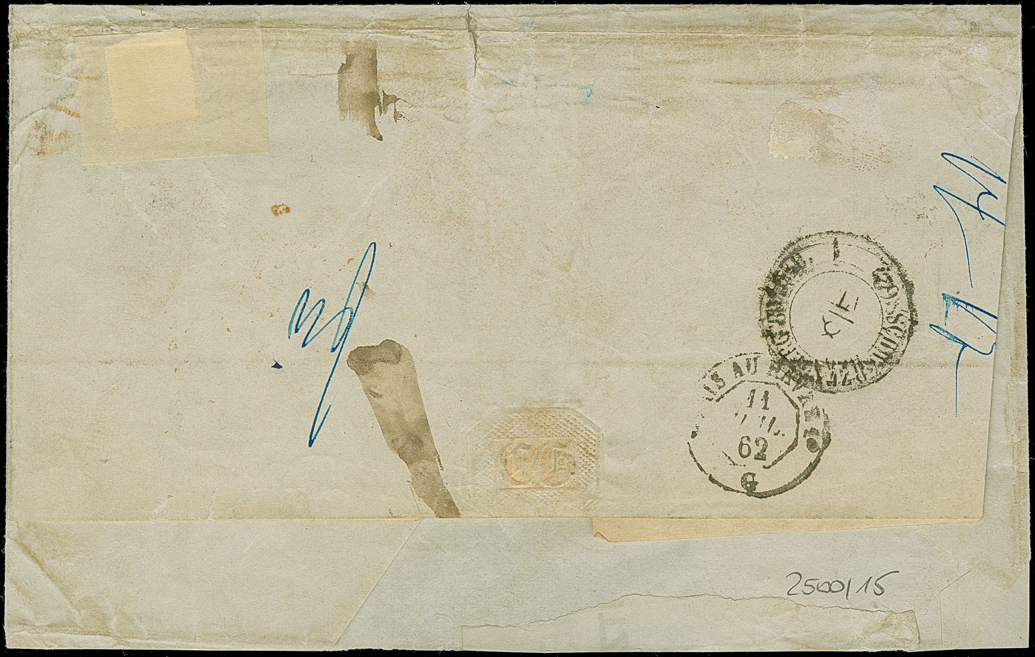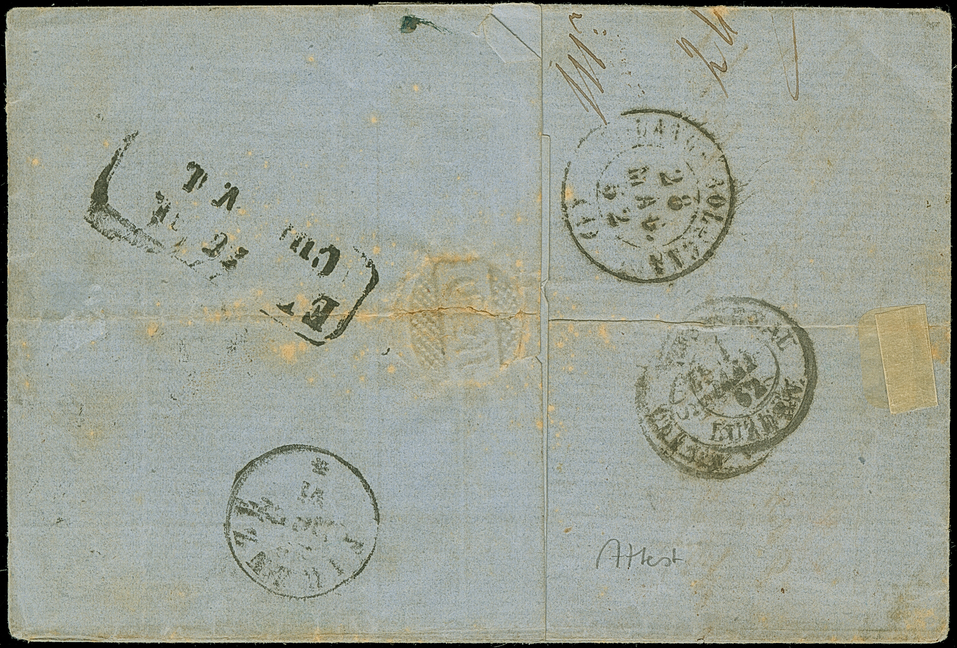 5 Ngr. ziegelrot, 2 Ngr. auf blau und 2 Einzelwerte 1851/63,3 Pfennig grün, mit Doppelkreisstempel Dresden-NEUST. 25 V 62 auf Briefkuvert mit Leitvermerk "Über Baden und Frankreich", jedoch befördert über Preußen und Frankreich, nach Barrackpoor bei Calcutta. Der Brief war bei Aufgabe für den vorgesehenen Leitweg vollständig frankiert mit 9 9/10 Ngr. (Weiterfranko von 6 9/10 Ngr. korrekt notiert), jedoch zwei links klebend Werte (3 Pfennig und 2 Ngr.) bereits im deutschen Transit abgefallen. Bei Grenzübergang gestempelt mit "P. 36", Ra2 "Affranchisement insuffisante" und Taxstempel "FR. 2 F 16 C" (Strafporto pro Unze). Rückseitig diverse Transit- und Ankunftsstempel sowie “CALCUTTA STEAMLETTER Bg. Indian Do.”. Übliche Beförderungsspuren, das Kuvert außerhalb der Frankatur senkrecht gefaltet. Ein in dieser Form sicherlich einmaliger Brief mit äußerst seltener Destination.