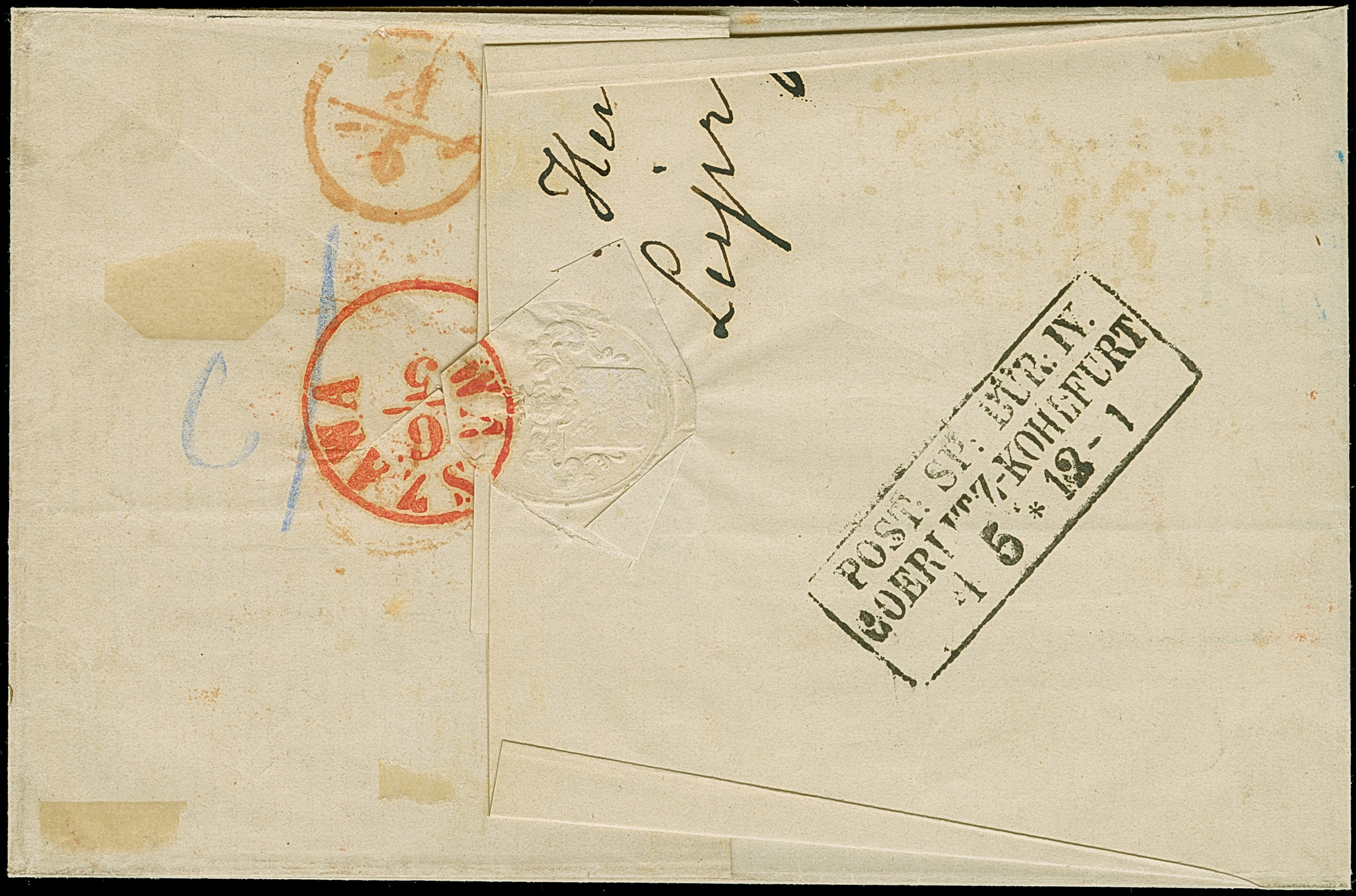 5 Ngr. ziegelrot und 2 Ngr. auf blau, zusammen mit 1851/63, 3 Pfennig grün, mit Nr. 2 und nebengesetztem Doppelkreisstempel "LEIPZIG 29/9 57" auf komplettem Faltbrief über Triest nach Smyrna. Das Porto in das Osmanische Reich setzt sich zusammen aus 3 Ngr. Vereinsporto und 12 österreichische Kreuzer (= 4 2/10 Ngr.) Weiterfranko. Die Frankatur nicht ganz einwandfrei und Brief mit etwas Patina. Eine sehr seltene Frankatur vor der österreichischen Währungsreform; in die Türkei hat PROFI keine weitere solche Frankatur registriert.