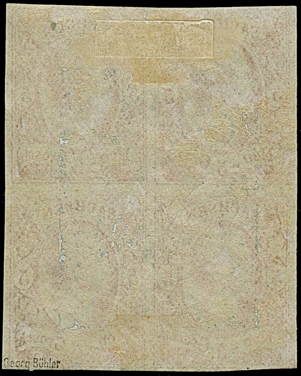 5 Ngr. scharlachrot im Viererblock, unten links berührt, sonst voll- bis breitrandig, ungebraucht mit großen Teilen des Originalgummis (kann Herr Vaatz nicht sicher bestätigen). Signiert Georg Bühler.