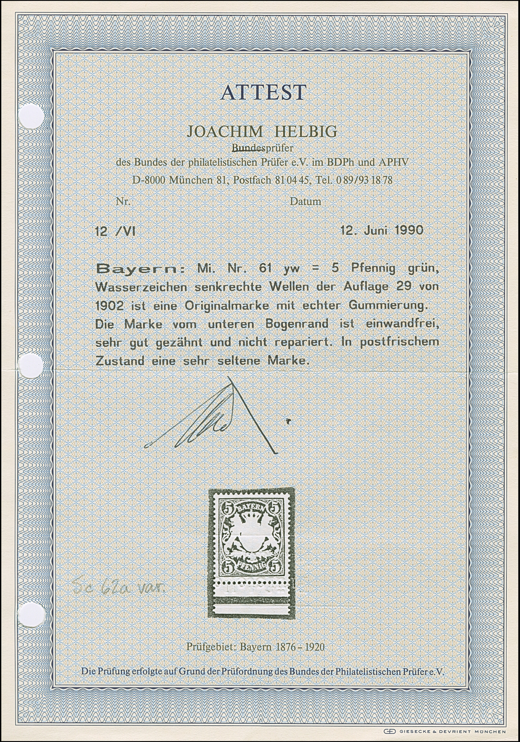 1890, 5 Pfennig grün auf Papier y mit Wasserzeichen 3, Unterrandstück, postfrisch. Tadellos und unsigniert. Fotoattest Helbig BPP (1990)
