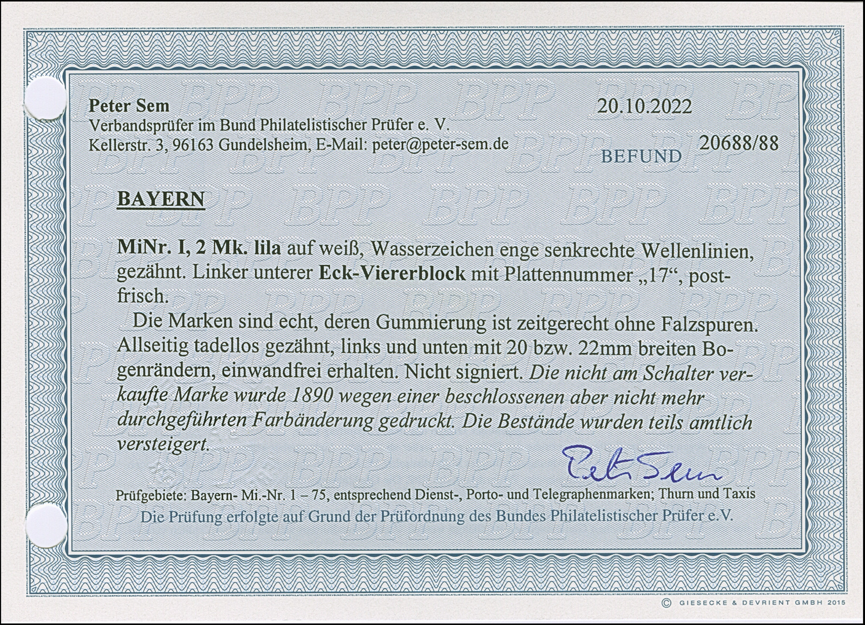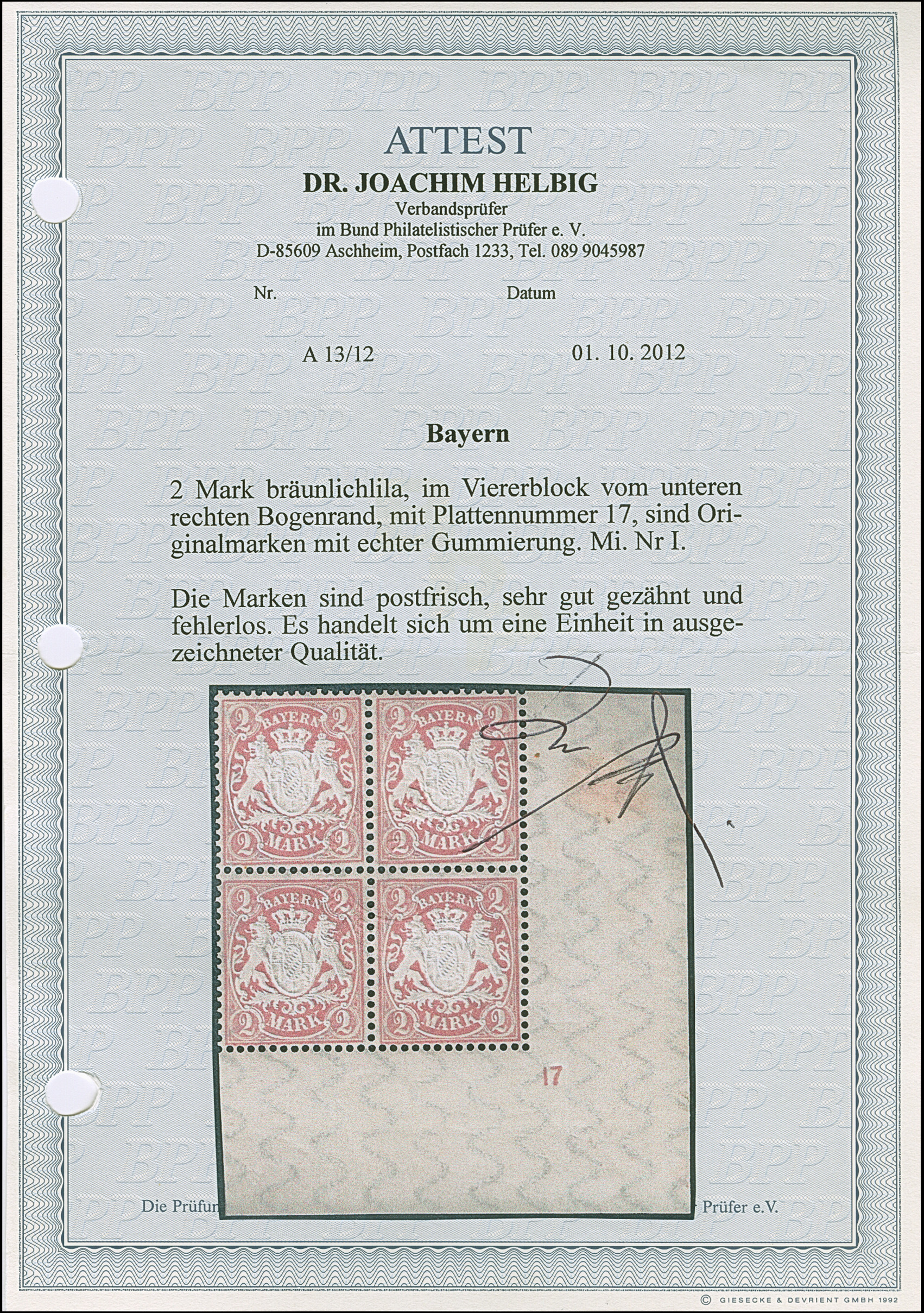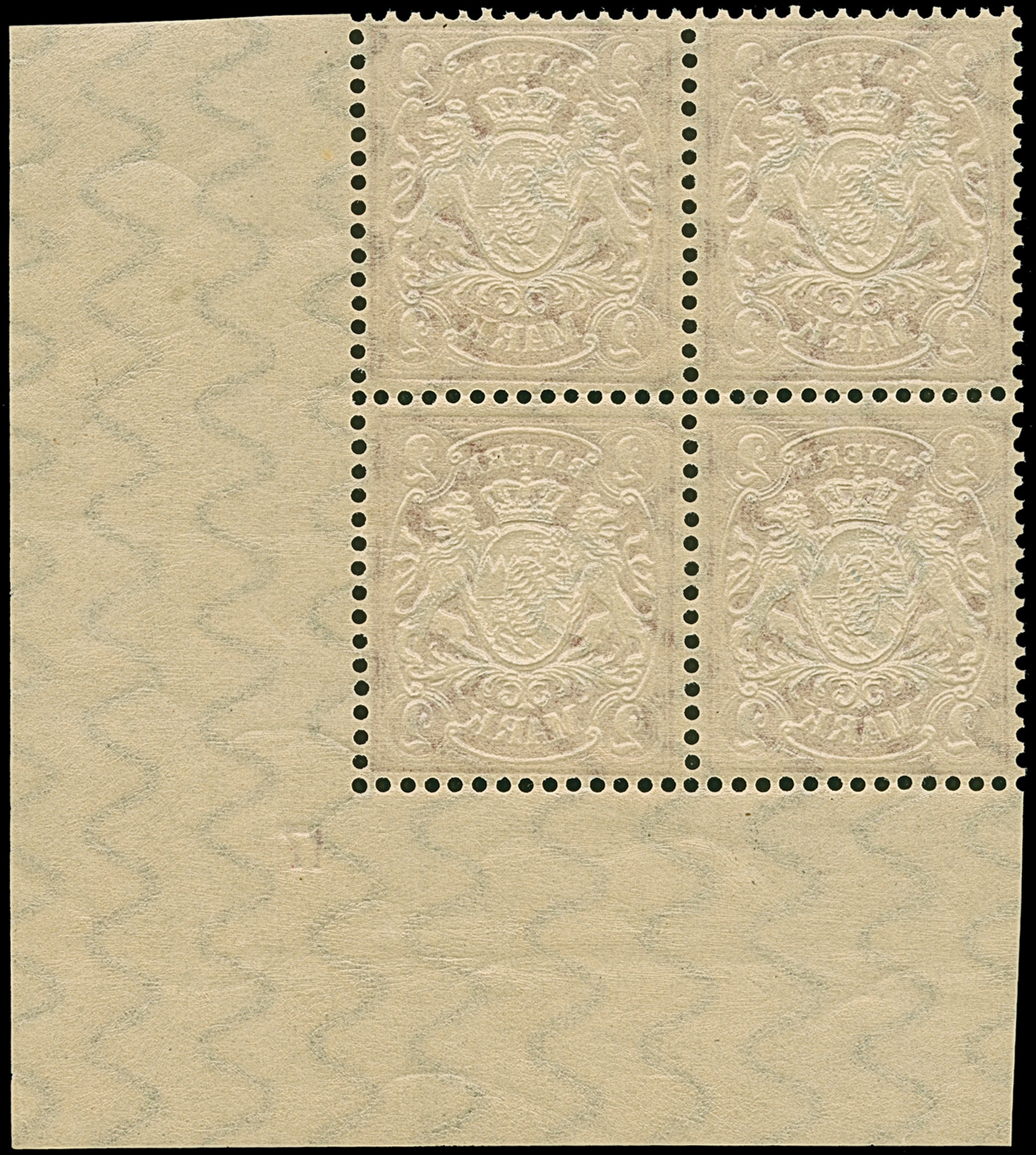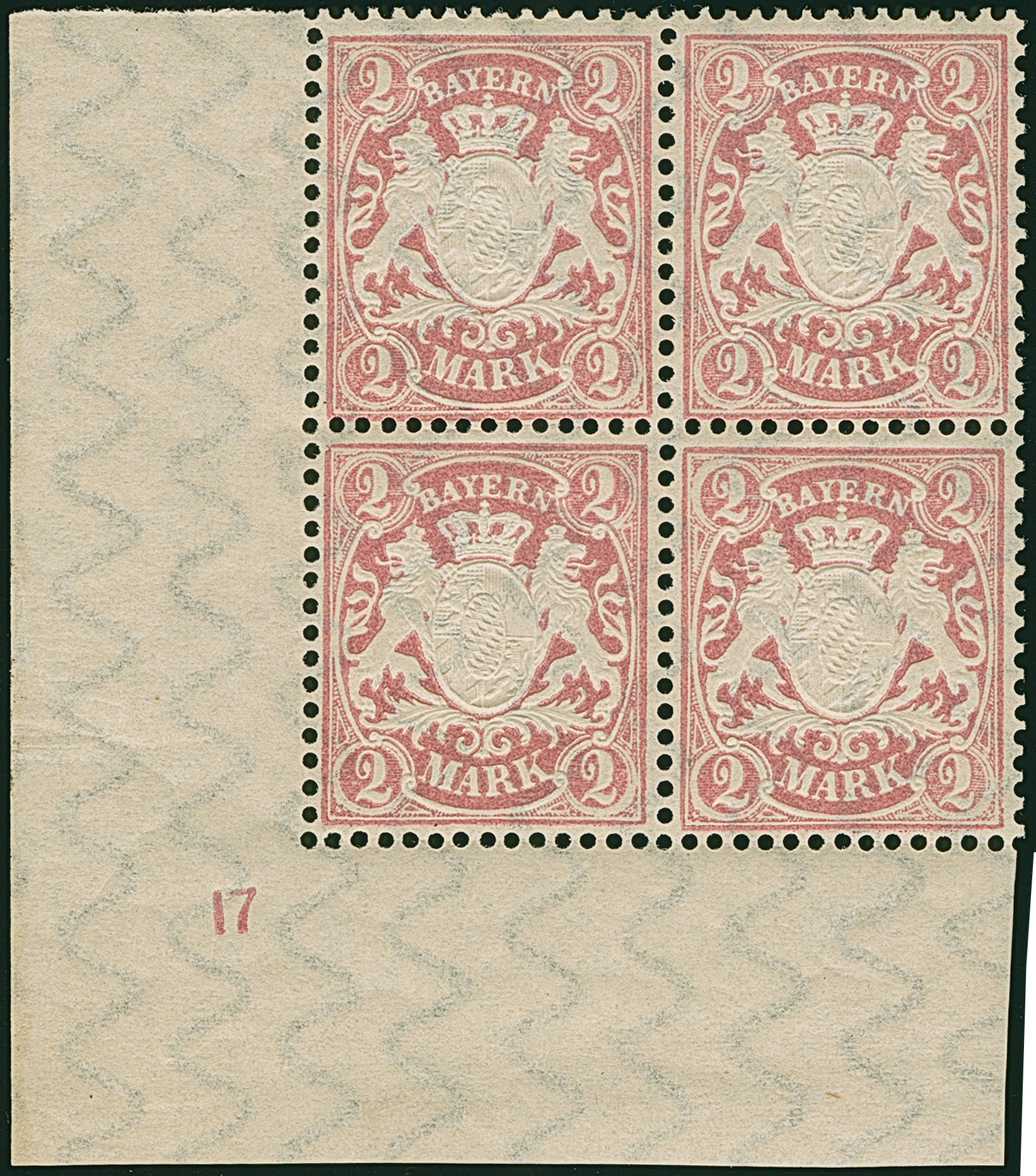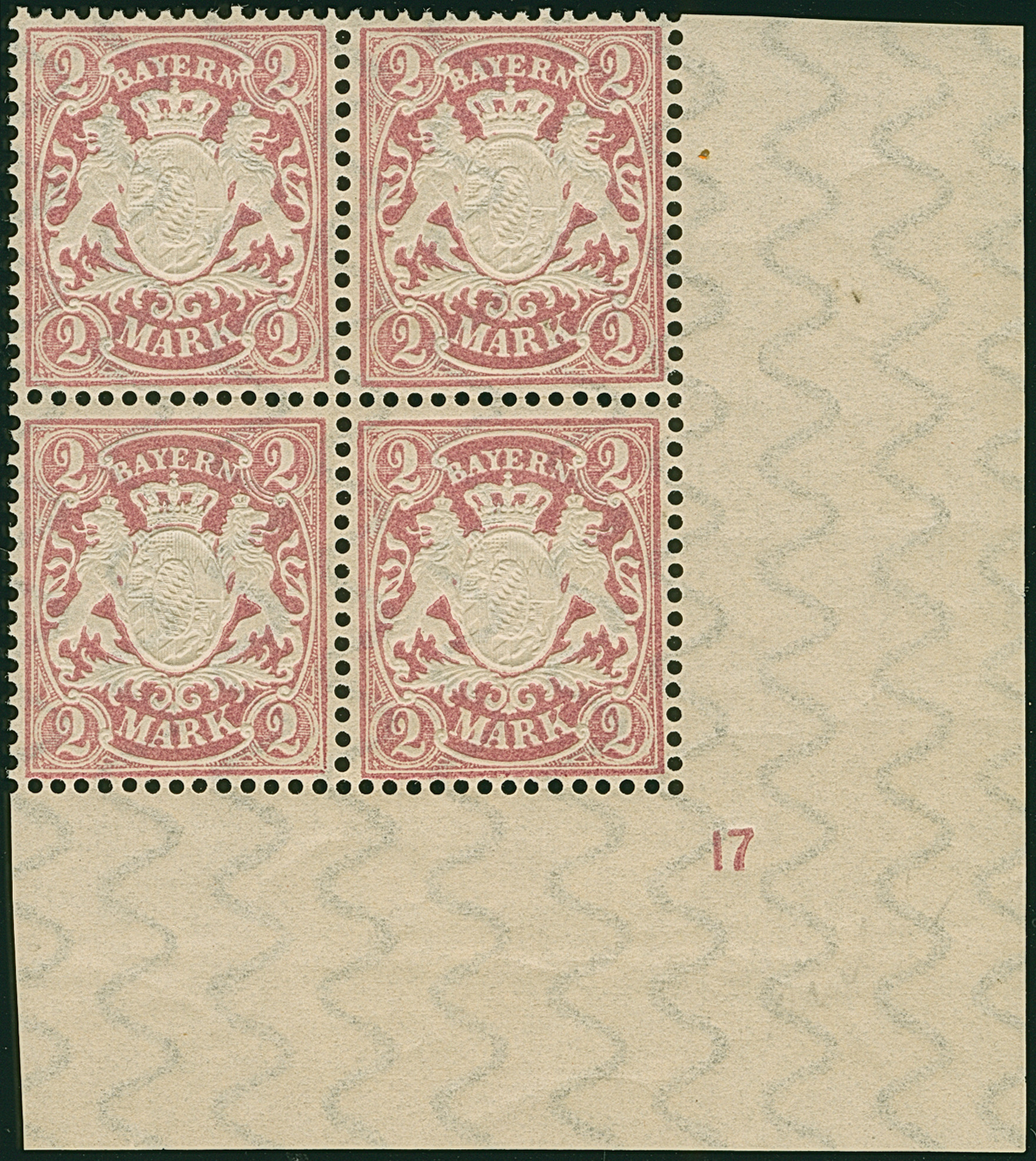 1890, unverausgabte 2 Mark mittelbräunlichlila, rechter unterer Eckrand-4er-Block mit Pl.-Nr. "17", postfrisch. Einwandfrei. Signiert 'Bay. St. Min. D. Fin.'. Fotoattest Dr. Helbig BPP (2012)