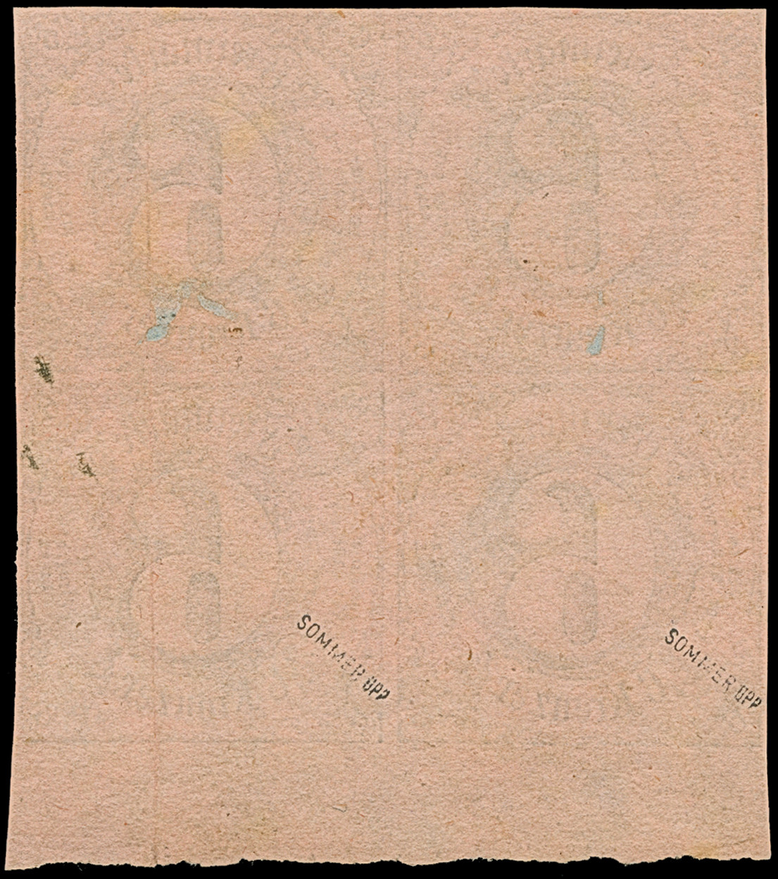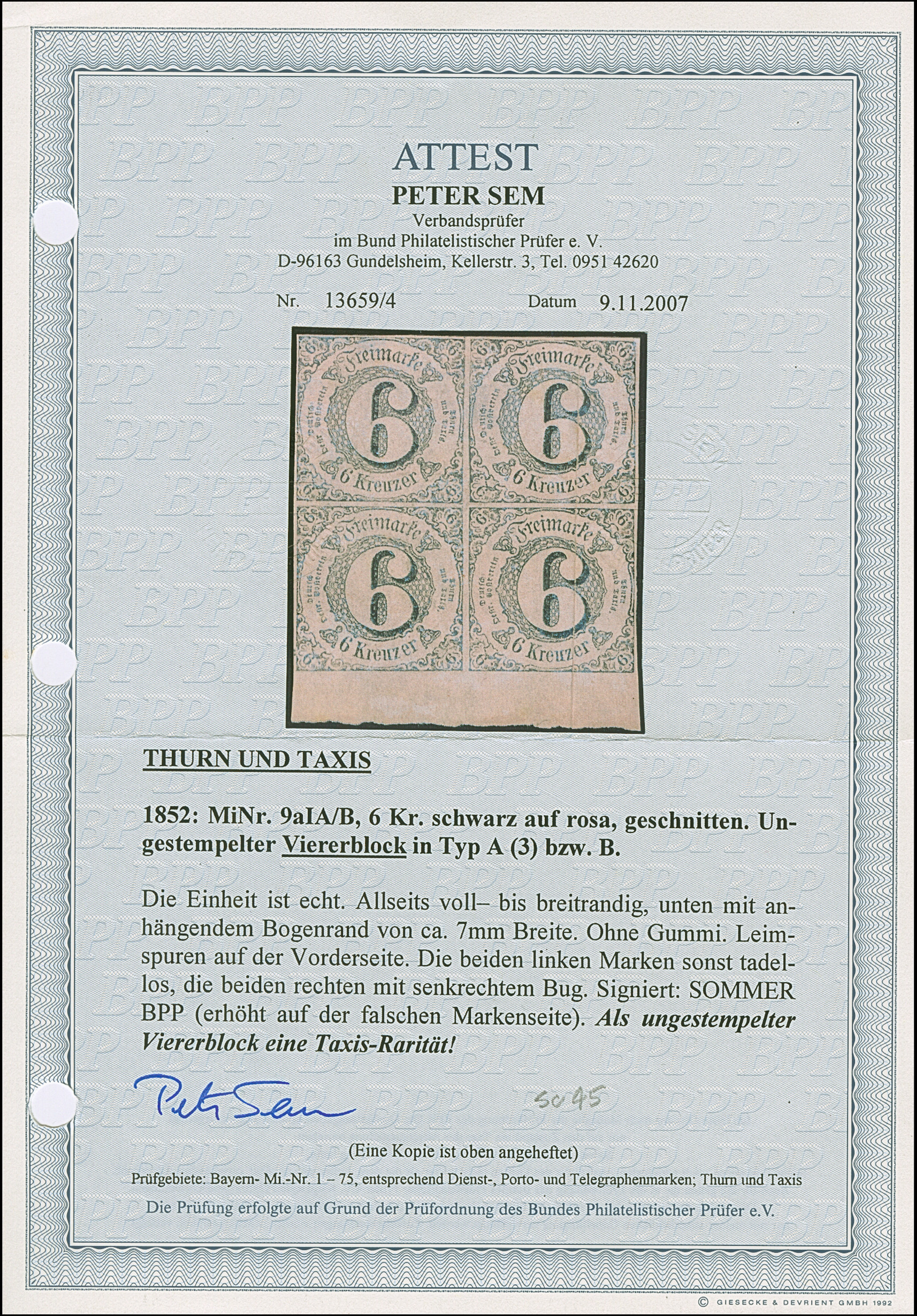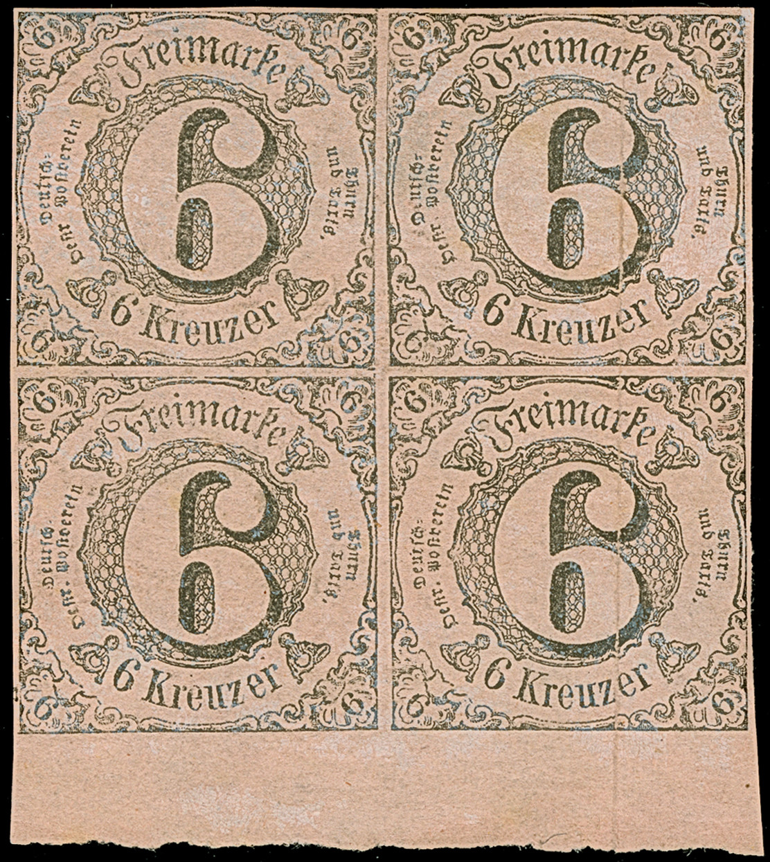 6 Kreuzer auf rosa im 4er-Block, dabei ein Wert in Type B, farbfrisch und voll- bis breitrandig geschnitten, unten mit ca. 7 mm Bogenrand, ungebraucht ohne Gummi; vorderseitig unauffällige Leimspuren sowie senkrechter Bug durch das rechte Paar. Eine außerordentlich seltene Einheit, PROFI hat nur einen weiteren ungebrauchten 4er-Block dieser Marke registriert (ebenfalls ohne Gummi). Signiert Sommer BPP und Fotoattest Sem BPP (2007)