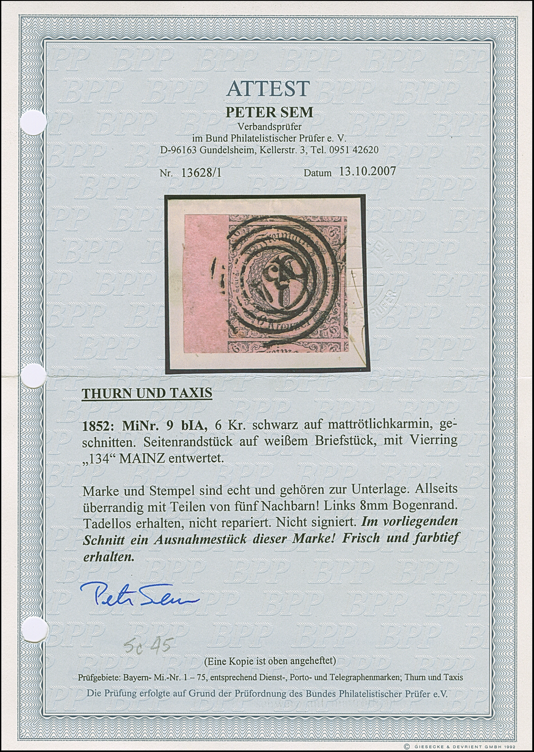 6 Kreuzer auf mattrötlichkarmin, überrandiges linkes Randstück mit Teilen aller 5 Nachbarmarken und links ca. 8 mm Bogenrand, mit sauber aufgesetzter Nr. "134" MAINZ auf Briefstück. Ein Ausnahmestück in tadelloser Erhaltung. Fotoattest Sem BPP (2007)