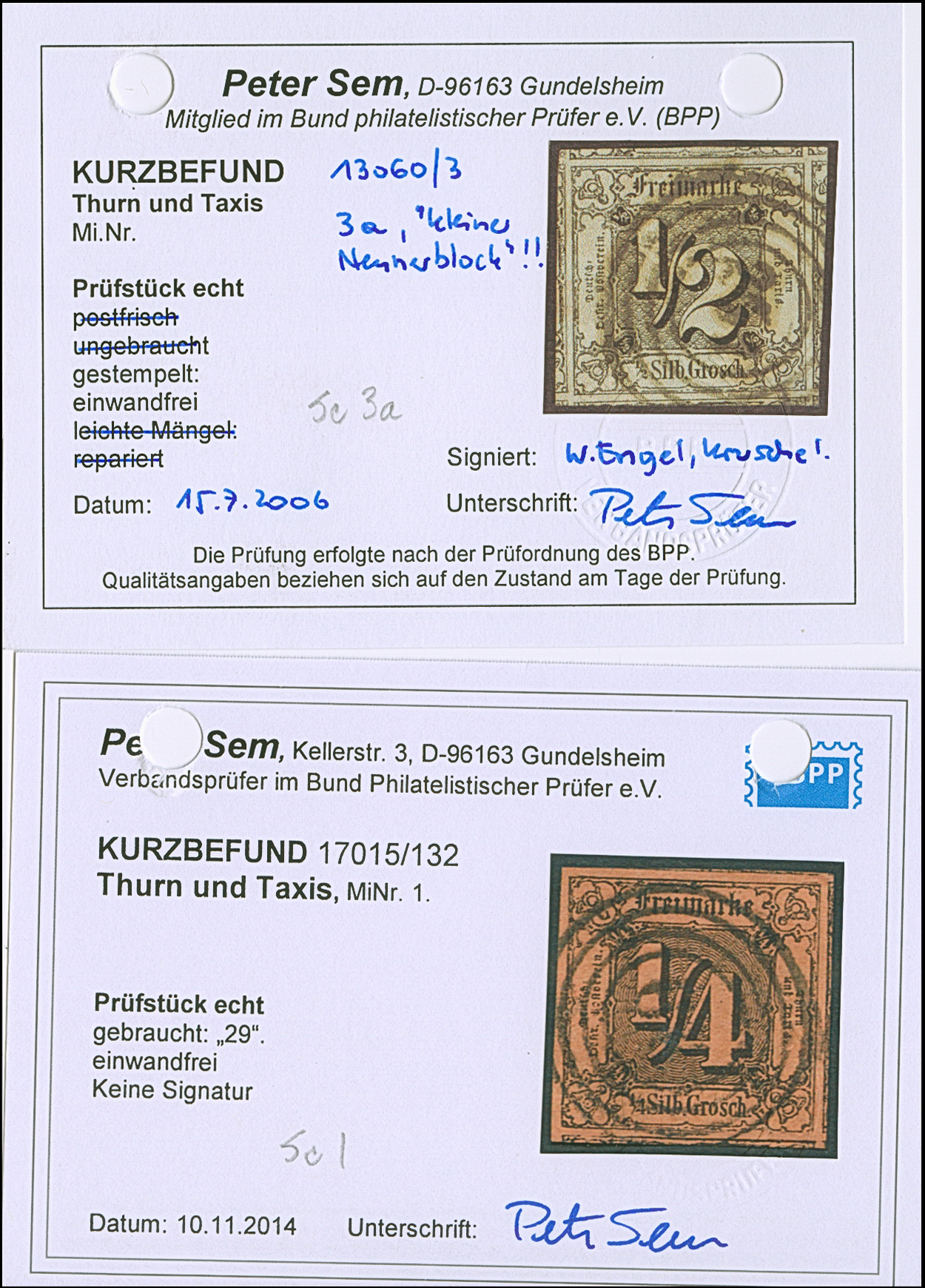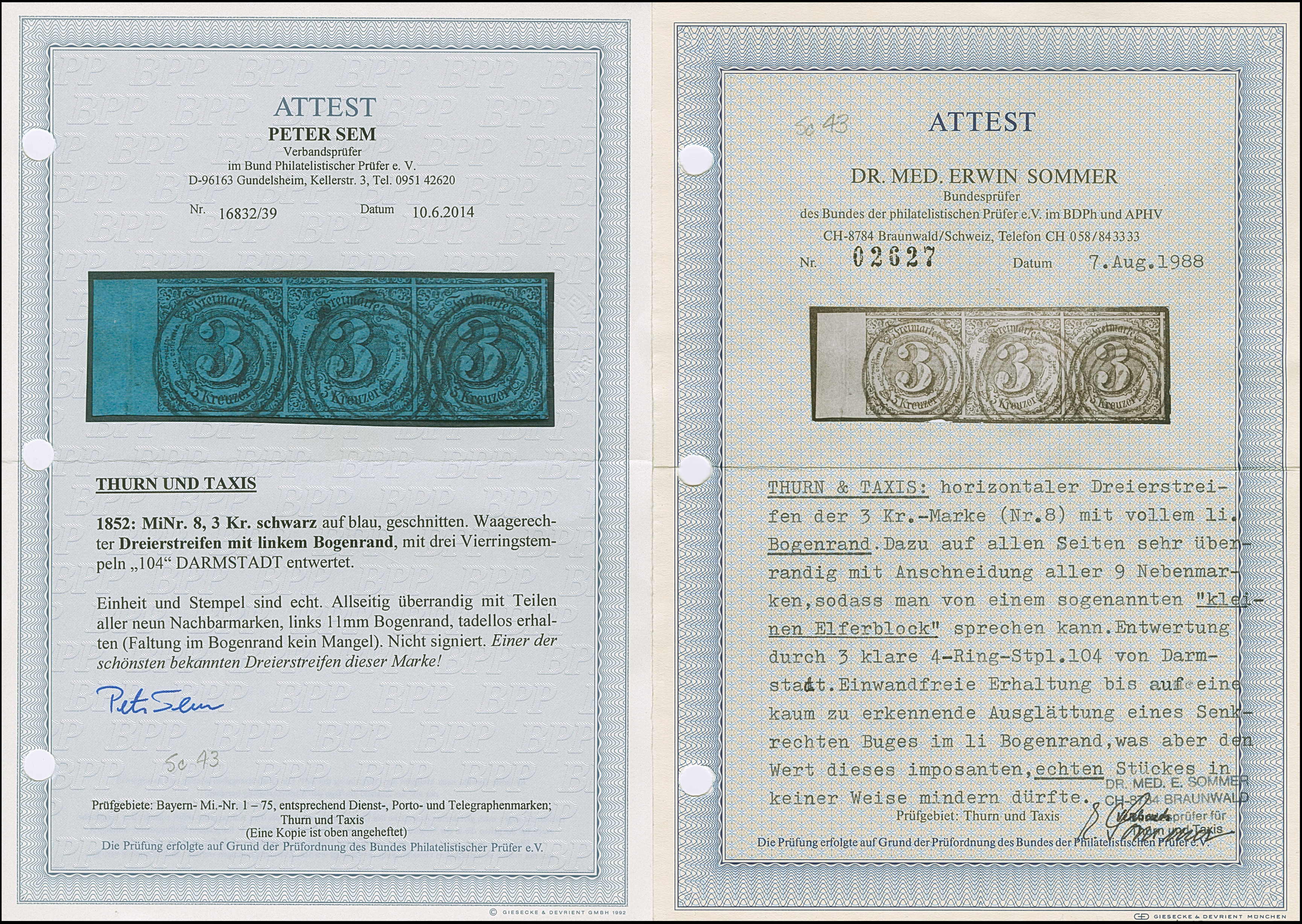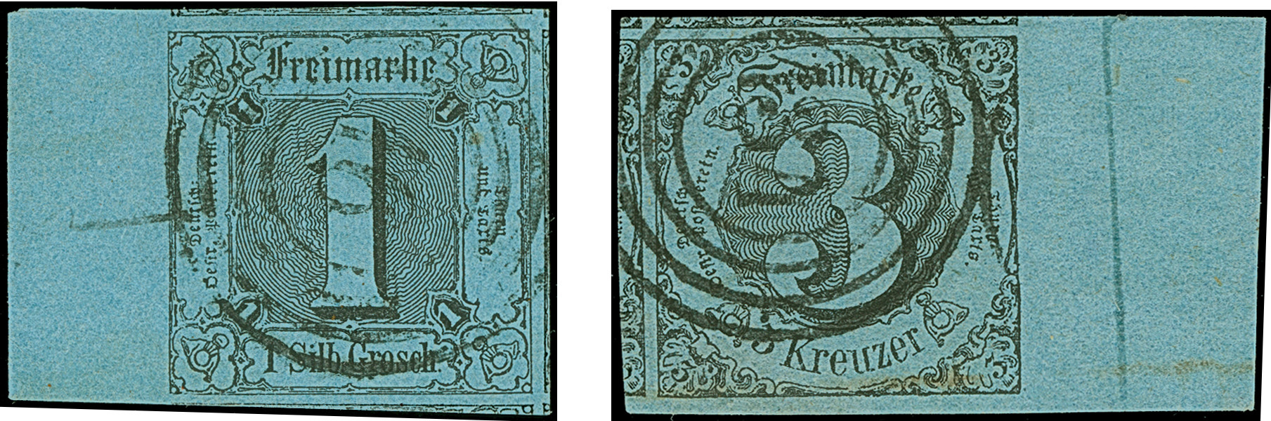 1 Silbergroschen auf graublau und 3 Kreuzer auf graublau, beide allseits überrandig mit Teilen aller 8 Nachbarmarken (sogenannte kleine 9er-Blocks), 1 Silbergroschen mit zentrischer Nr. "291" GERA, 3 Kreuzer mit Nr."220" FRANKFURT auf Briefstück; letztere leichte waagerechte Bugspur, sonst tadellos. Ein Ausnahmepärchen. Signiert bzw. Fotobefund Sem BPP.
