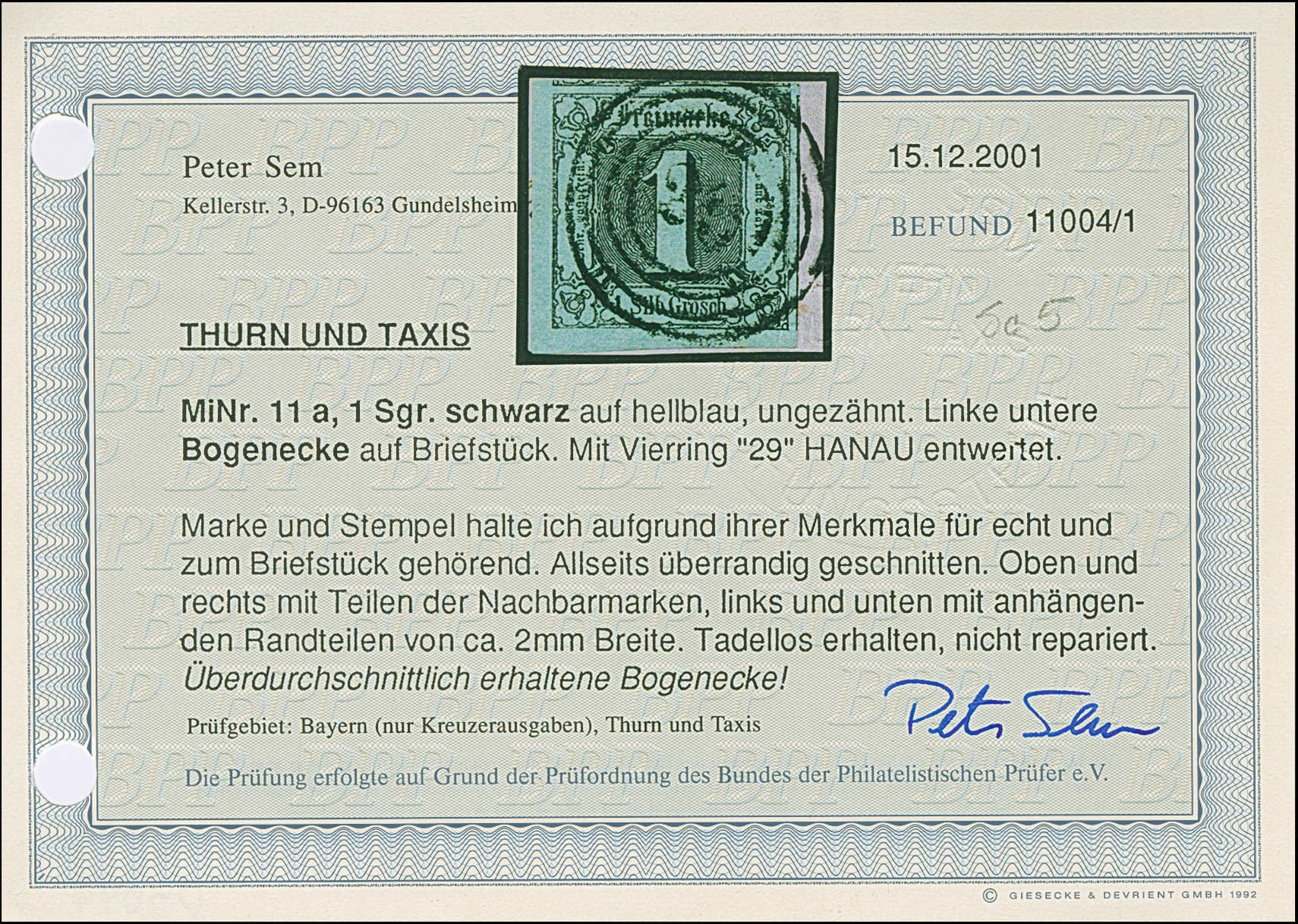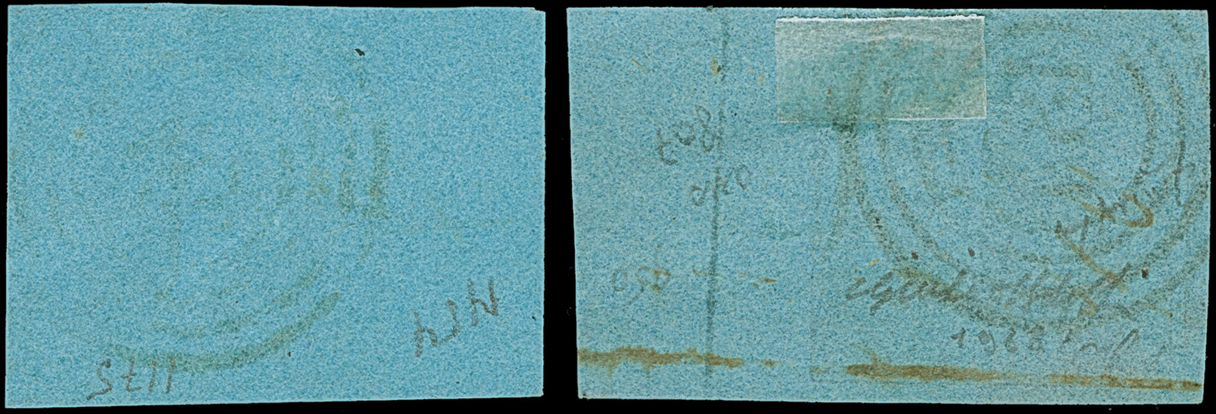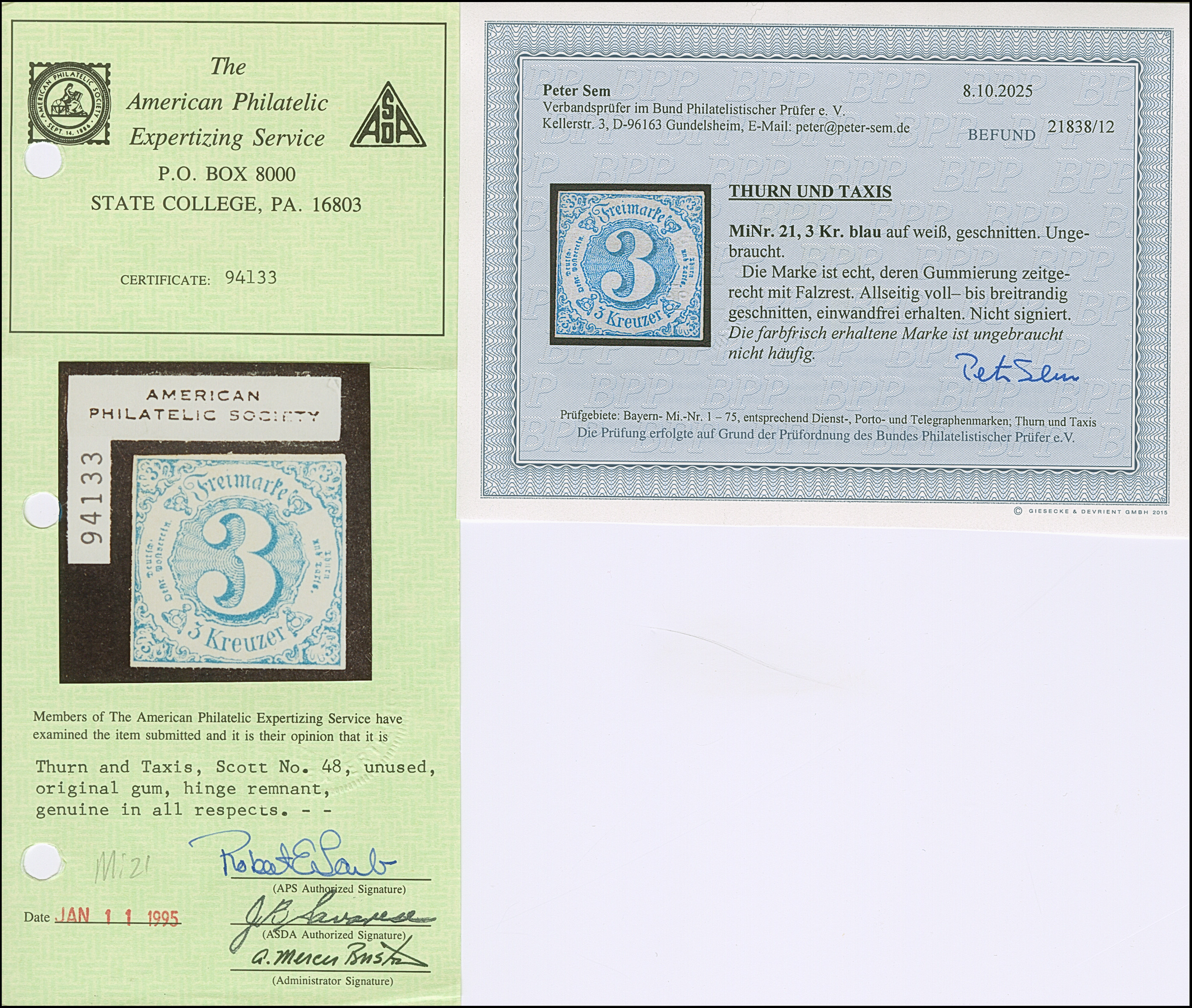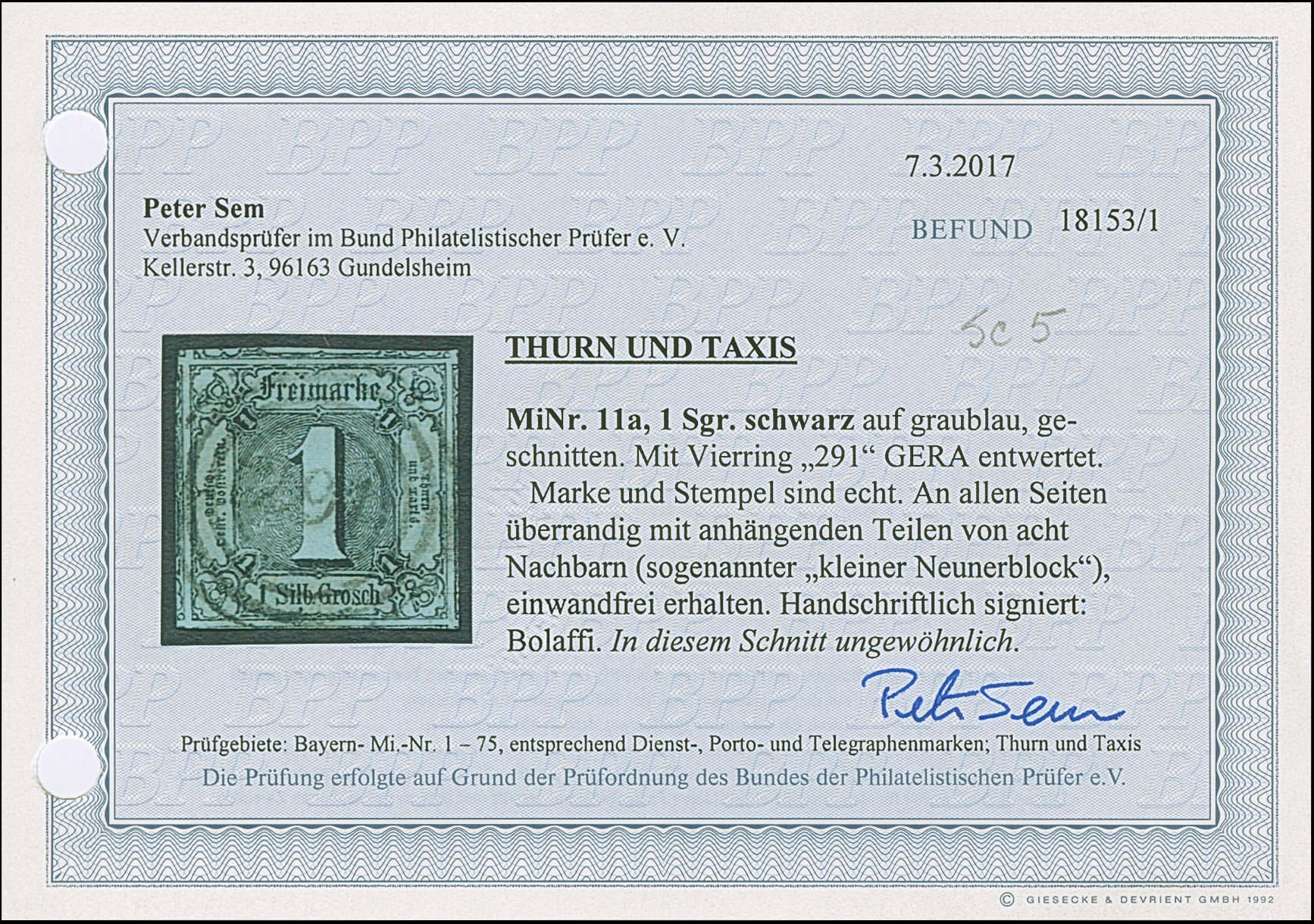 1 Silbergroschen auf graublau und 3 Kreuzer auf graublau, beide allseits überrandig mit Teilen aller 8 Nachbarmarken (sogenannte kleine 9er-Blocks), 1 Silbergroschen mit zentrischer Nr. "291" GERA, 3 Kreuzer mit Nr."220" FRANKFURT auf Briefstück; letztere leichte waagerechte Bugspur, sonst tadellos. Ein Ausnahmepärchen. Signiert bzw. Fotobefund Sem BPP.
