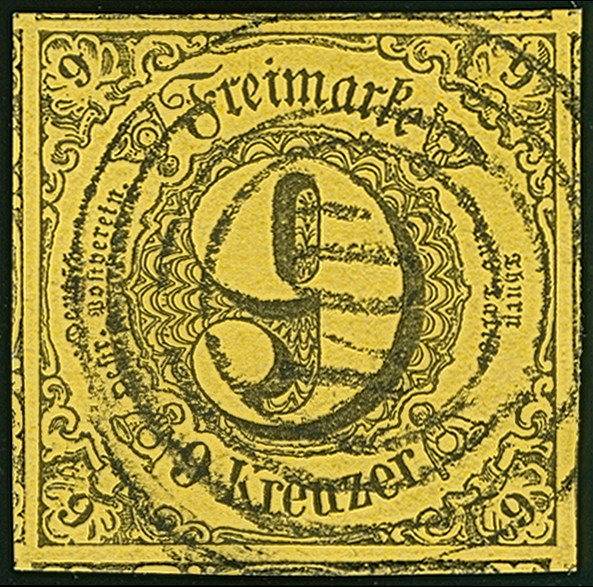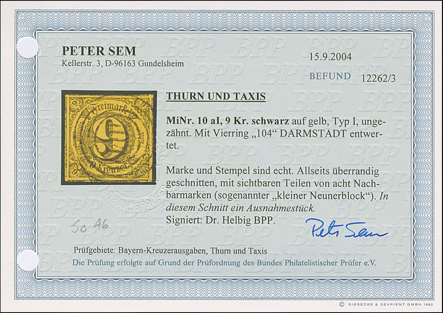 9 Kreuzer auf gelb, Type I, farbfrisch und allseits überrandig, mit Teilen aller 8 Nachbarmarken (sogenannter 'Kleiner 9er-Block'), sauber und zentrisch entwertet durch Nr. "104" DARMSTADT. Tadellos. Ein Ausnahmestück. Signiert Dr. Helbig BPP und Fotobefund Sem BPP (2004)