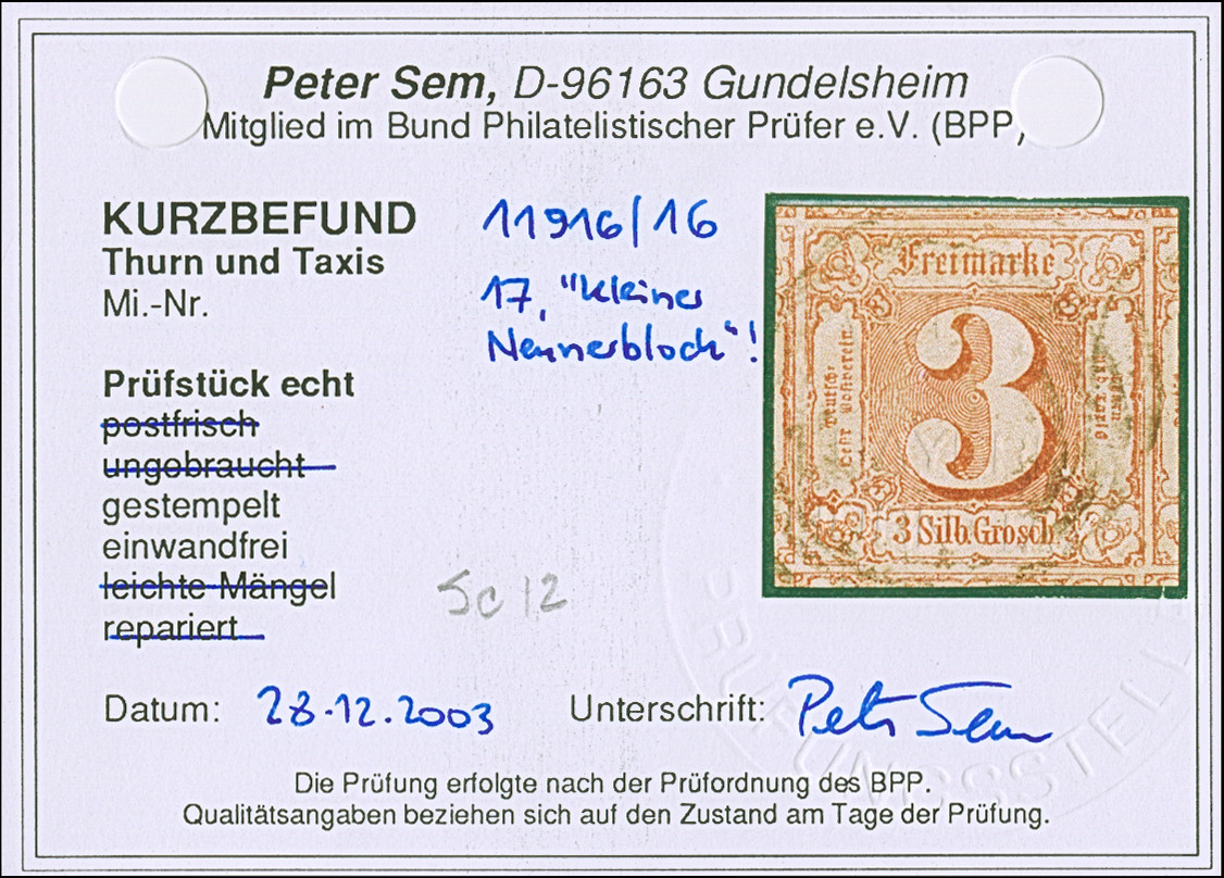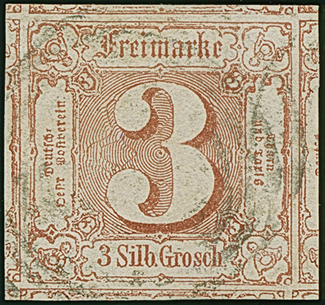 3 Silbergroschen bräunlichrot, farbfrisch und allseits überrandig, mit meist größeren Teilen aller 8 Nachbarmarken (sogenannter 'Kleiner 9er-Block'), leicht gestempelt. Ein 'Schnitt- Riese' in einwandfreier Erhaltung. Kurzbefund Sem BPP