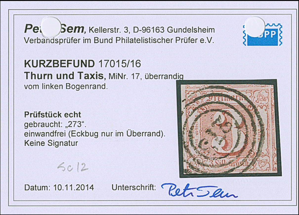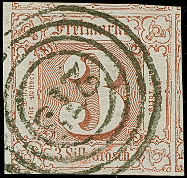 3 Silbergroschen bräunlichrot, farbfrisch und allseits überrandig, mit Teilen von 4 Nachbarmarken und schmalem Bogenrand links, sauber entwertet durch Nr. "273" GOTHA. Einwandfrei (kleiner Eckbug nur im Überrand). Kurzbefund Sem BPP