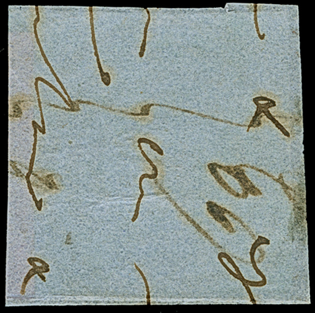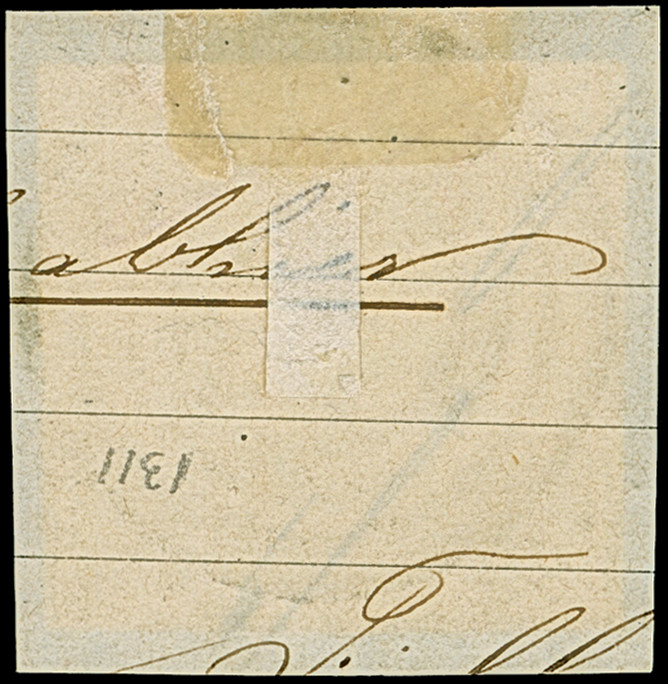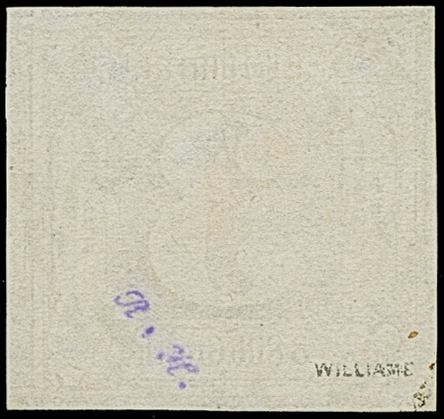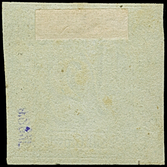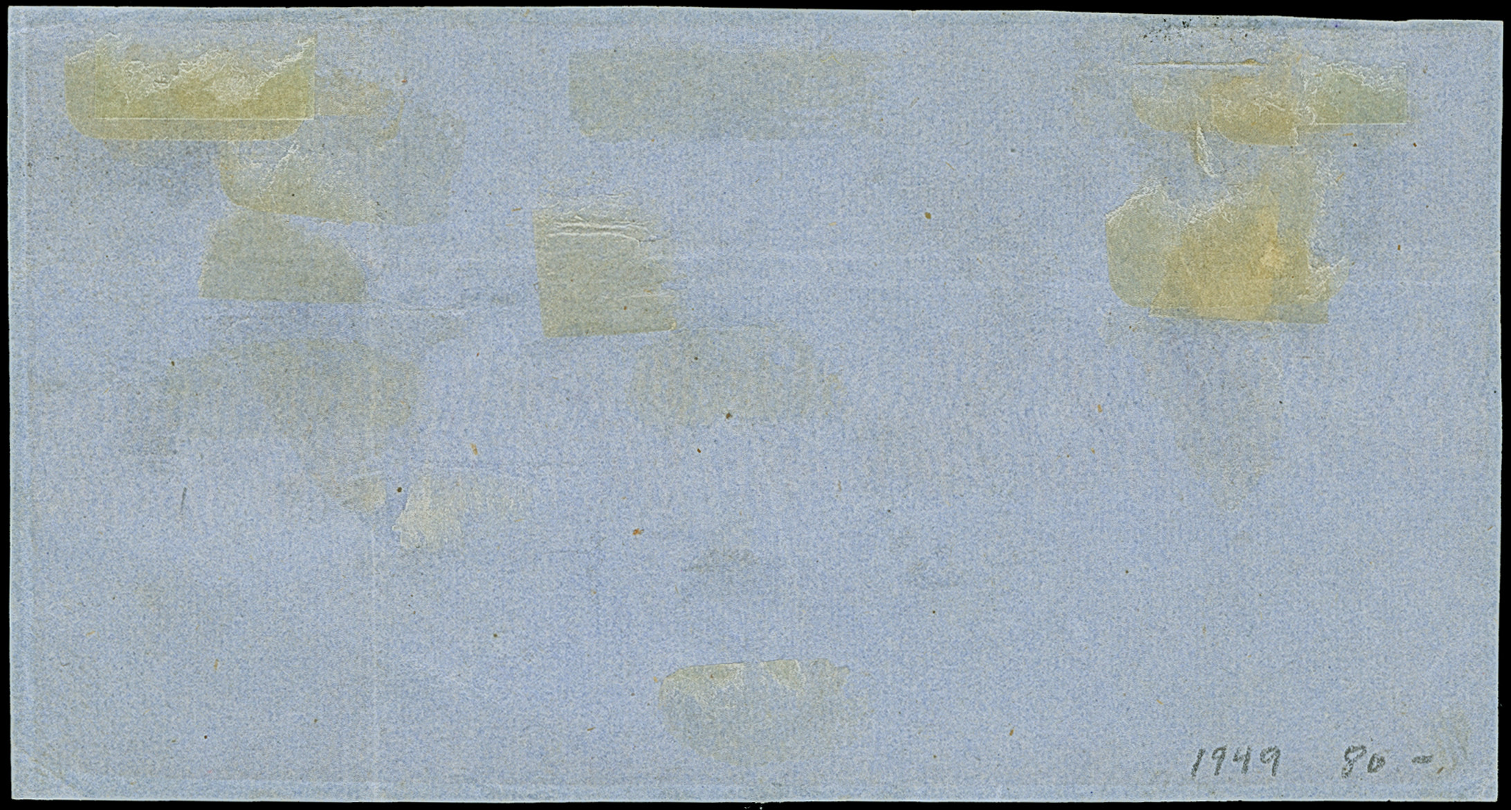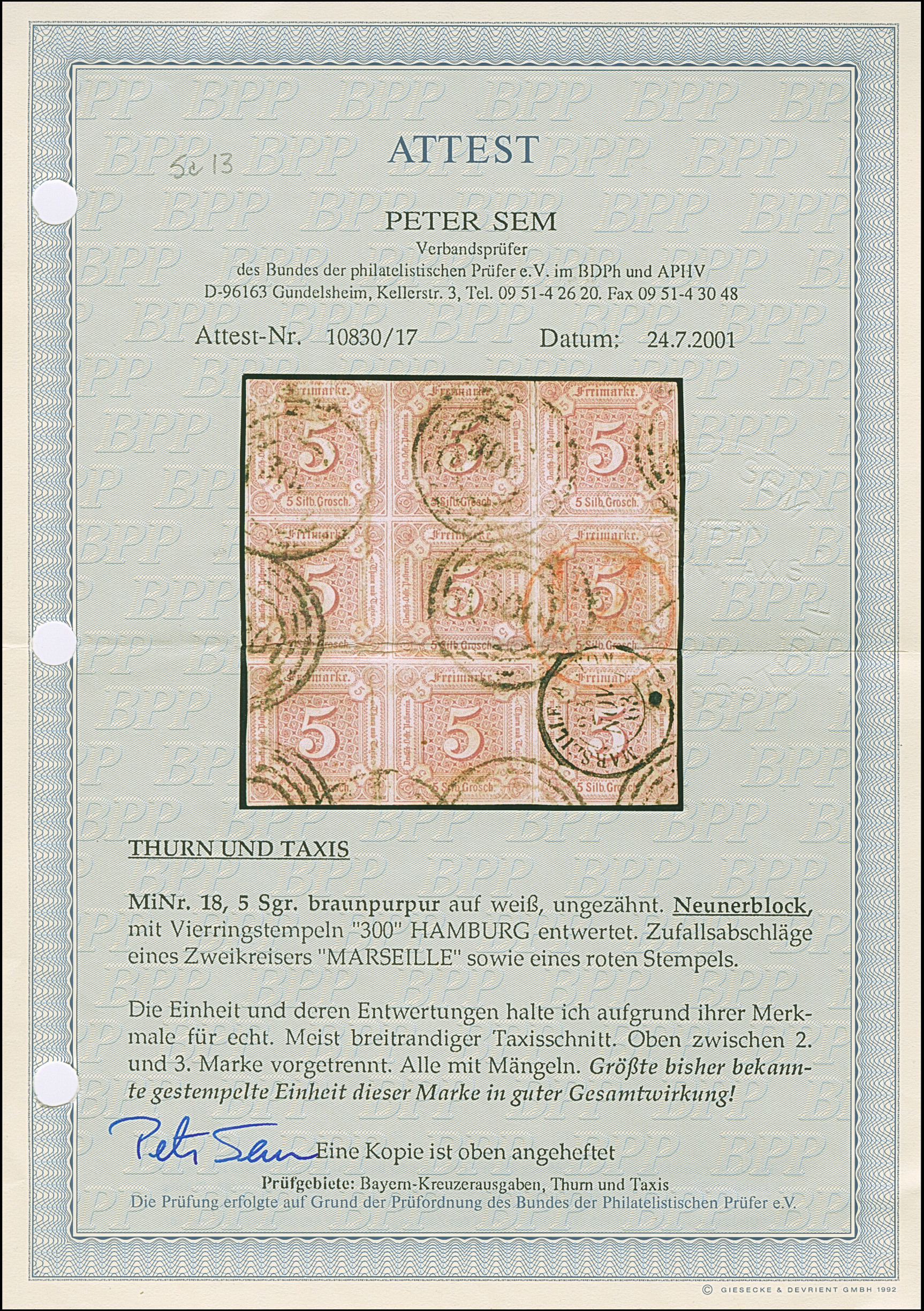 5 Silbergroschen braunpurpur im 9er-Block, oben etwas angeschnitten und rechts unten leicht berührt, sonst voll- bis überrandig, entwertet durch Nr. "300" HAMBURG sowie Transitstempel von Marseille und rotem Stempel. Unauffällig fehlerhaft (geglättete Bugspuren), aber insgesamt schöne und attraktive Erhaltung. Größte registrierte gebrauchte Einheit dieser Marke und Unikat. Fotoattest Sem BPP (2001)