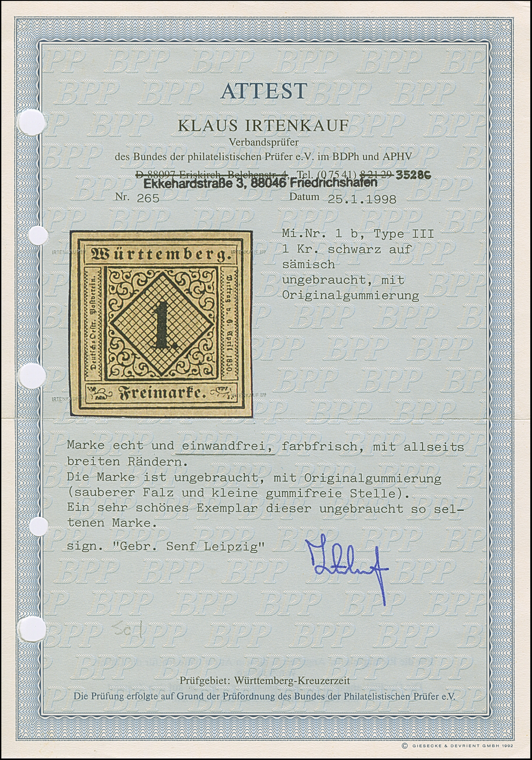 1 Kreuzer auf sämisch, Type III, farbfrisch und allseits gleichmäßig breitrandig, ungebraucht mit frischem Originalgummi. Ein sehr schönes und tadelloses Exemplar dieser sehr seltenen ungebrauchten Marke. Signiert Gebrüder Senf, Fotoattest Irtenkauf BPP (1998)