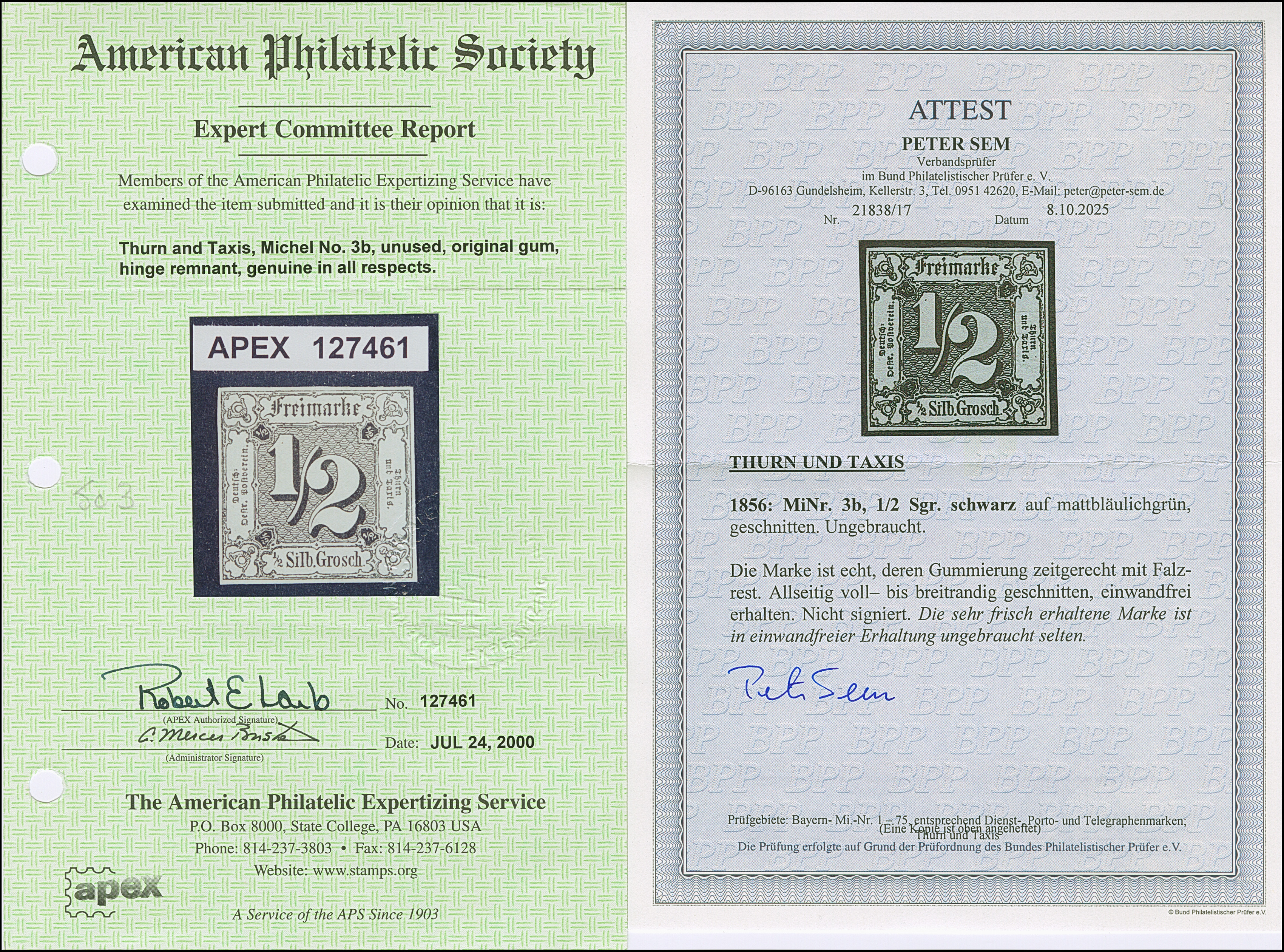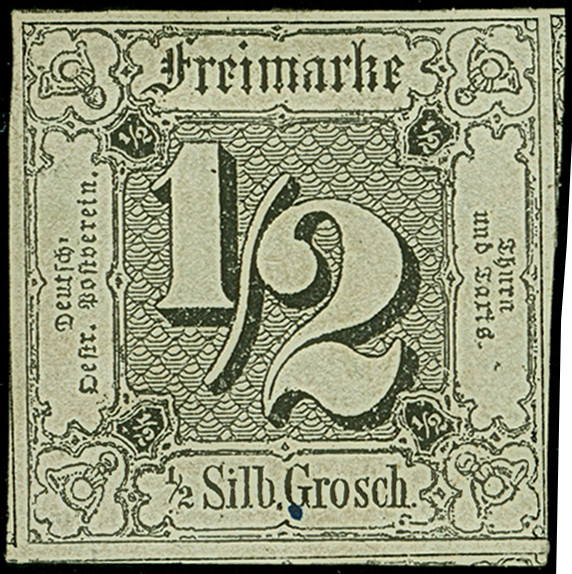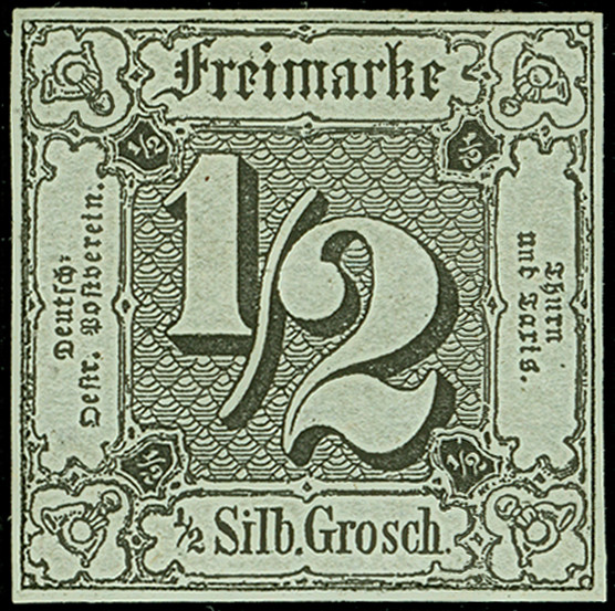 ½ Sgr. auf mattbläulichgrün, sehr schöne frische Farbe und allseits gleichmäßig breitrandig, ungebraucht mit Originalgummi. In dieser Erhaltung sehr selten. Fotoattest Sem BPP (2025)