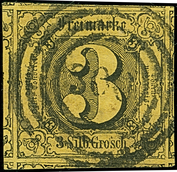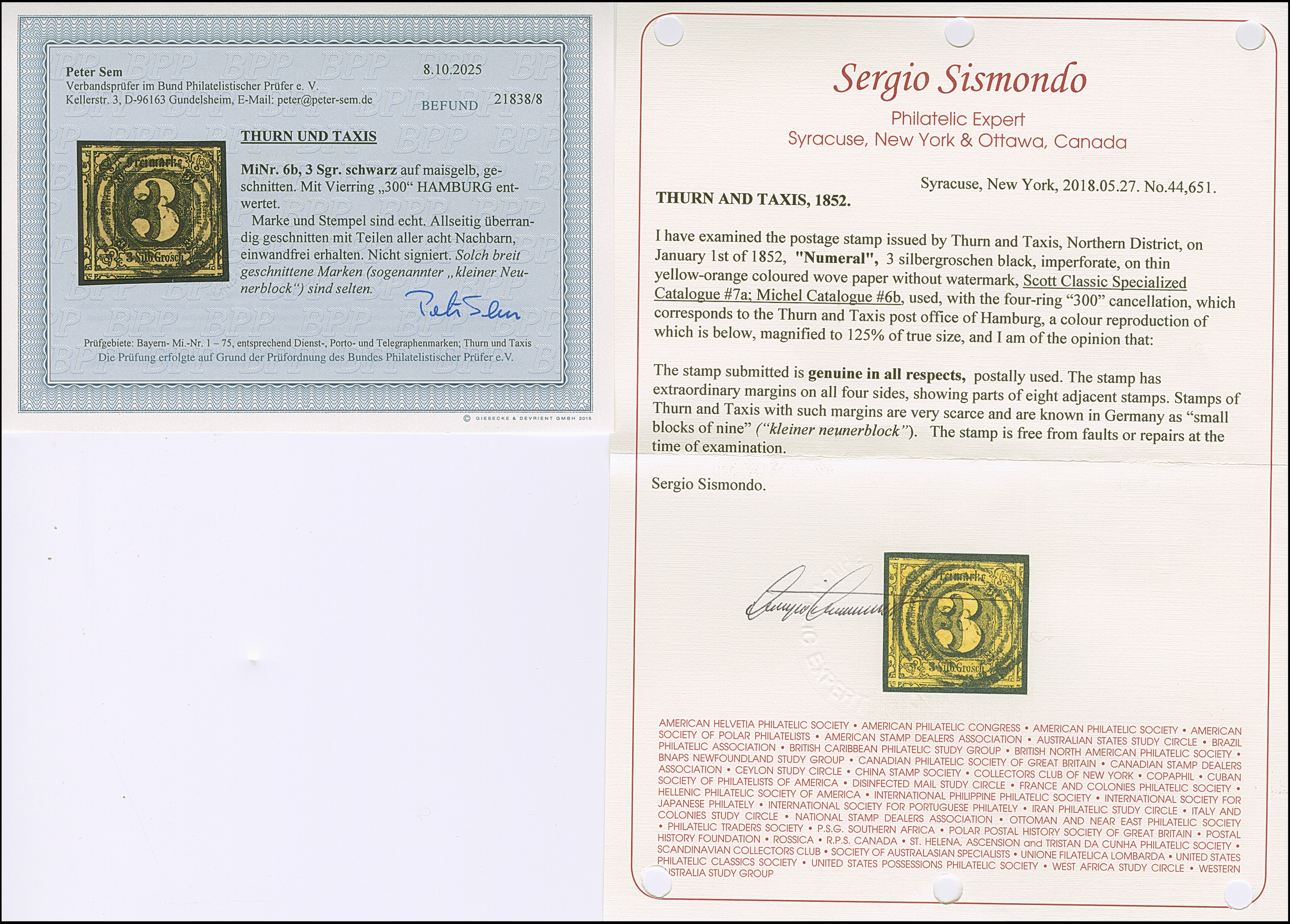 3 Sgr. auf maisgelb, allseits überrandig, mit Teilen aller 8 Nachbarmarken (sogenannter 'Kleiner 9er-Block'), zentrisch entwertet durch Nr. "301" HAMBURG. Ein Ausnahmestück in tadelloser Erhaltung. Fotobefund Sem BPP (2025)