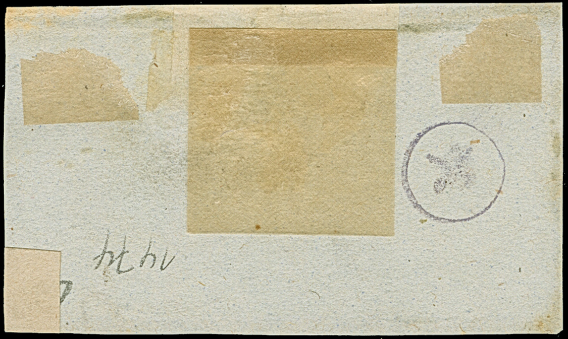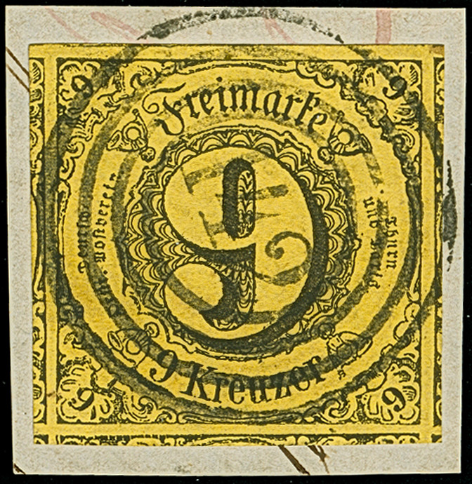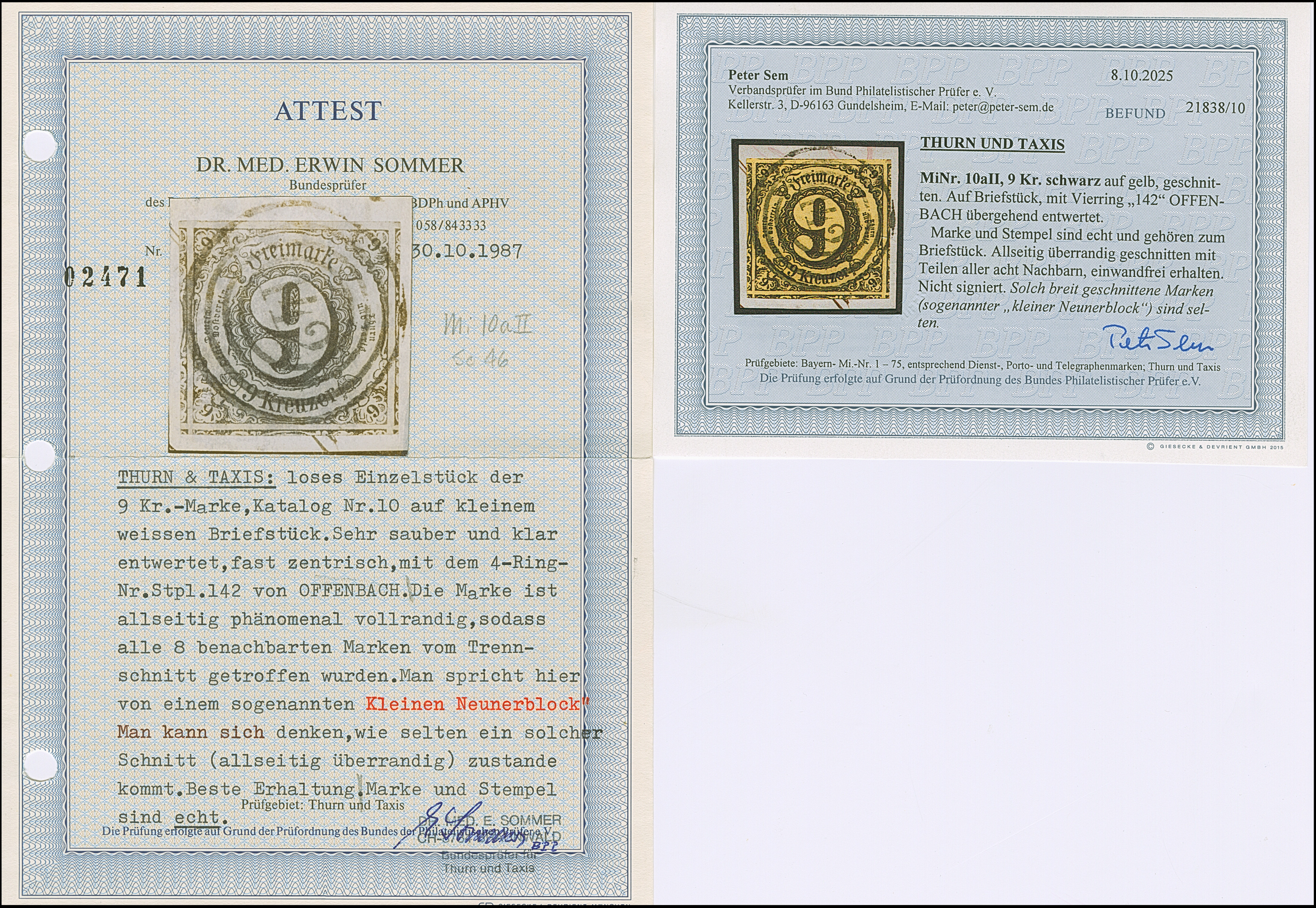 9 Kr. auf gelb, Type II, allseits überrandig, mit Teilen aller 8 Nachbarmarken (sogenannter 'Kleiner 9er-Block'), mit zentrischer Nr. "142" OFFENBACH auf kleinem Briefstück. Ein Ausnahmestück in tadelloser Erhaltung. Fotobefund Sem BPP (2025)