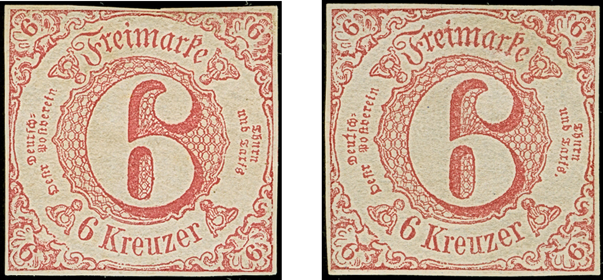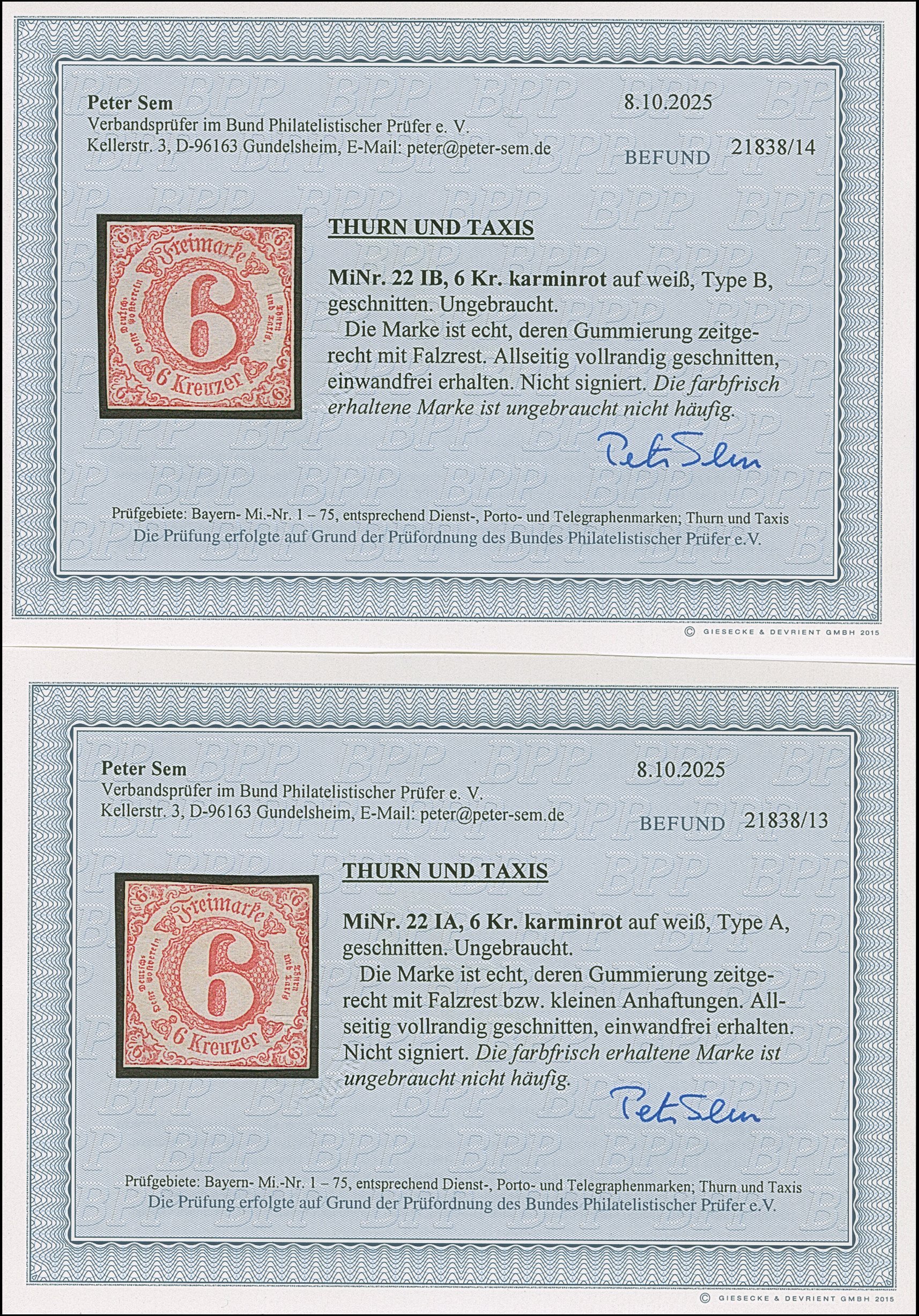 6 Kr. dunkelrosarot, 2 Einzelwerte in Type IA bzw. IB, beide farbfrisch und vollrandig, ungebraucht mit Originalgummi. Ein Wert kleine Bleistiftsignatur, jeweils Fotobefund Sem BPP (2025)
