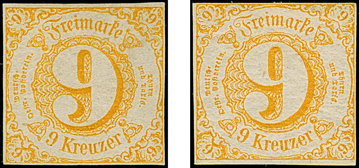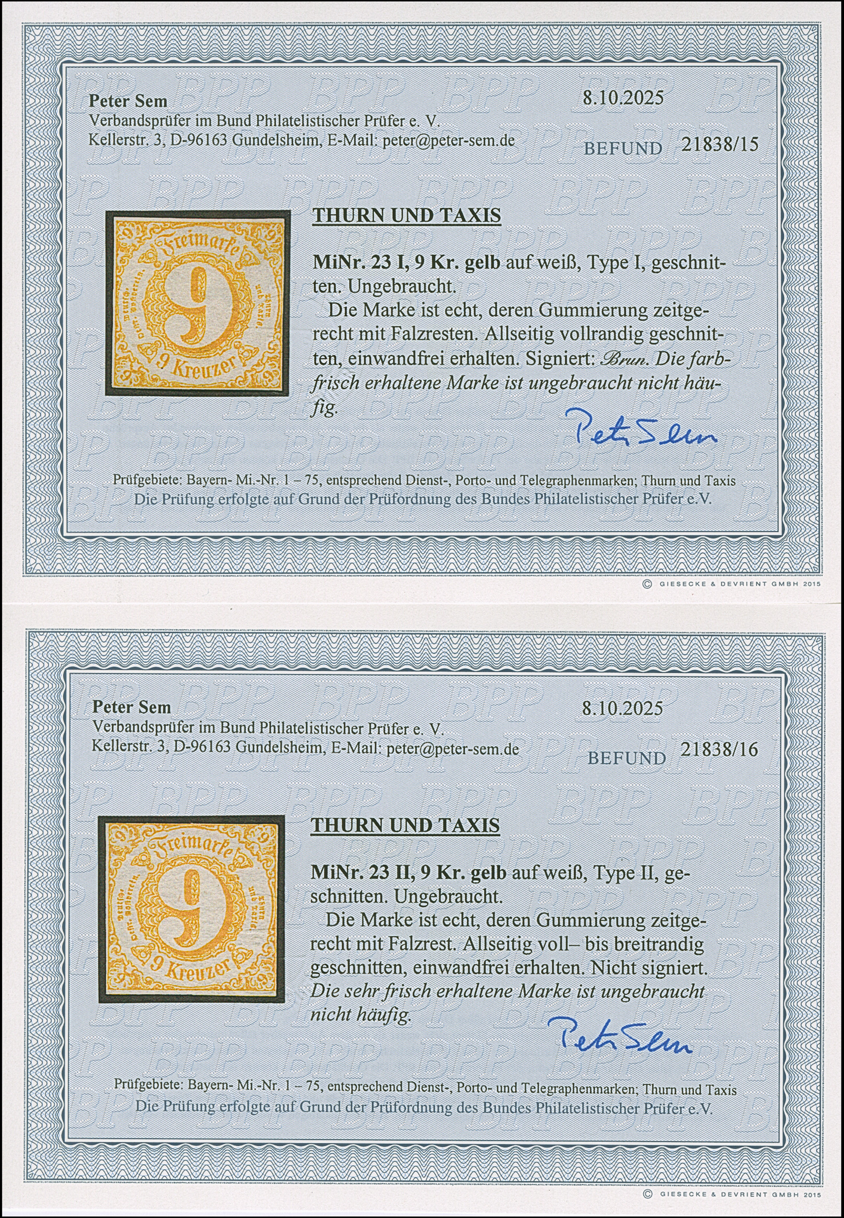 9 Kr. orangegelb, 2 Einzelwerte in Type I bzw. II, beide farbfrisch und vollrandig, ungebraucht mit Originalgummi. Ein Wert signiert Brun, jeweils Fotobefund Sem BPP (2025)