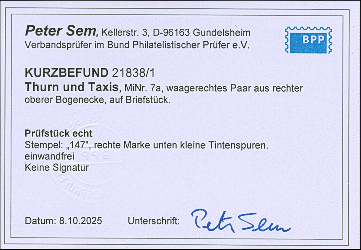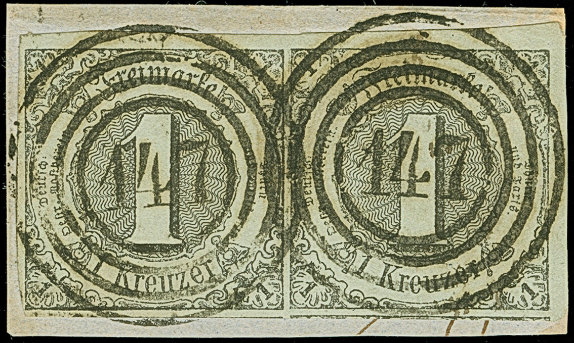 1 Kr. auf graugrün, waagerechtes Paar aus der rechten oberen Bogenecke, allseits überrandig, mit Teilen von 3 Nachbarmarken und ca. 2 mm Bogenrändern, mit klar und gerade aufgesetzter Nr. "147" PFUNGSTADT auf Briefstück. Rechte Marke unten kleine Tintenspur, sonst tadellos. Kurzbefund Sem BPP