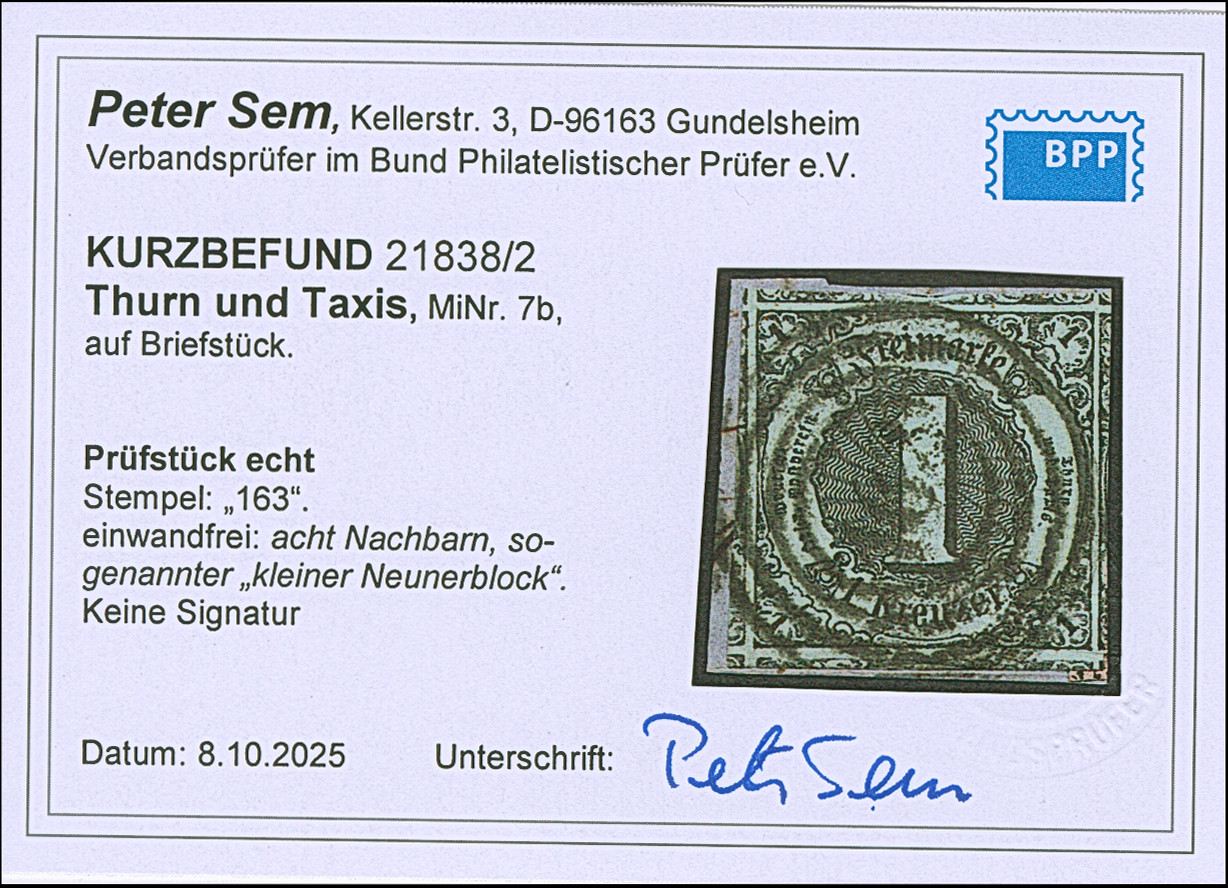 1 Kr. auf mattbläulichgrün, allseits überrandig mit Teilen aller 8 Nachbarmarken (sogenannter 'Kleiner 9er-Block'), mit Nr. "163" WORMS auf kleinem Briefstück. Ein Ausnahmestück. Kurzbefund Sem BPP