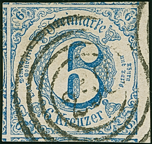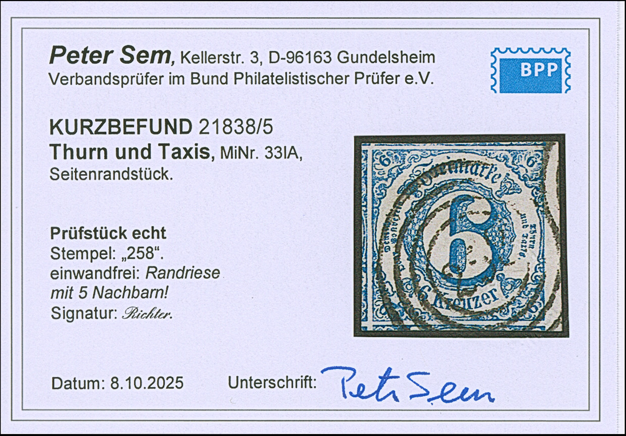 6 Kr. blau, allseits überrandig, mit ca. 2 mm rechtem Bogenrand sowie Teilen aller 5 Nachbarmarken, leicht entwertet durch Nr. "258" MEININGEN. Ein Ausnahmestück. Kurzbefund Sem BPP